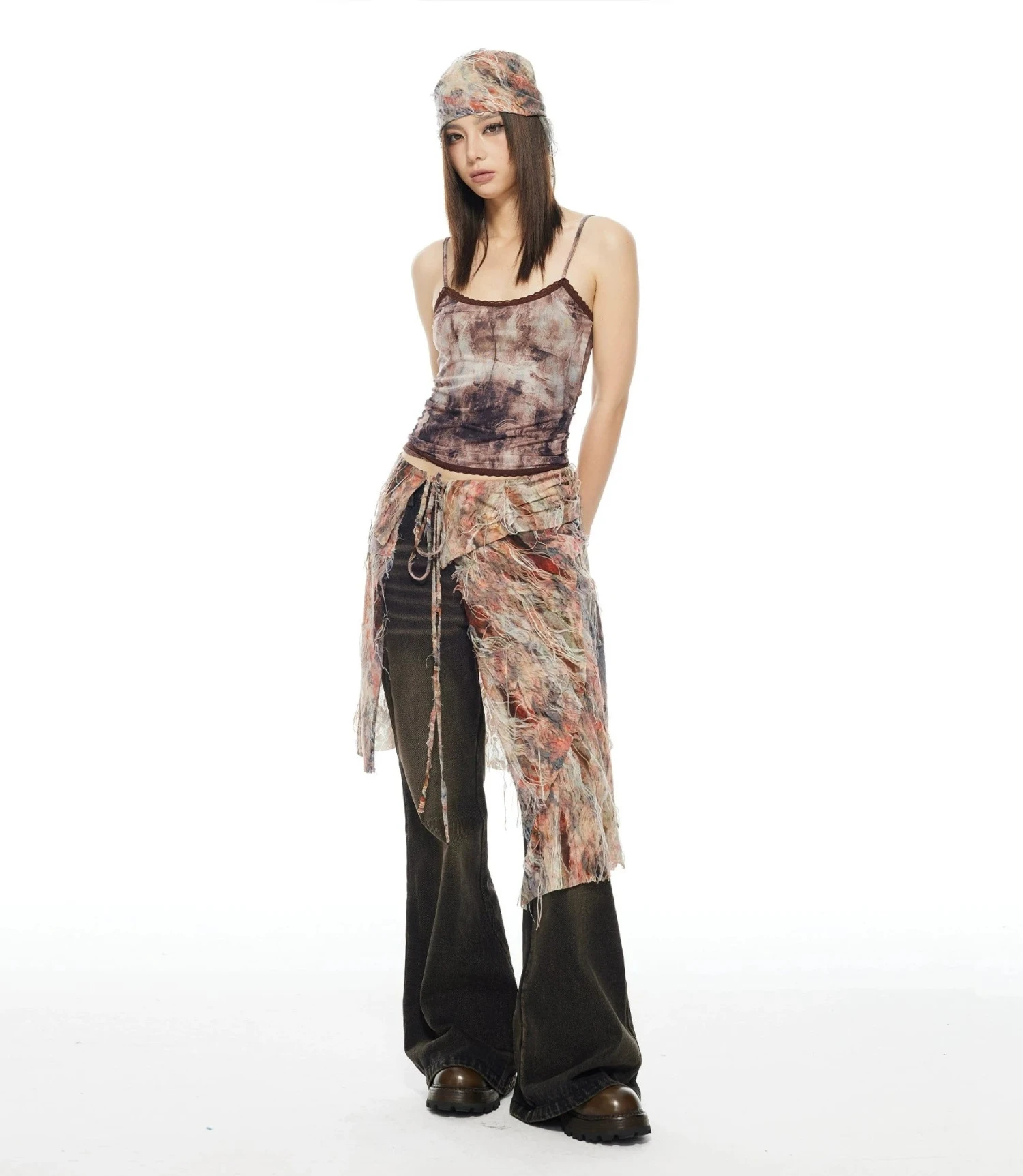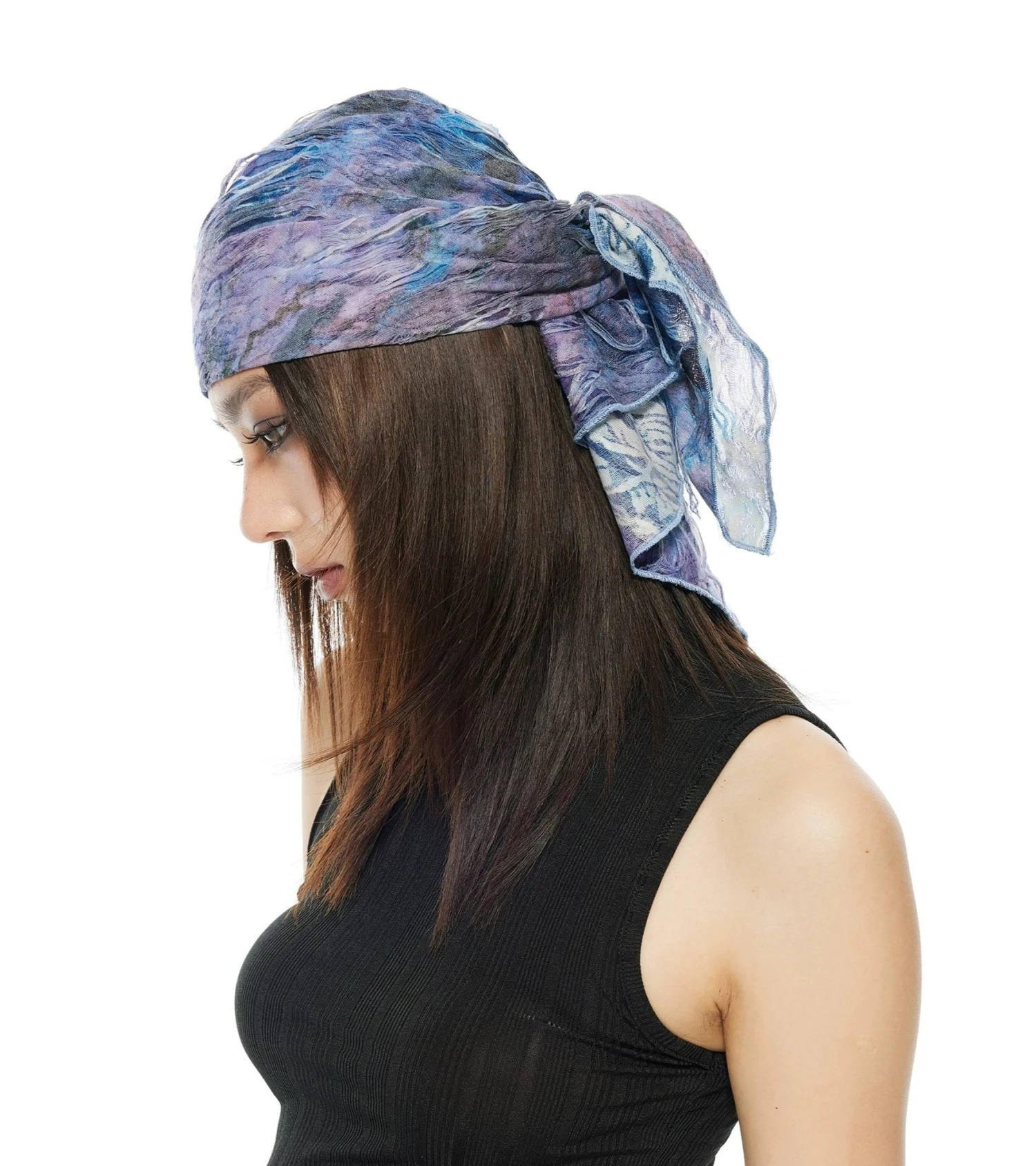 Experience the fusion of edgy allure and versatile functionality with our Abstract Print Distressed Sheer Bandana Headscarf.