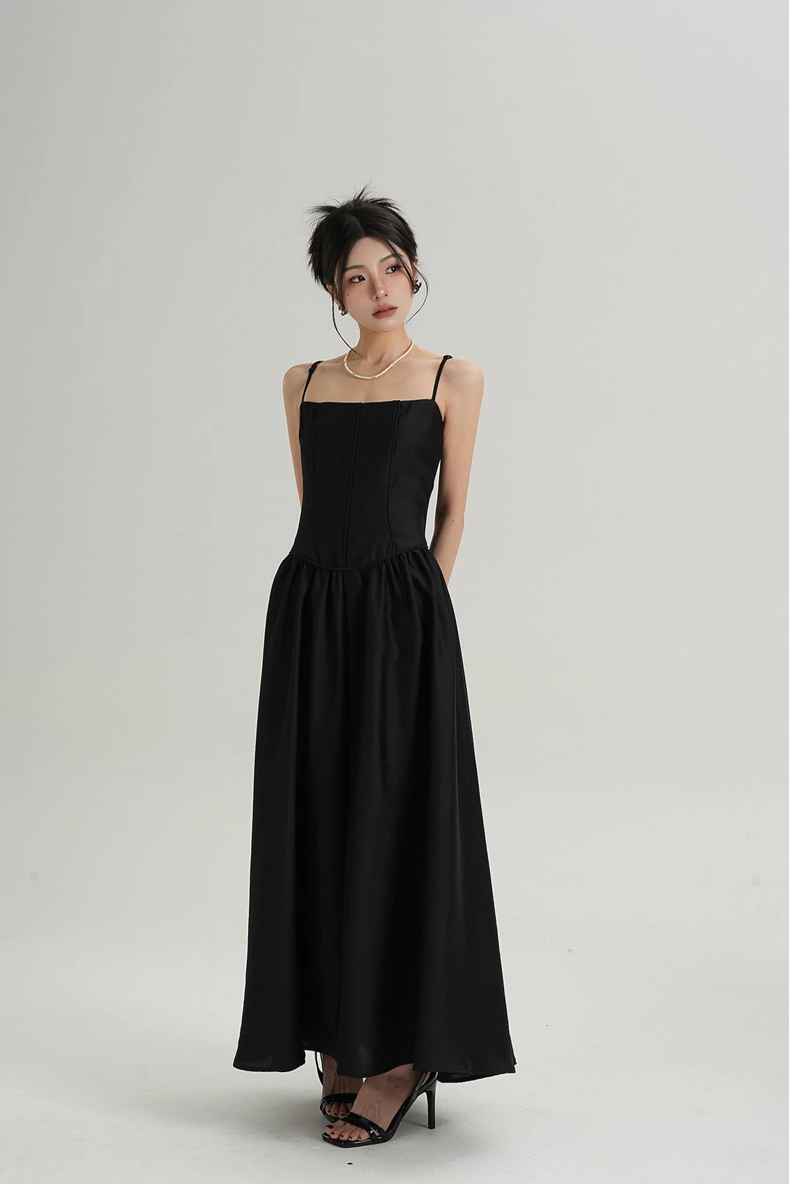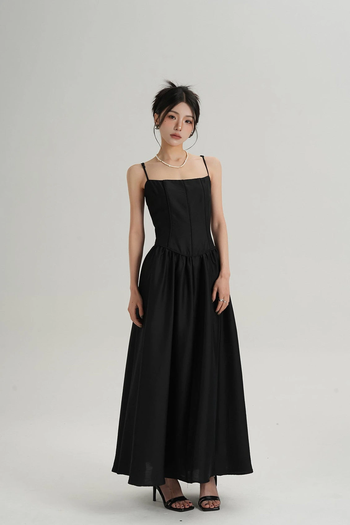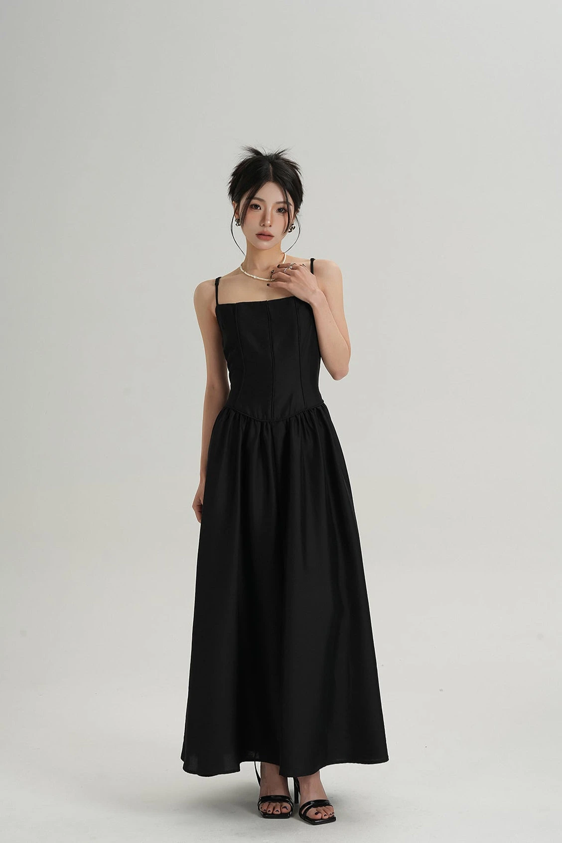 It’s a piece you’ll keep reaching for—simple, but with just enough edge to stand out without trying too hard. Crafted from a non-stretch woven blend, the fabric has a clean, smooth finish that holds the shape of the bodice with subtle structure. Vertical stitch paneling adds quiet detail and dimension, while the gathered A-line skirt flows with relaxed ease.