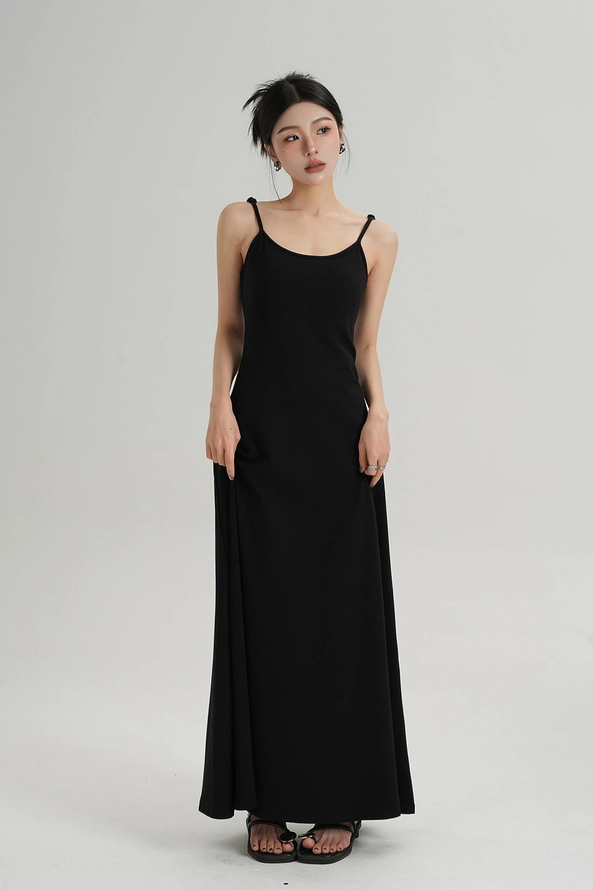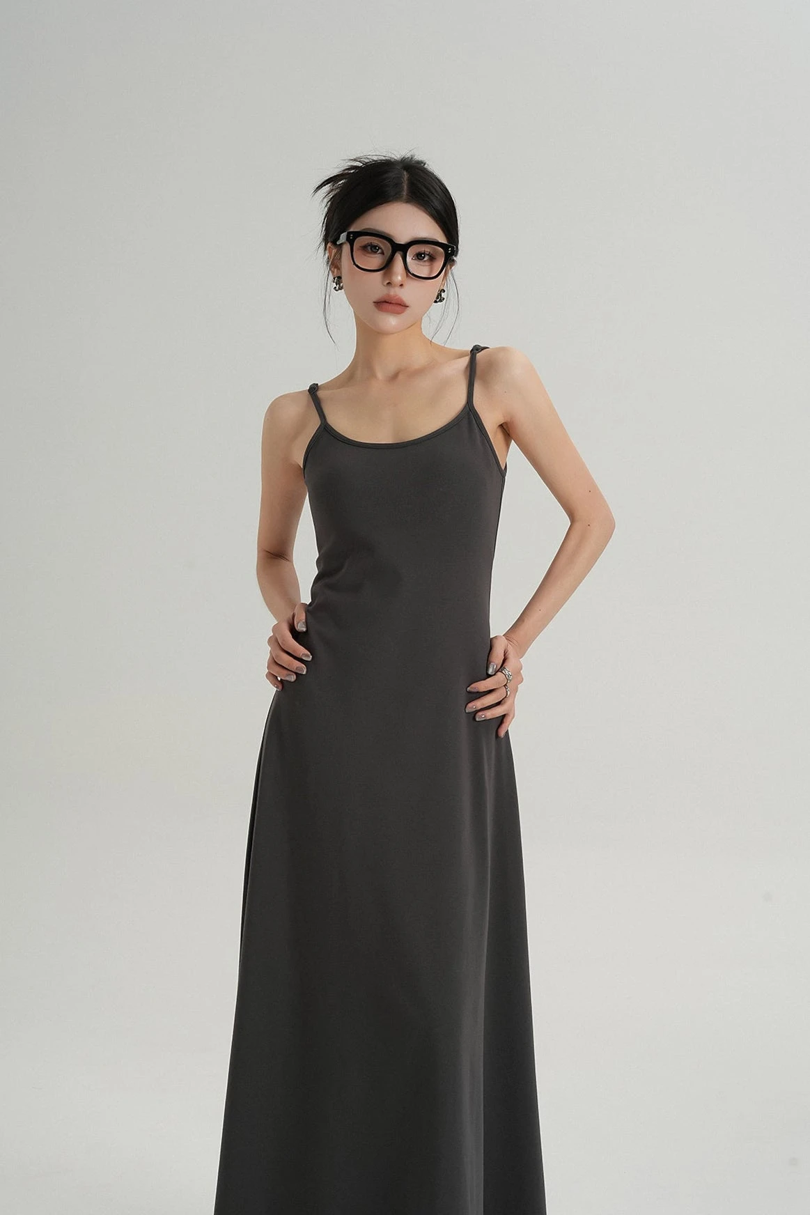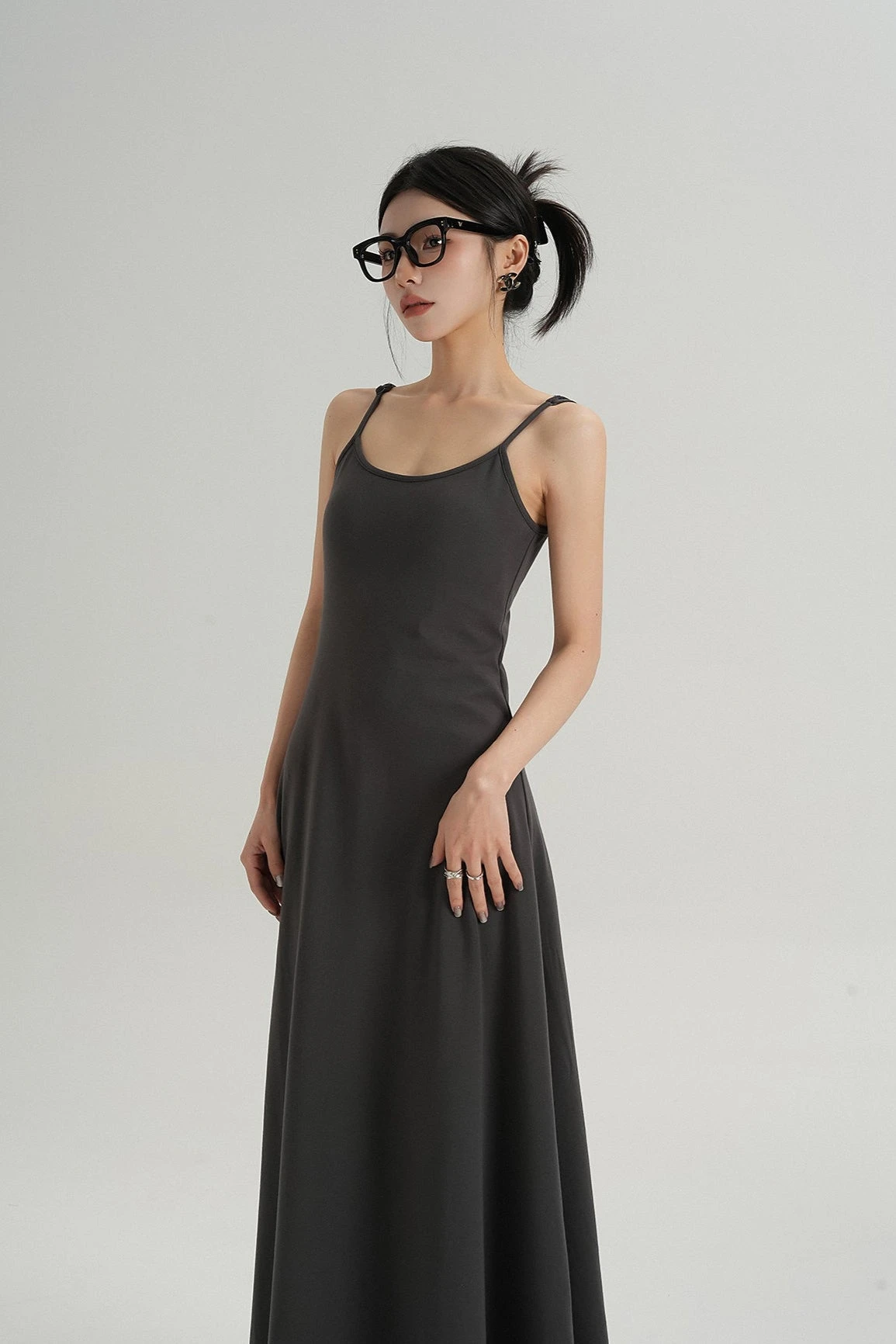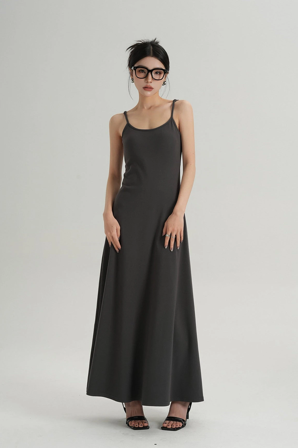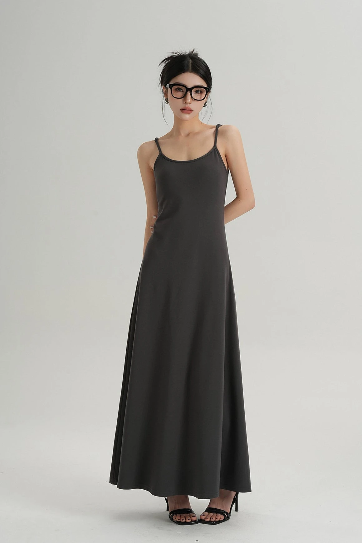 The clean silhouette drapes naturally over the body, accentuating the waist before flowing into a full-length skirt that moves with ease. Crafted from a soft yet structured fabric blend, the dress offers a balance of comfort and shape. The built-in chest lining provides subtle support, eliminating the need for extra layers, while the adjustable straps allow for a customized fit. Its smooth, solid-tone finish makes it a versatile piece—wear it solo for a refined look or layer with an oversized jacket for contrast.