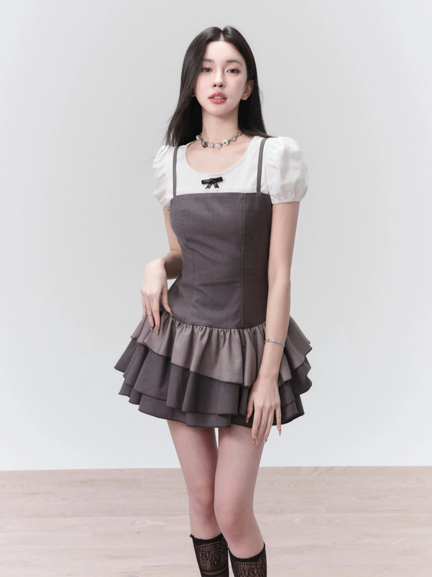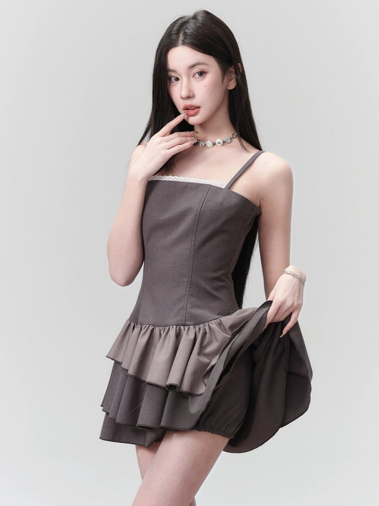 The fitted bodice adds structure, while the subtle color blocking in varying shades of grey keeps the overall look sleek and slightly moody. Crafted from a smooth, wrinkle-resistant fabric with a soft full lining, it’s designed for easy wear without sacrificing detail. The tiered hem adds playful volume, the elastic shirring at the back offers a better fit, and the lace-trimmed square neckline brings a quiet edge.