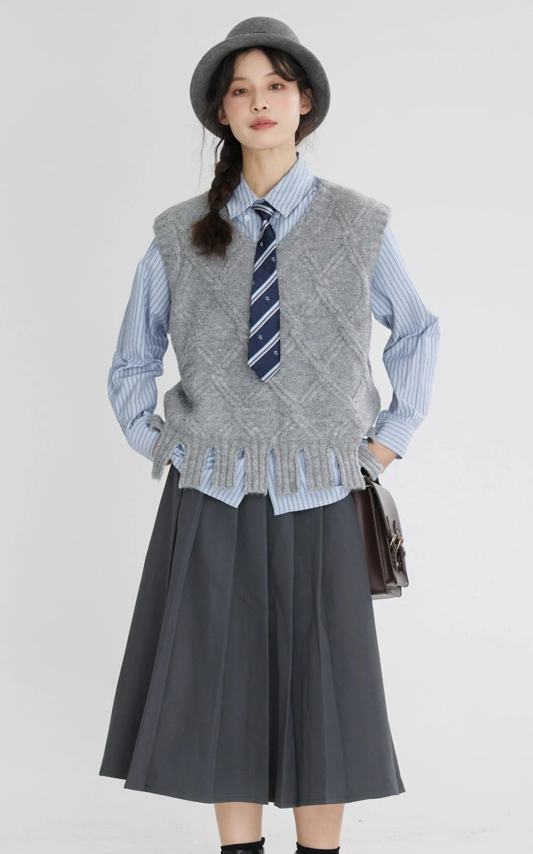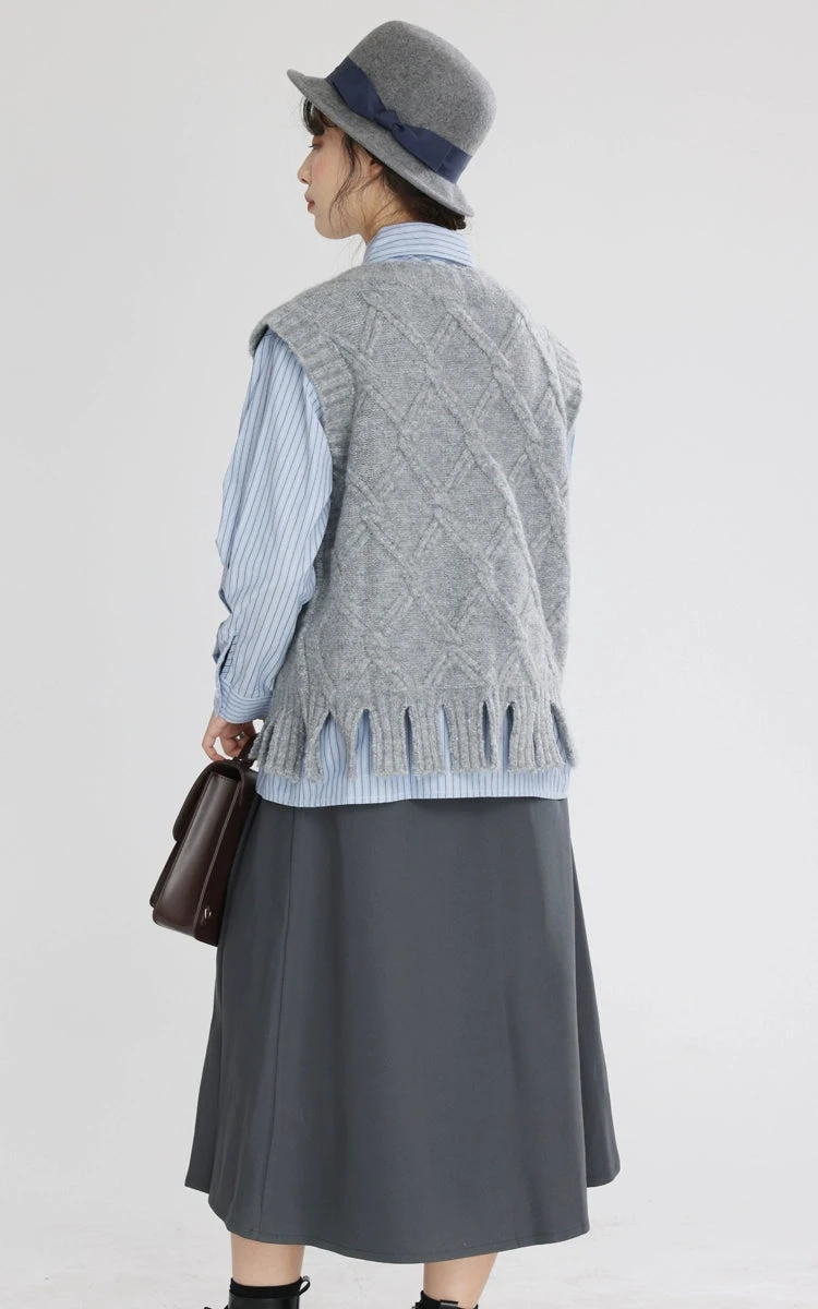 Embrace the transitional seasons with our Argyle Cable Knit Tassel Hem Sweater Vest, a piece that effortlessly balances comfort with collegiate flair.