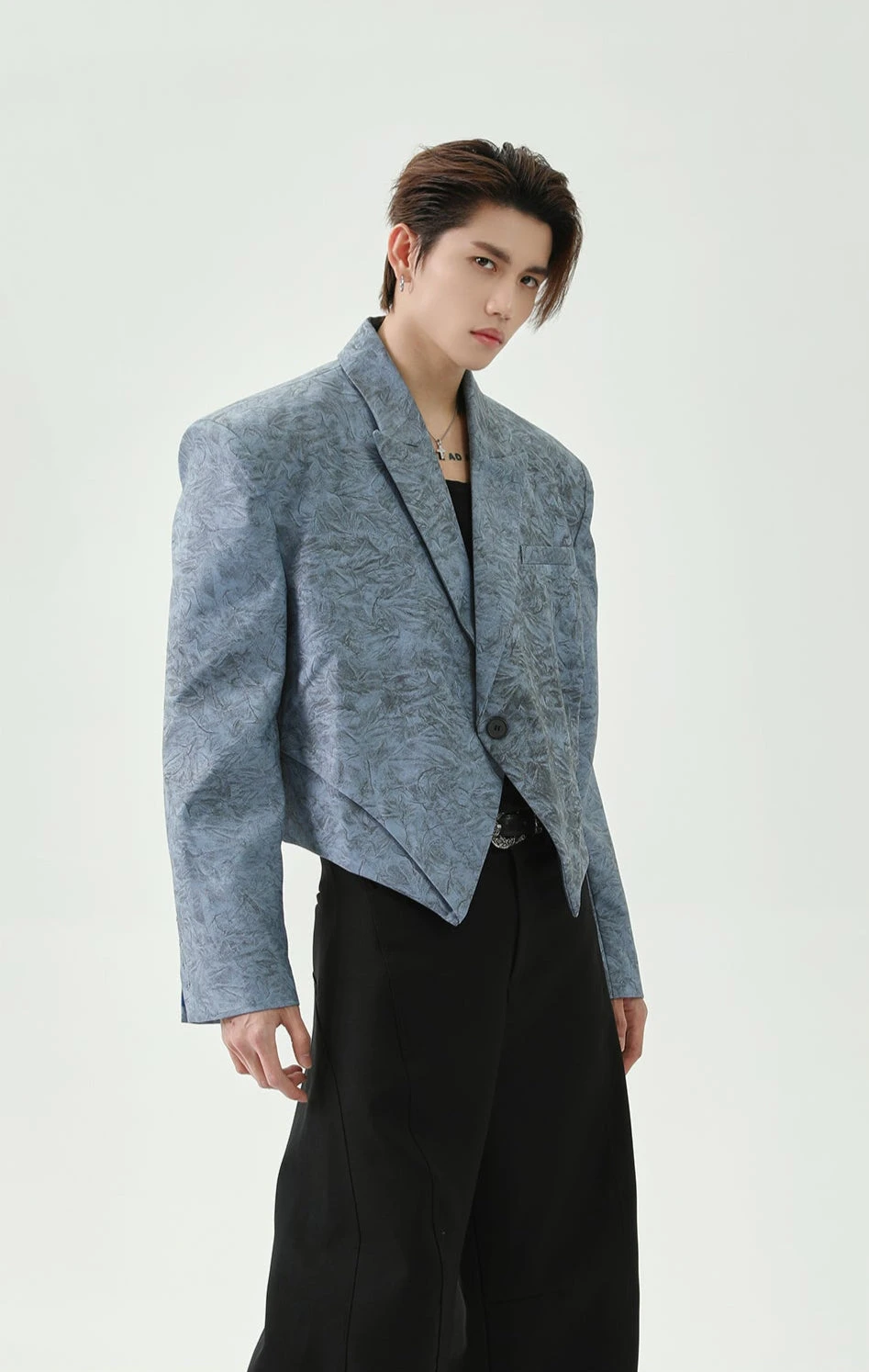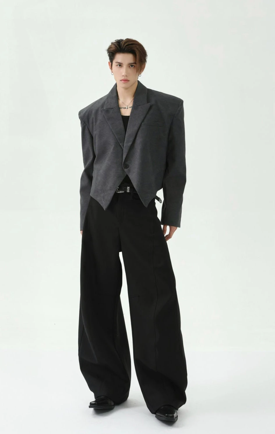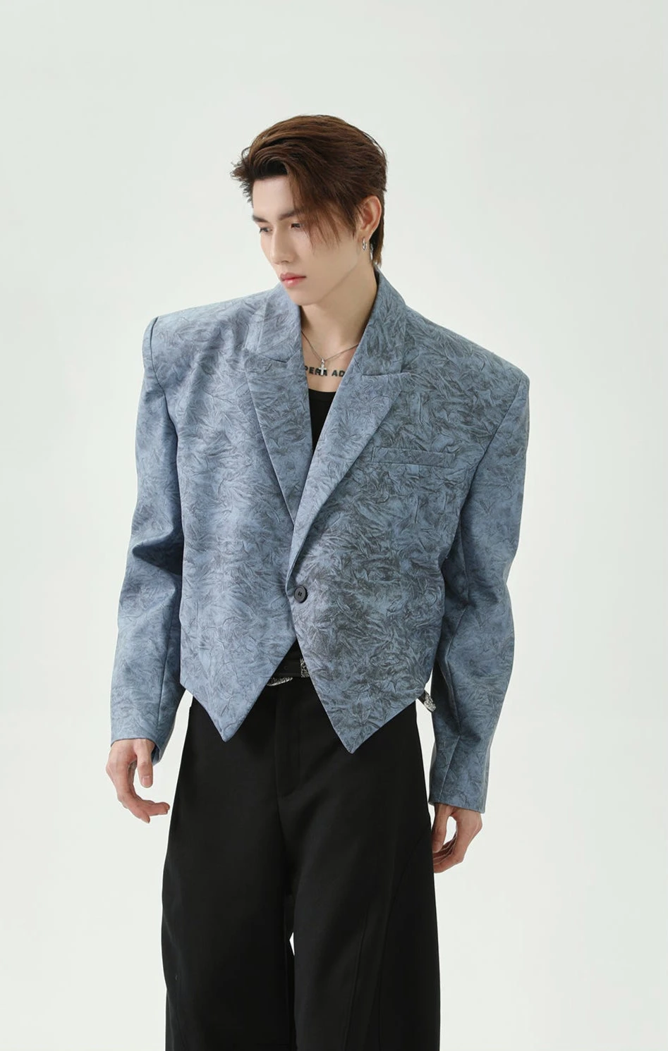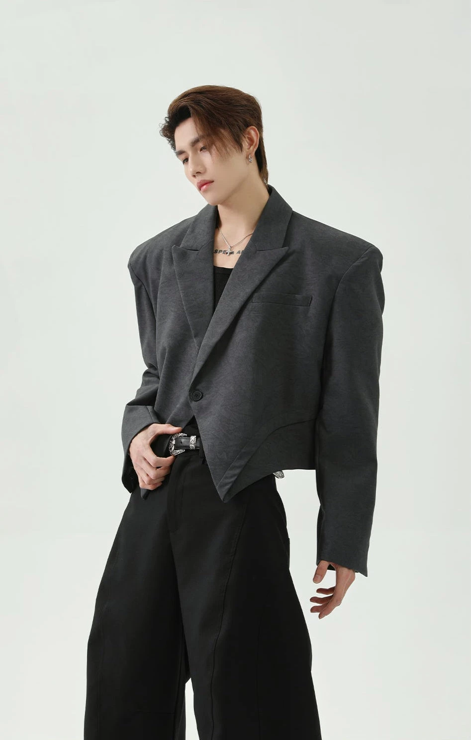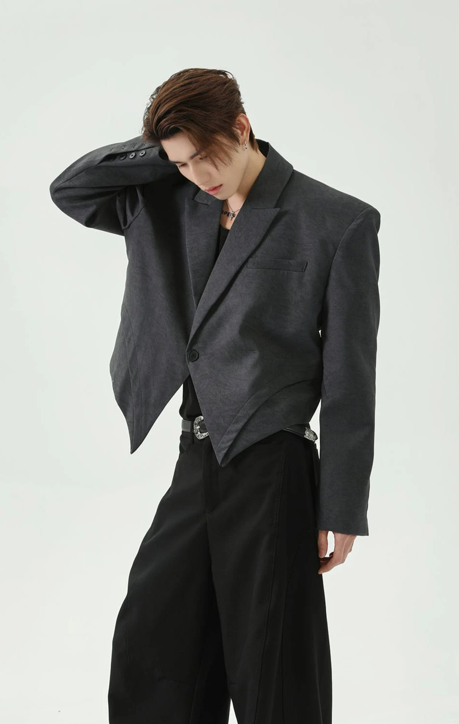 With its structured shoulders, sharp lapel, and asymmetric hem, this single-breasted blazer challenges traditional tailoring while maintaining a polished look.