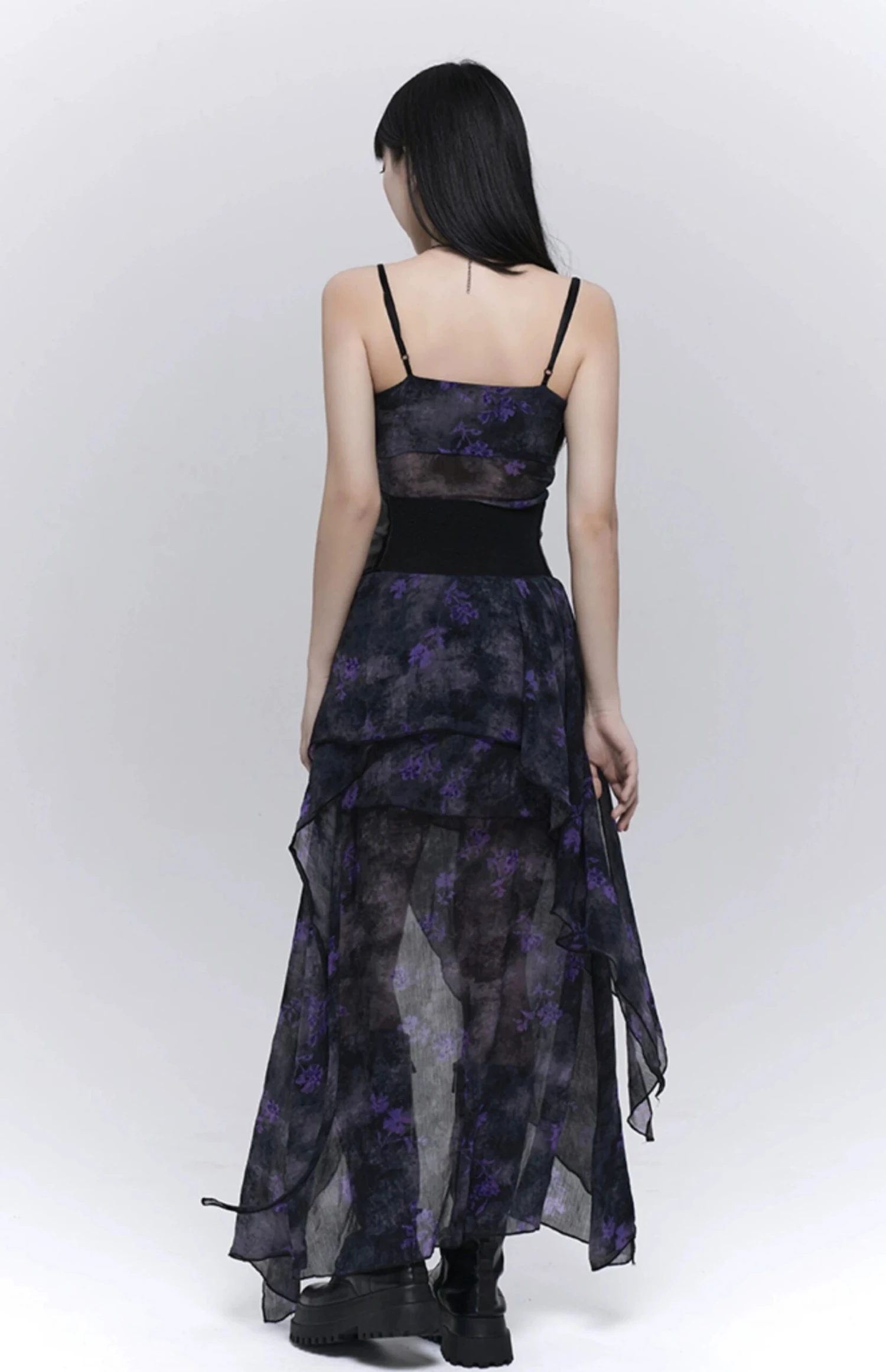 This striking dress features a delicate floral print on a sheer overlay, creating a beautiful contrast with its asymmetric hem. Crafted from 100% polyester fiber, it is both comfortable and durable. The V-neckline and adjustable straps tailor to a perfect fit, while the slip dress design offers a nonchalant charm.