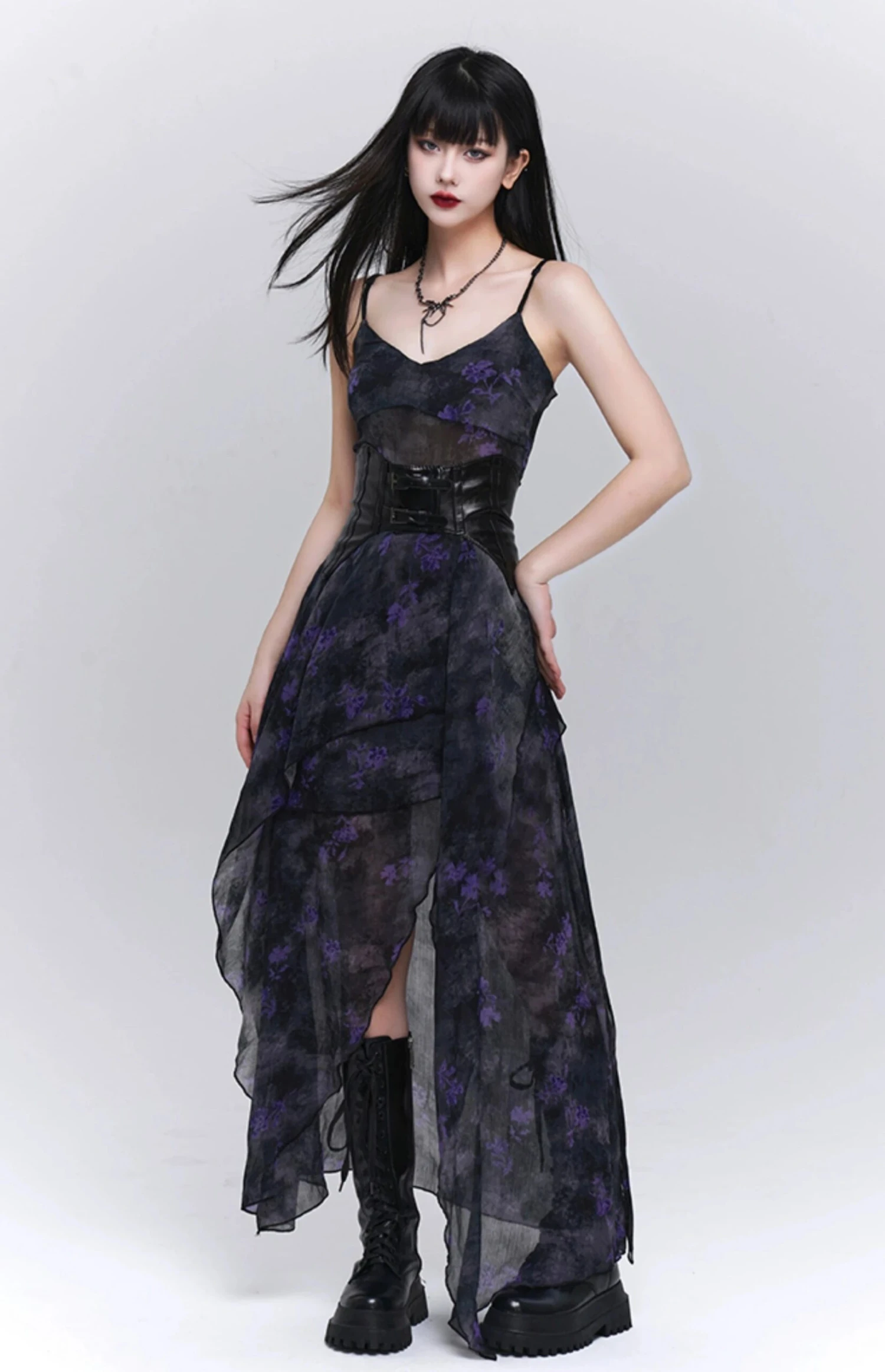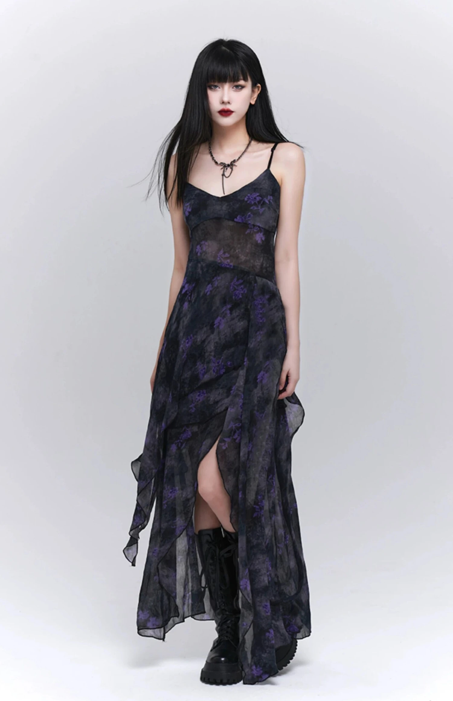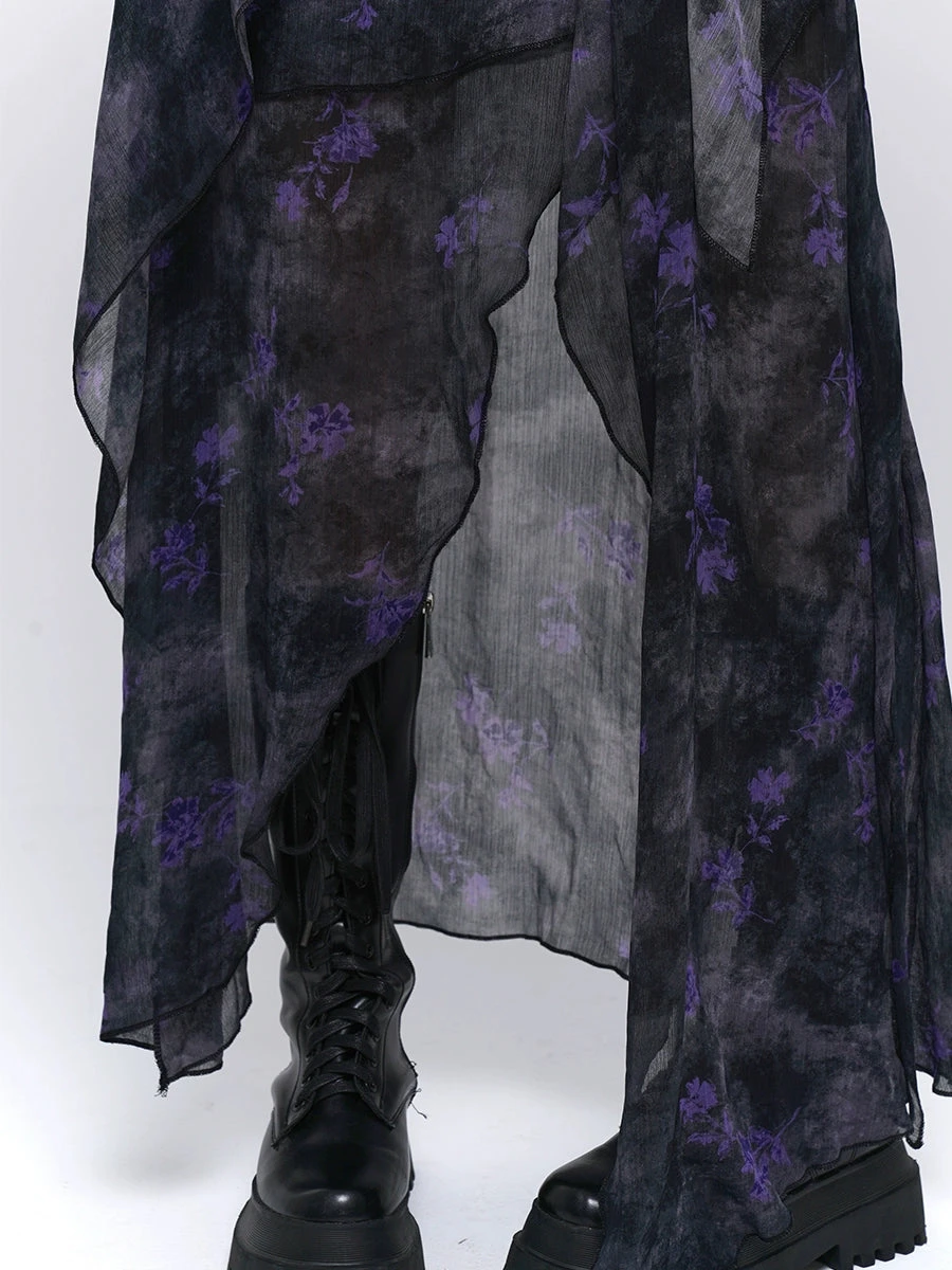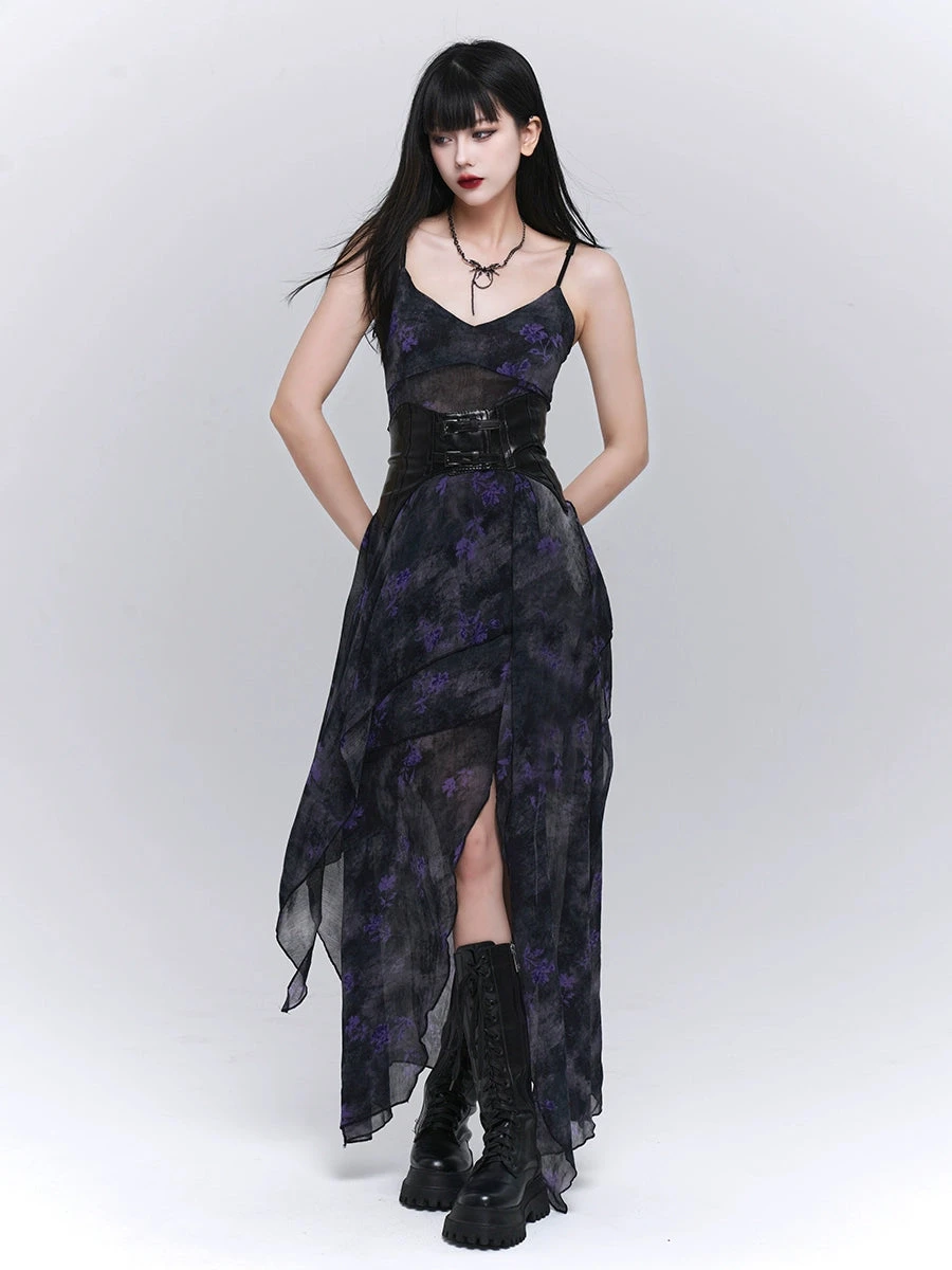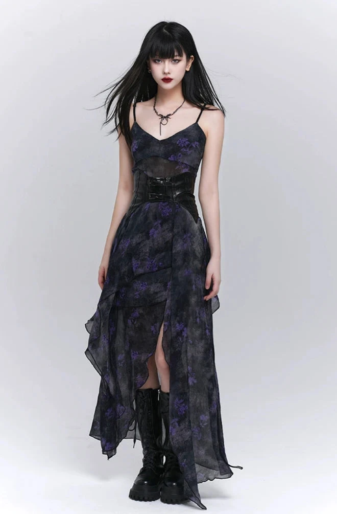 Make a statement in the Asymmetric Hem Floral Sheer Overlay Dress, where edgy meets elegance.