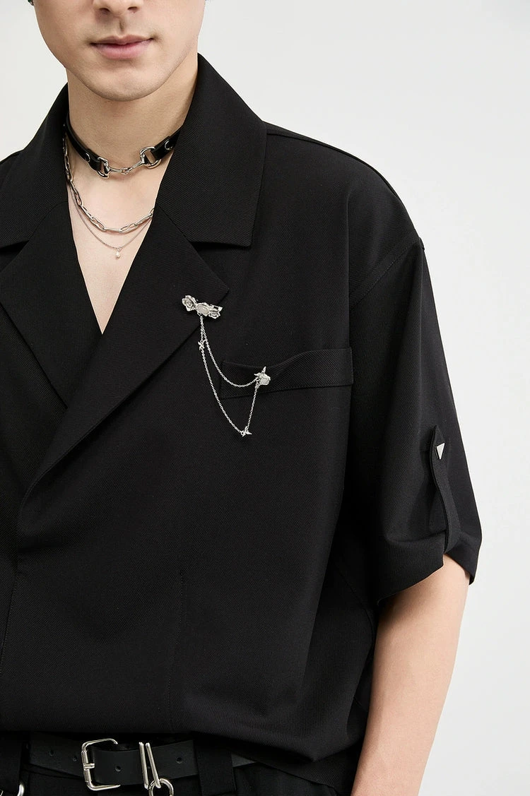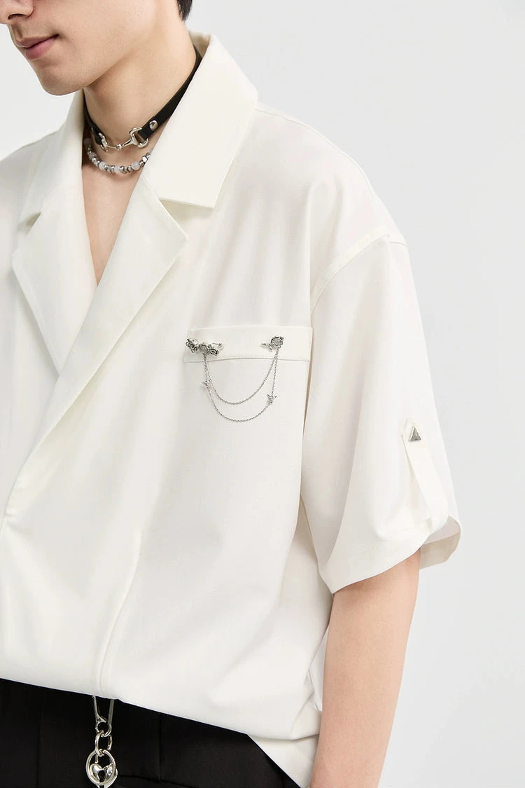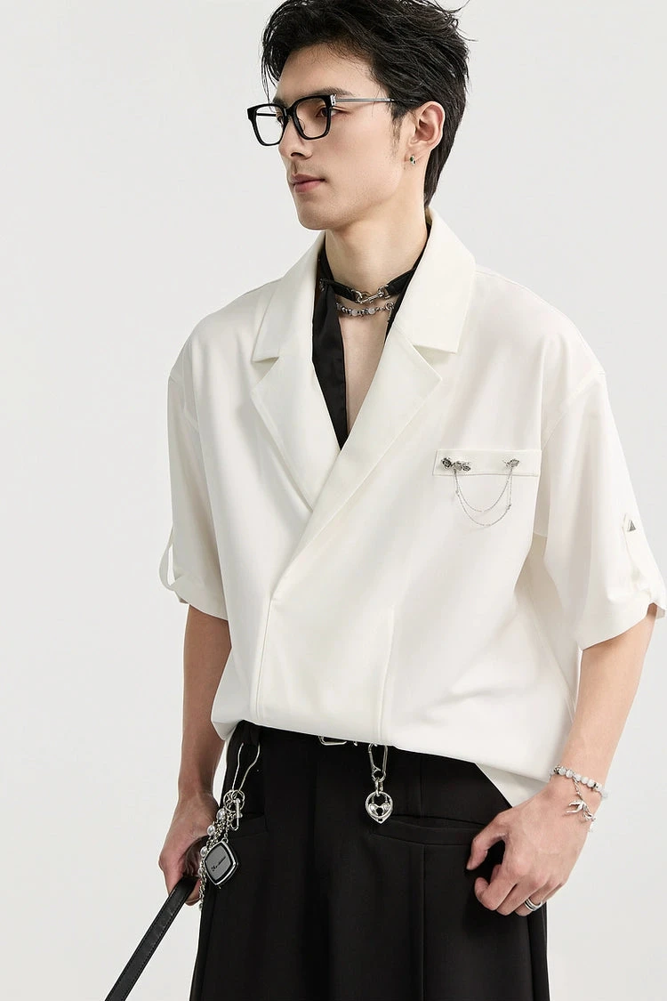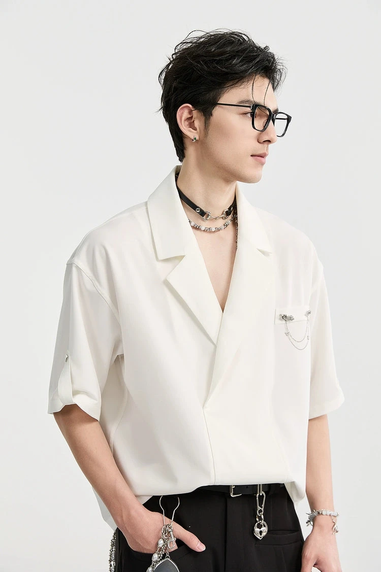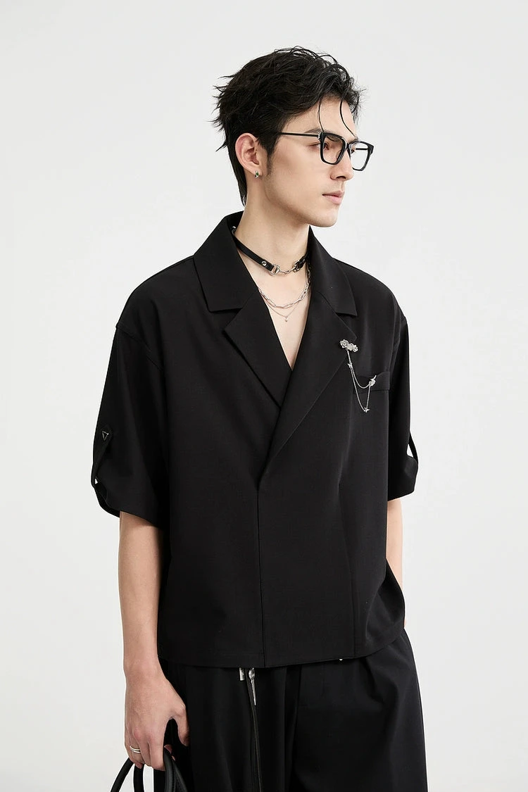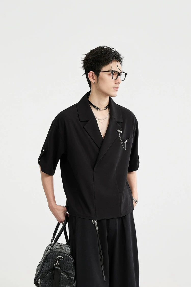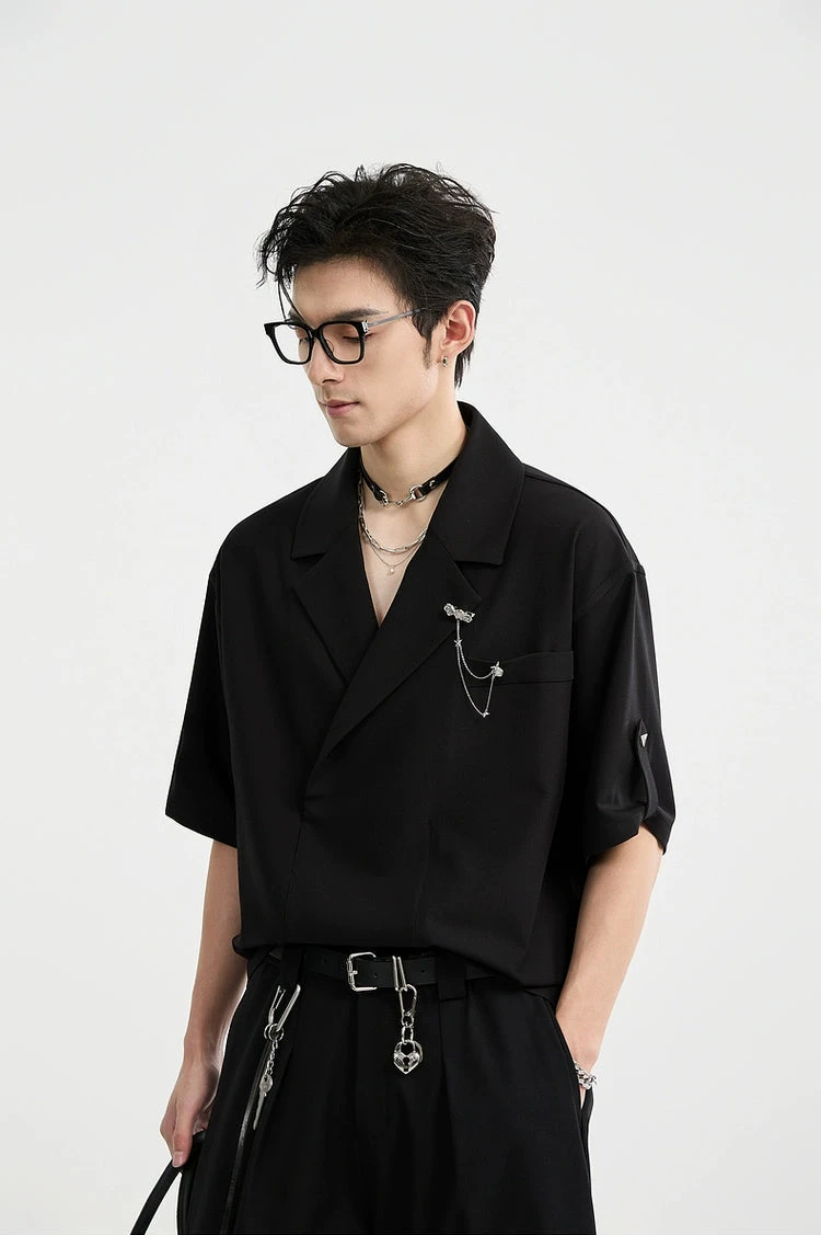 An effortless balance between statement and subtle, this Asymmetric Lapel Short Sleeve Shirt brings forward a modern structure with a standout chain brooch detail that draws the eye without trying too hard.