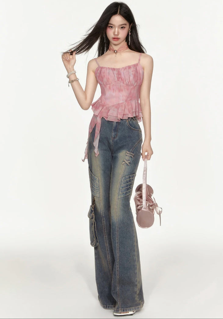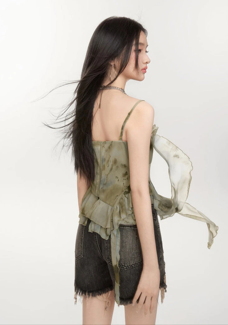 The flowing ruffle hem and tie-dye chiffon fabric add a soft edge, while the structured pleating at the bust gives a subtle shape-enhancing effect. Designed with adjustable spaghetti straps for a customizable fit, this lightweight top moves effortlessly from day to night.