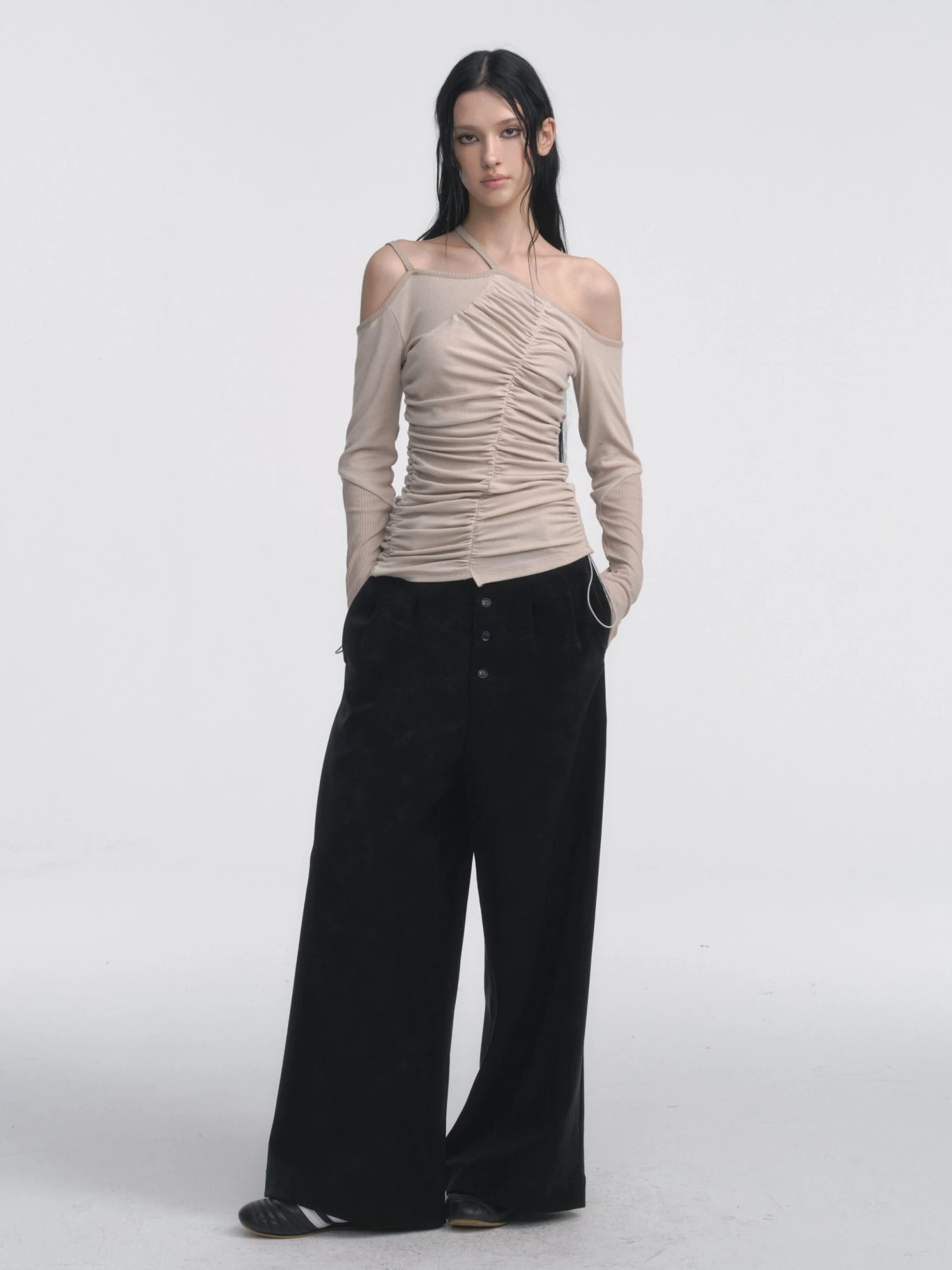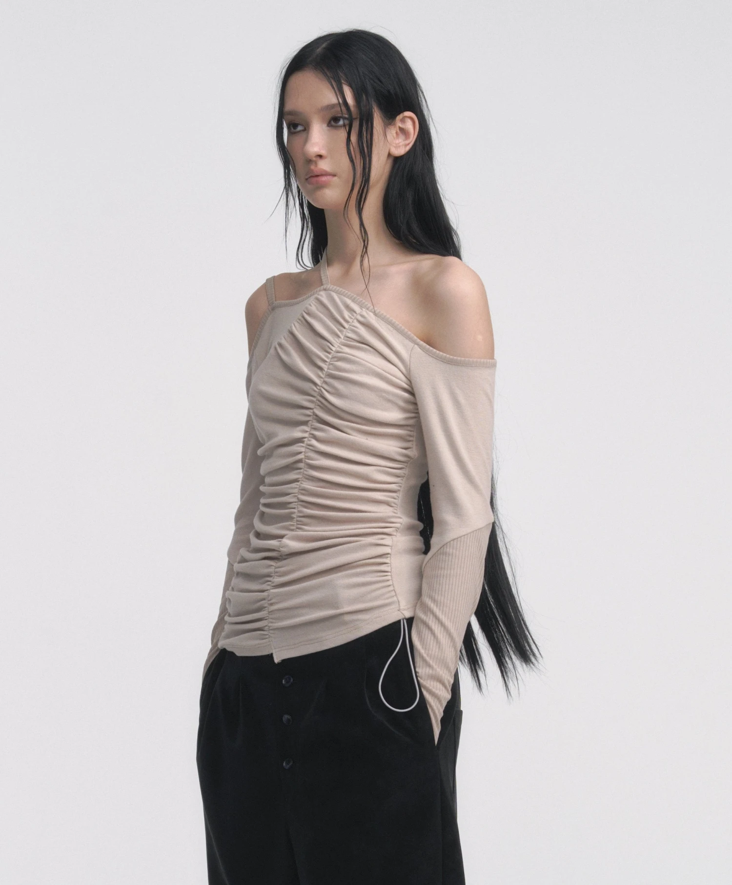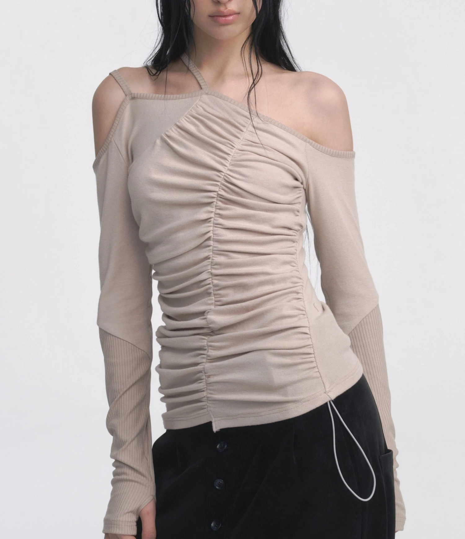 Designed with a striking asymmetric cut and off-shoulder silhouette, this ruched long-sleeve top effortlessly blends structure with an undone edge.