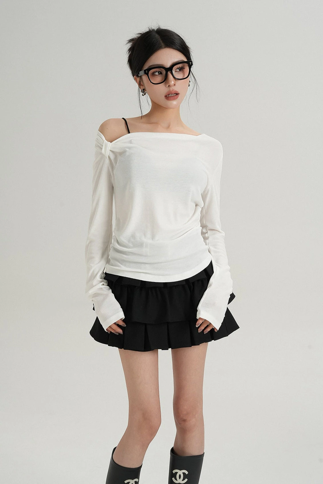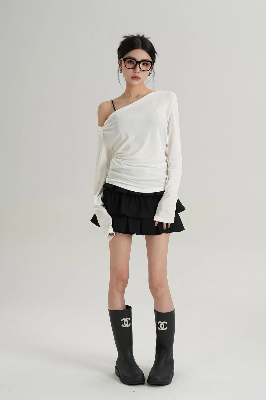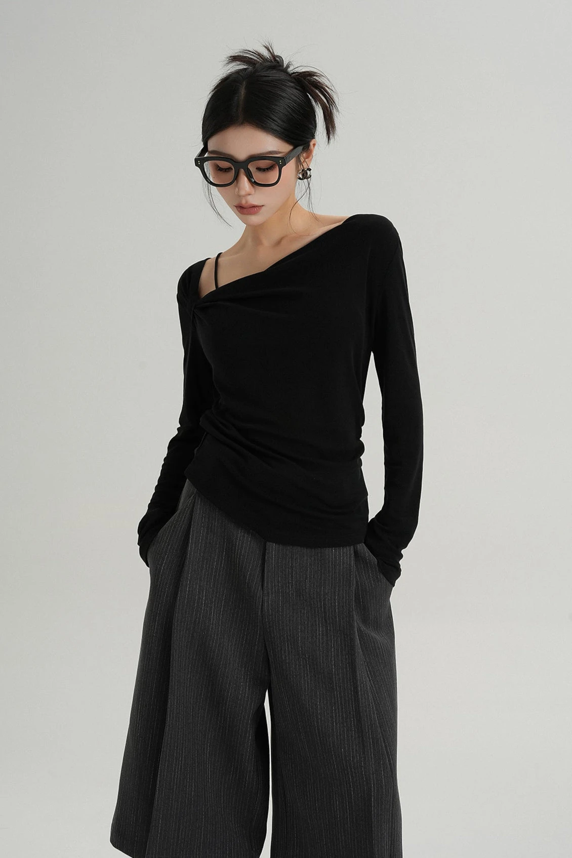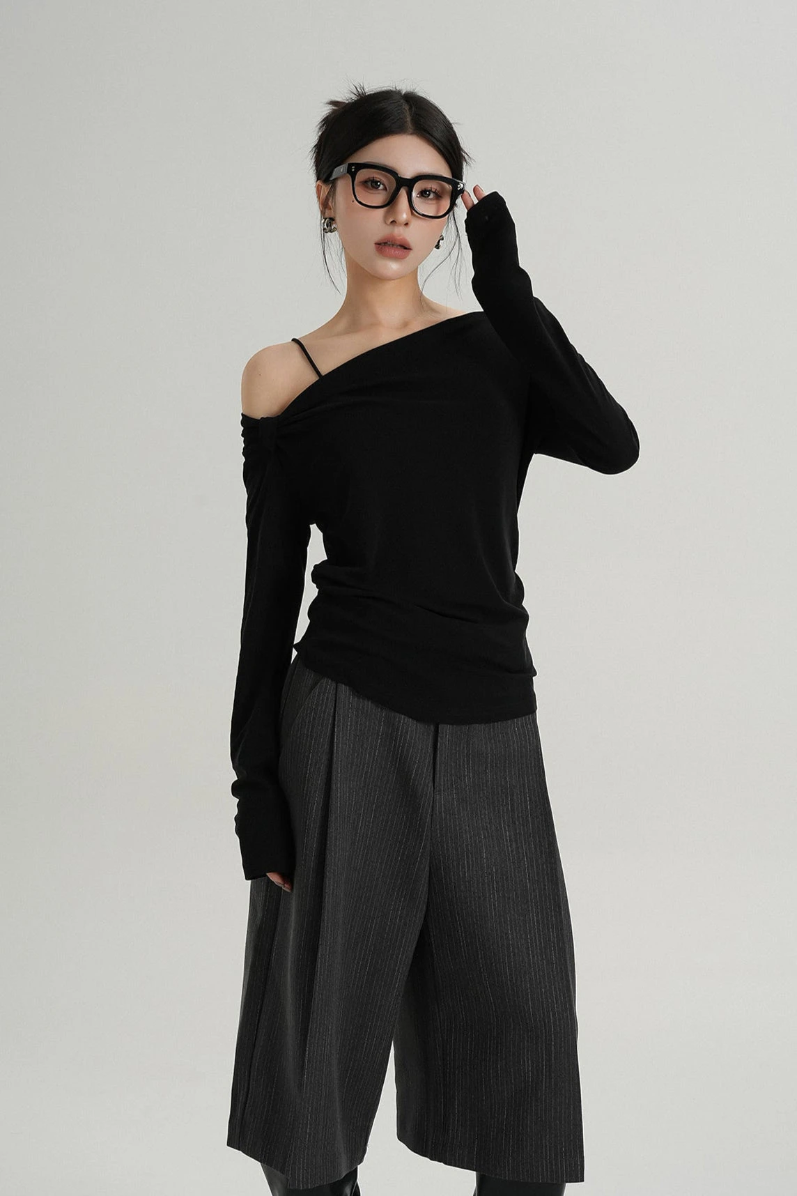 The asymmetric neckline of this single-strap, off-shoulder top instantly sets it apart—it feels intentionally undone while keeping a clean, modern edge.