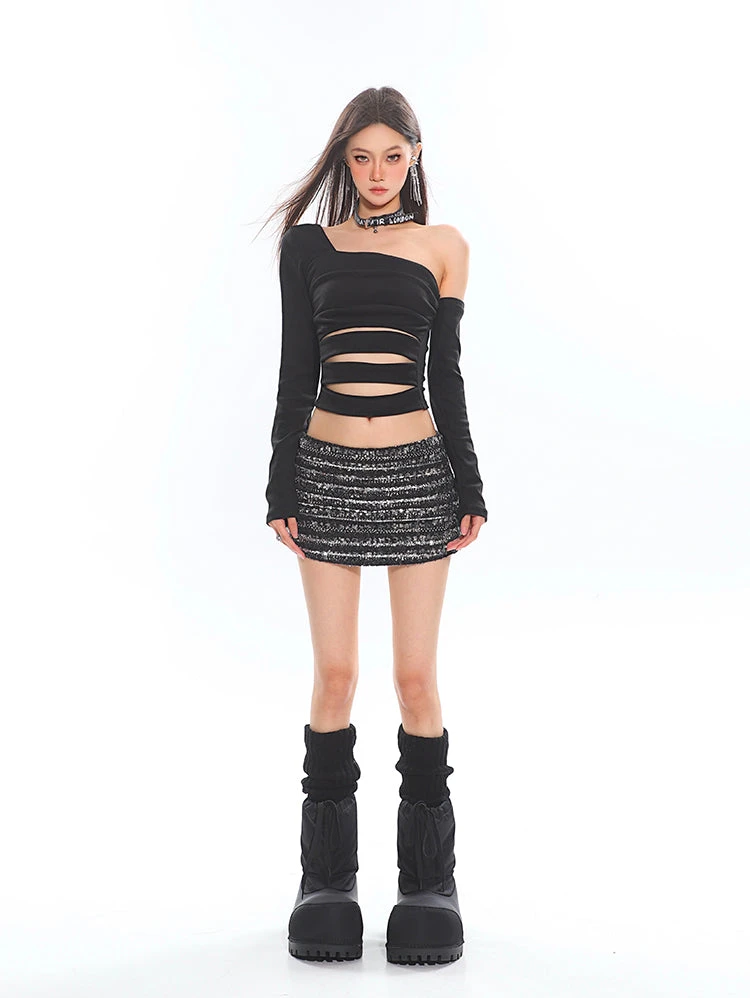 Its statement asymmetrical sleeve design and edgy cutout details make it a standout addition to any wardrobe. Crafted from a form-fitting, medium-weight fabric, this top ensures both comfort and a sleek silhouette. The subtle ruching enhances texture and adds visual interest, complementing the bold cutouts across the torso.