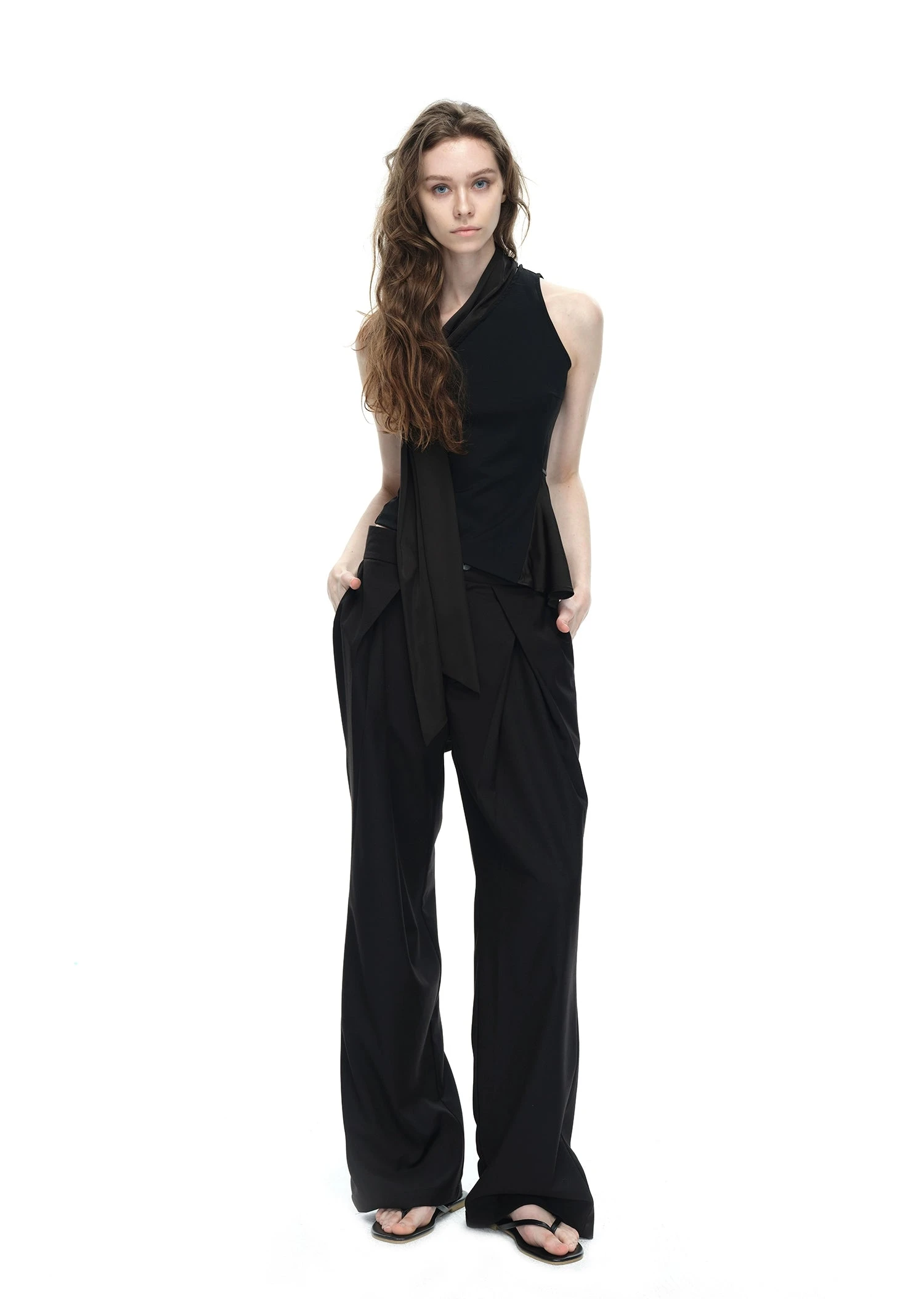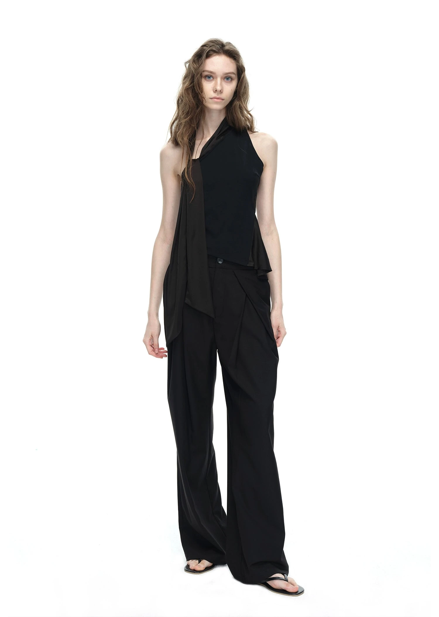 Elevate your wardrobe with this sleek asymmetrical halter neck top, highlighted by a sophisticated side ruffle and detachable tie detail.