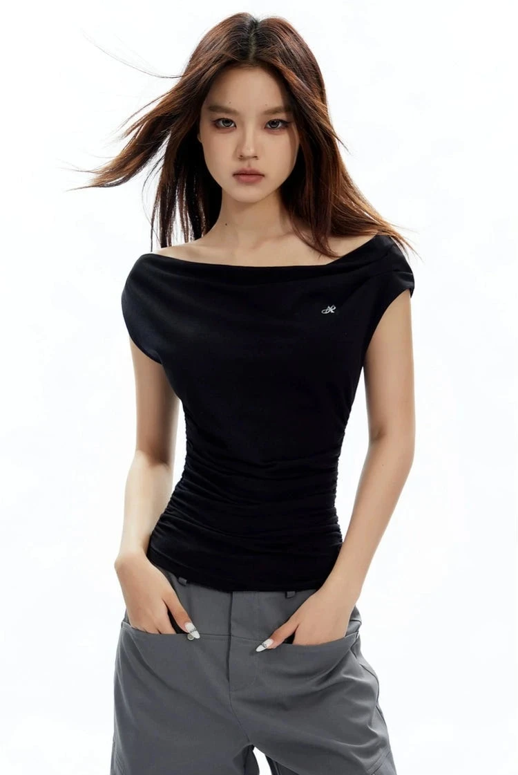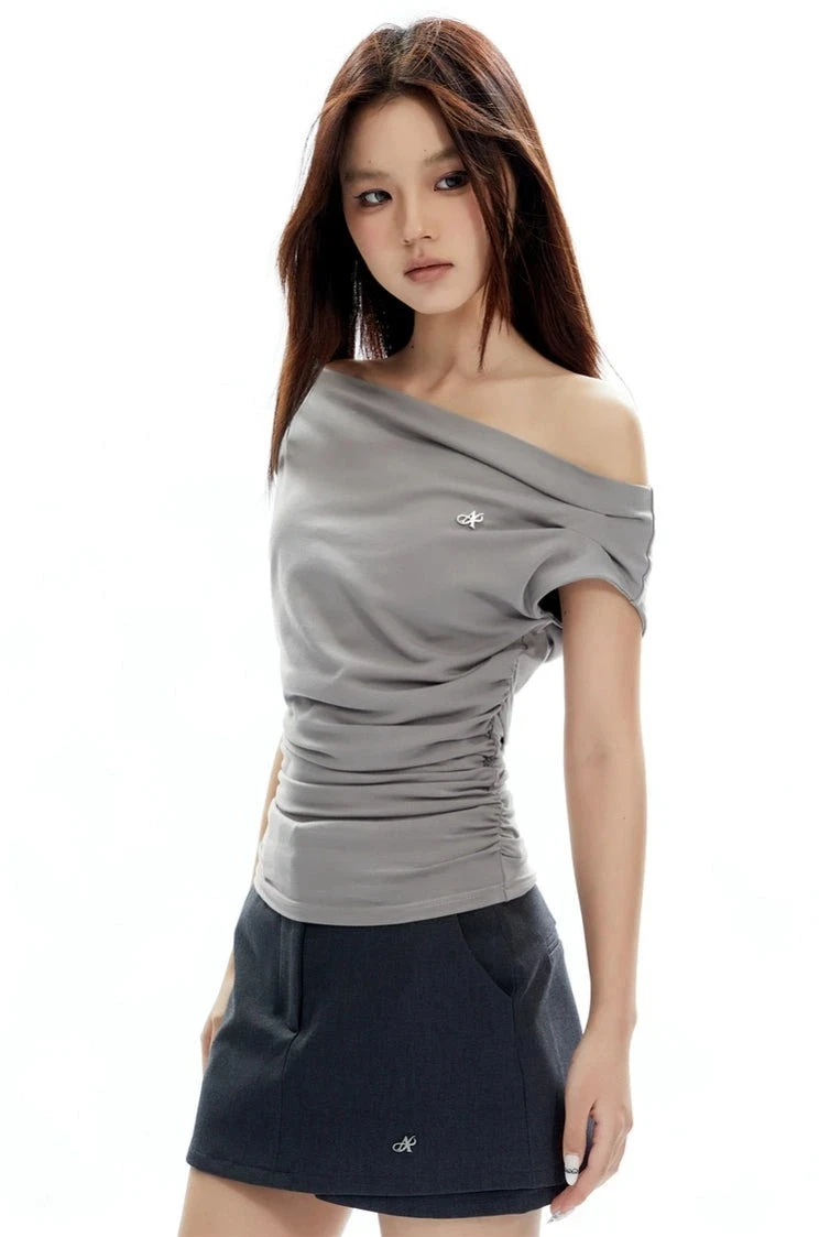 Make a statement in our Asymmetrical Neckline Ruched Jersey Top, where elegance meets nonconformity.