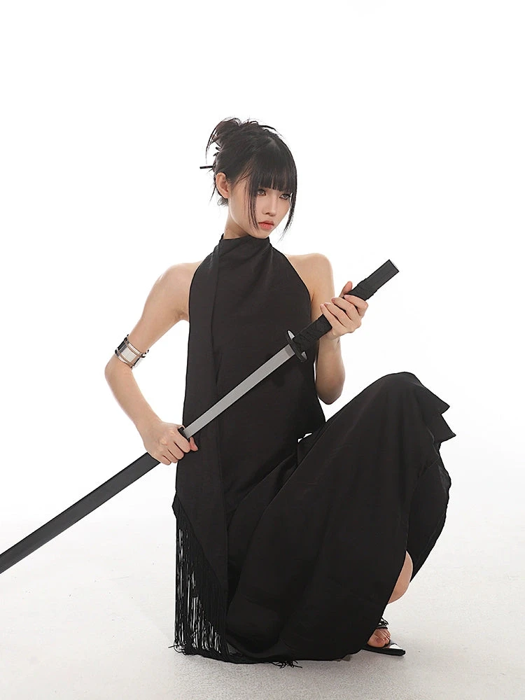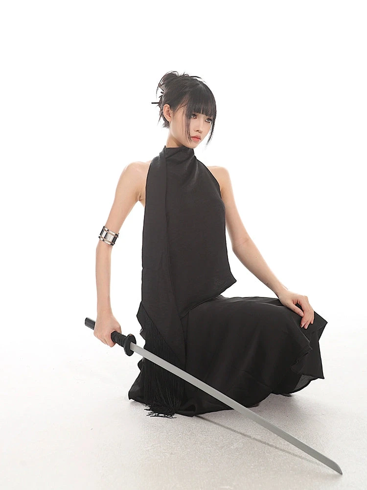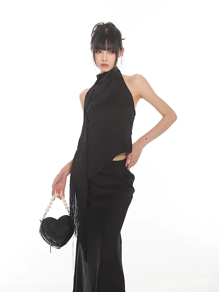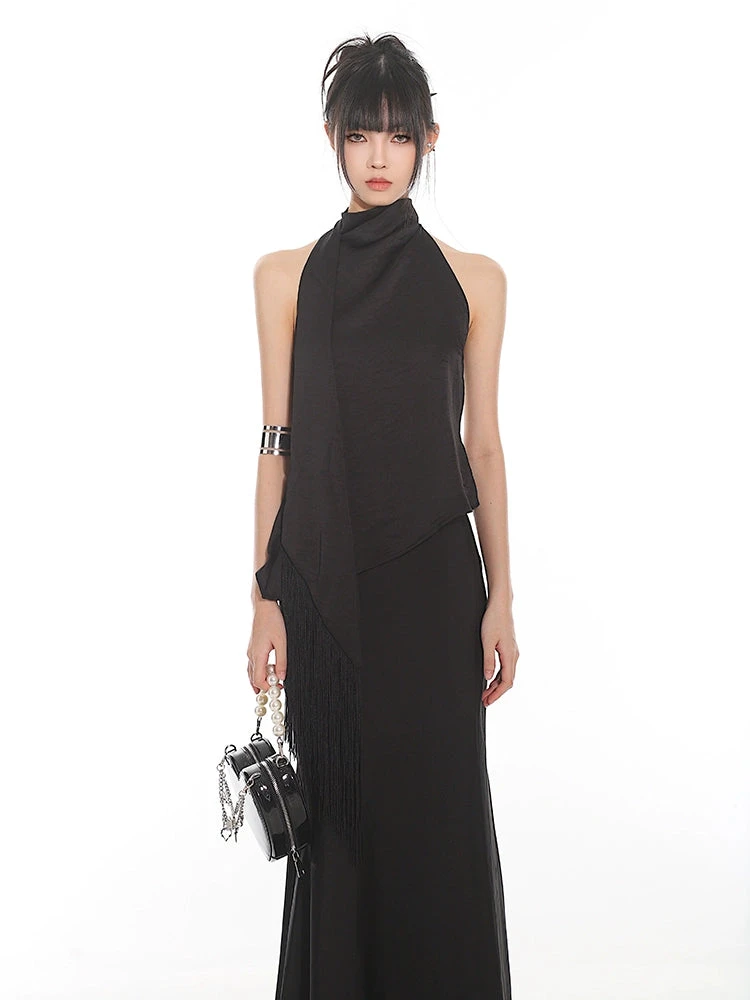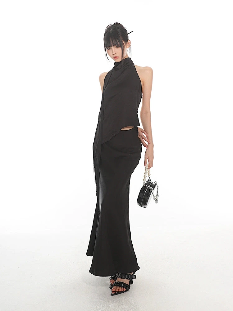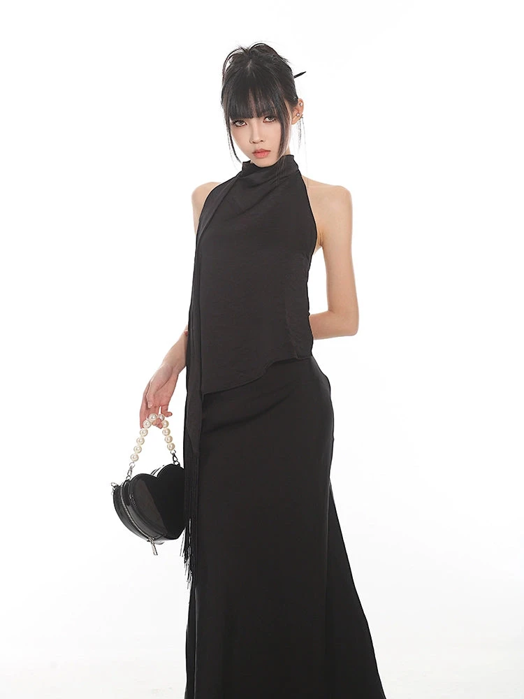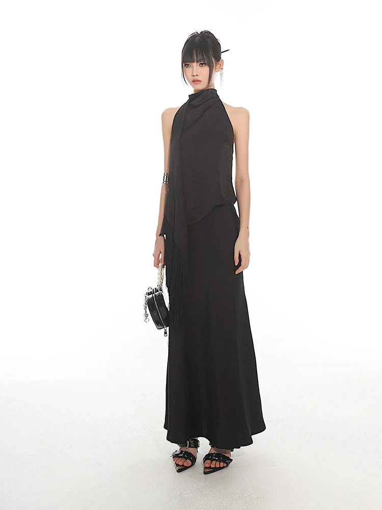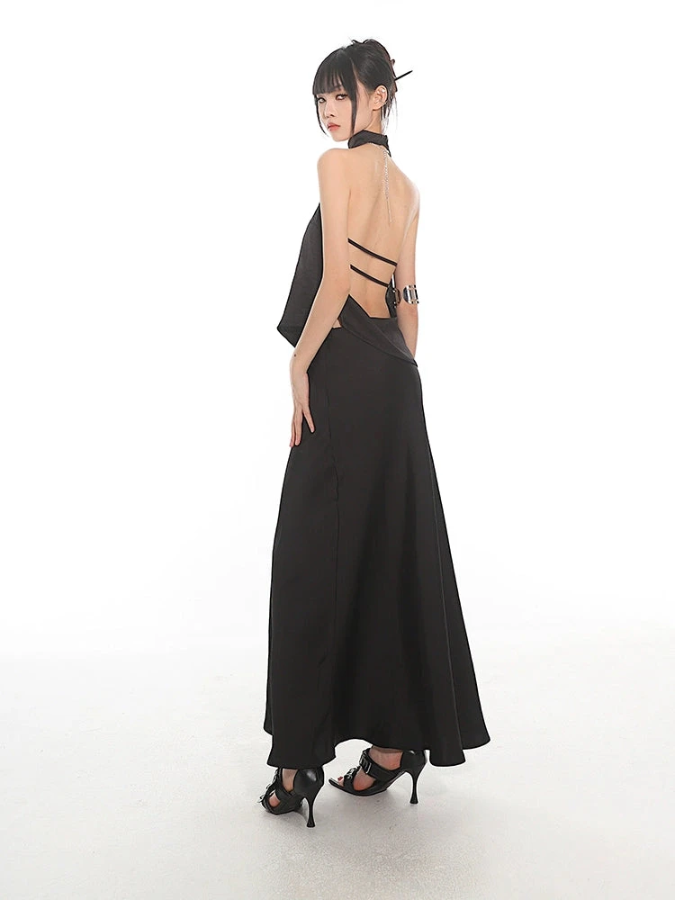 Embrace an air of sophistication with our Backless Halter Neck Top and Flare Maxi Skirt Two-Piece Set, where elegance meets a hint of daring.