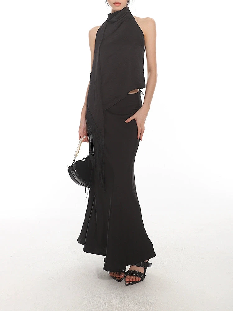 Made for those who prefer their style with a touch of drama, this two-piece ensemble stands out with its sleek backless design and soft satin finish. The halter neck top paired with the flowing fish-tail cut skirt creates a harmonious balance of boldness and grace, perfect for making a striking statement.