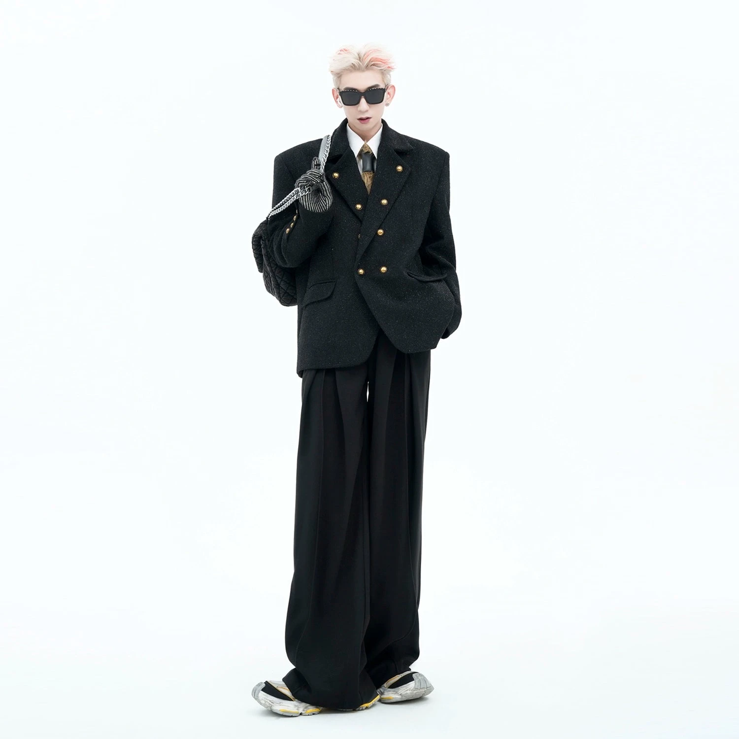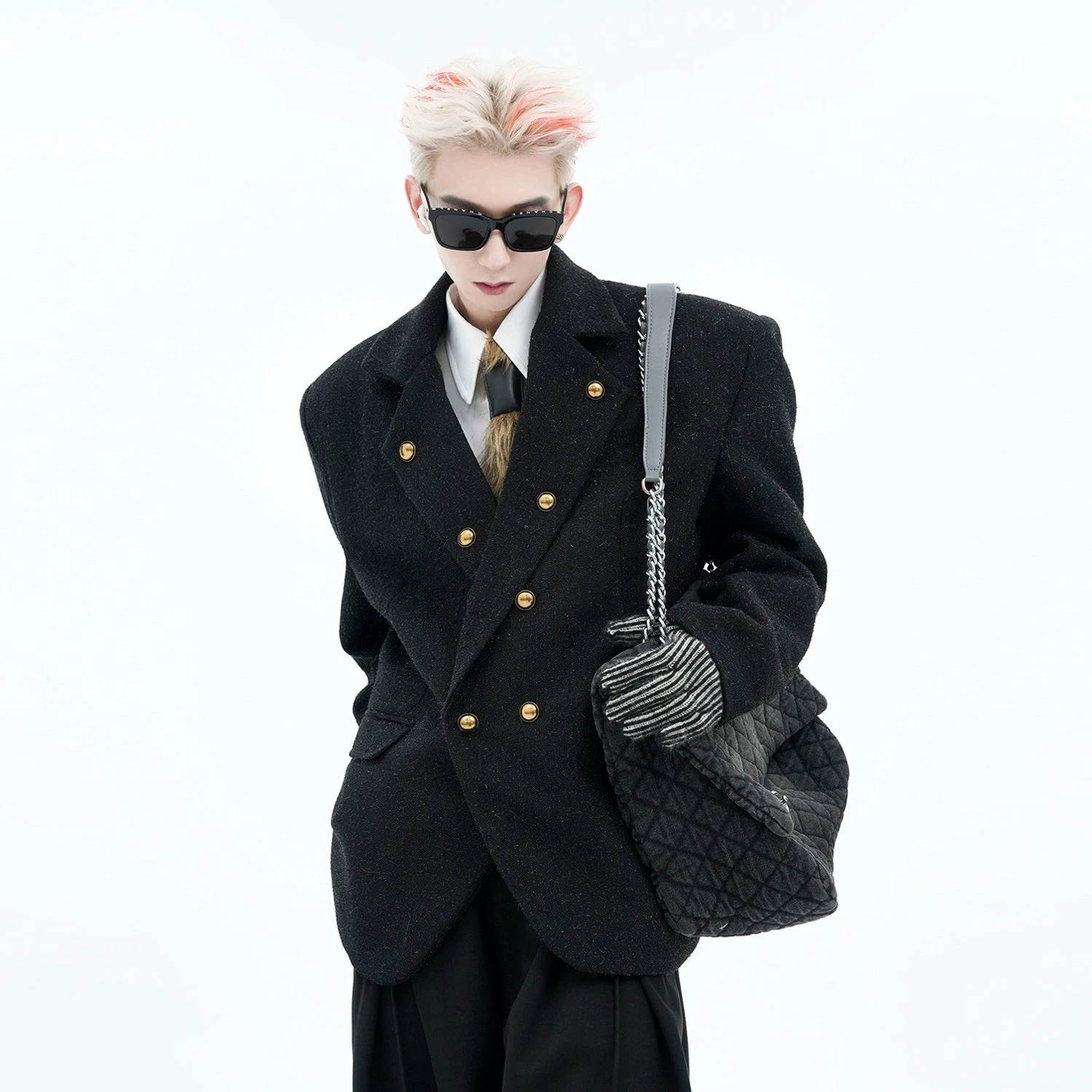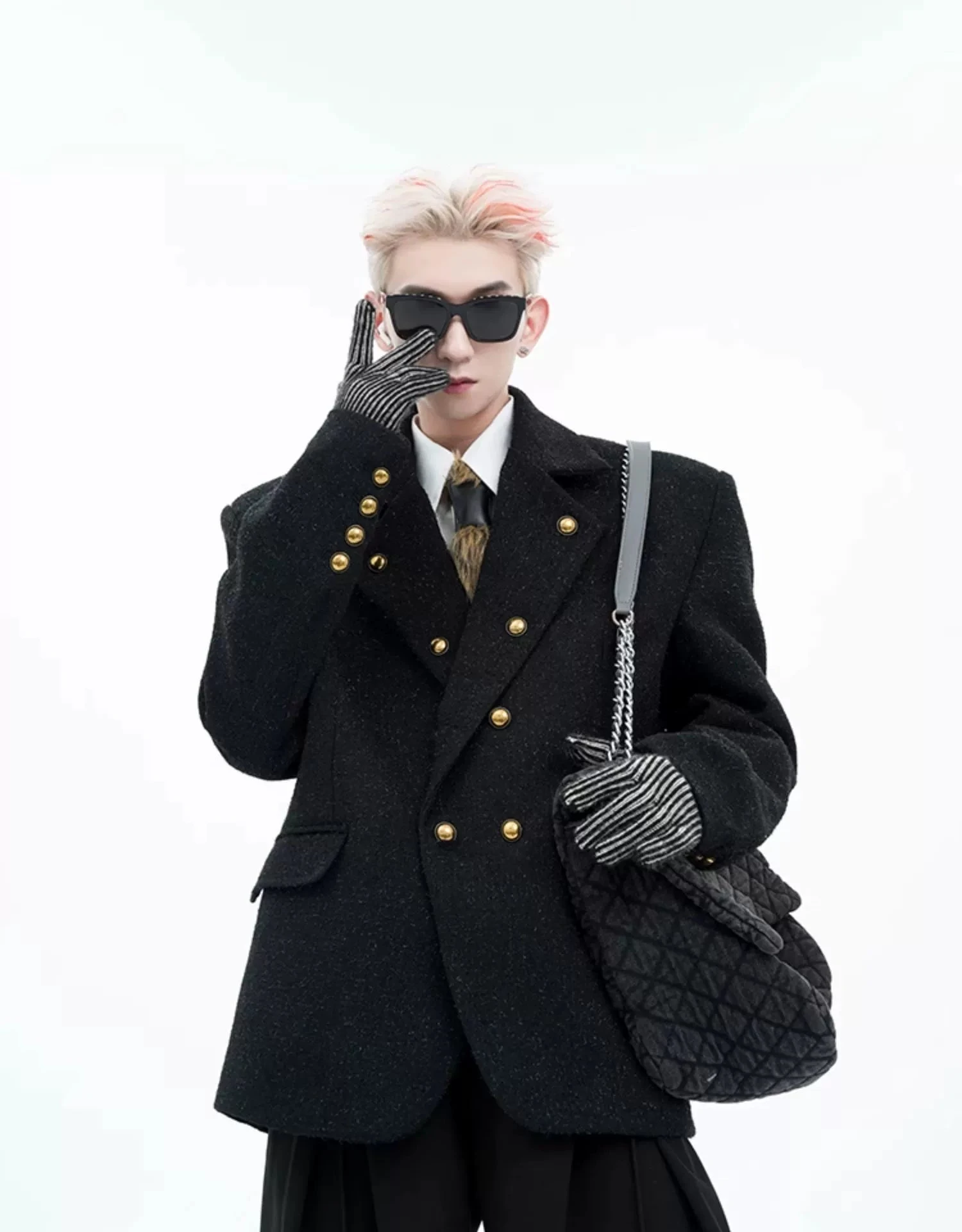 Discover the fusion of classic tailoring and modern accents with our Boxy Double-Breasted Glossy Peacoat, complete with striking gold buttons.