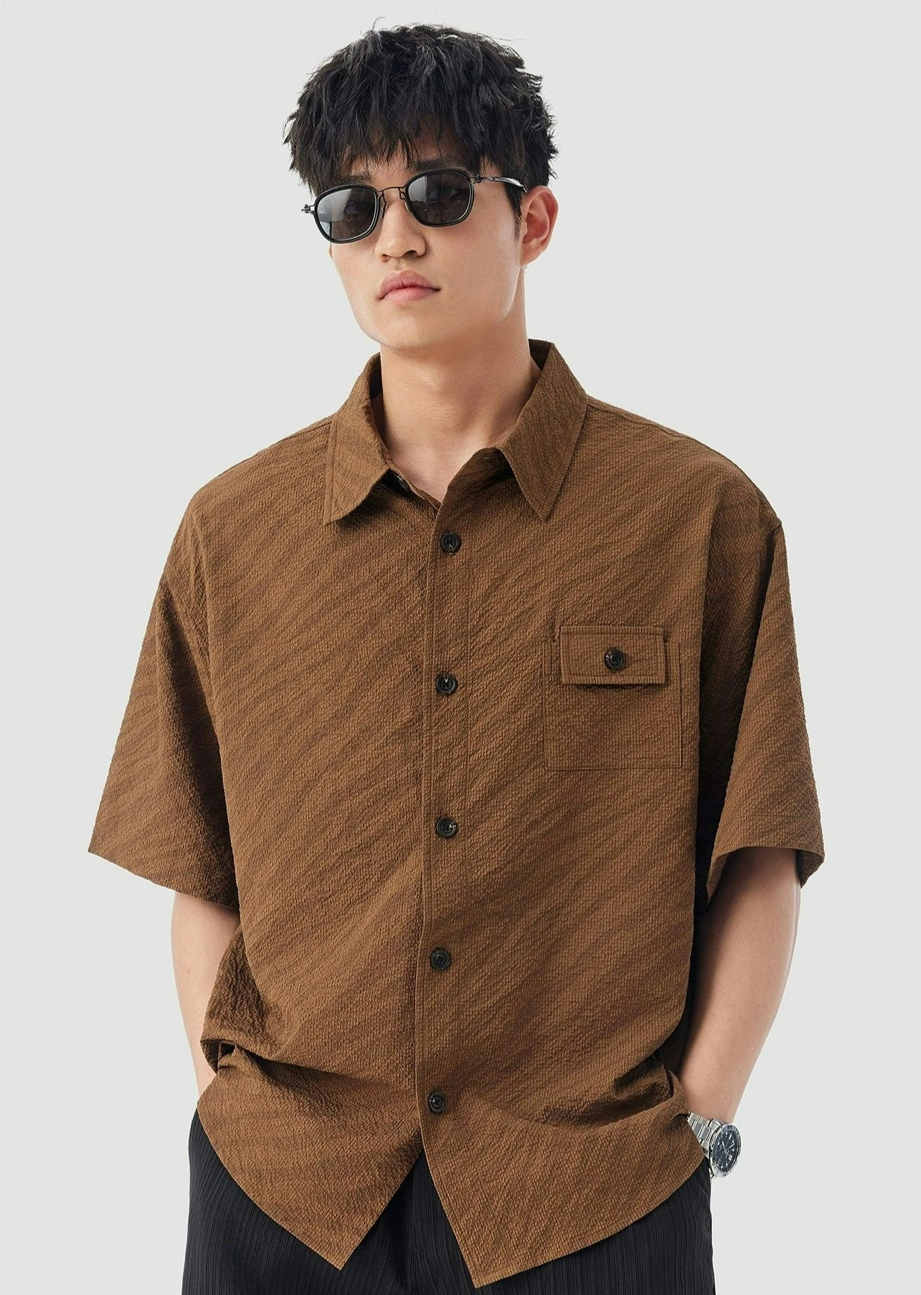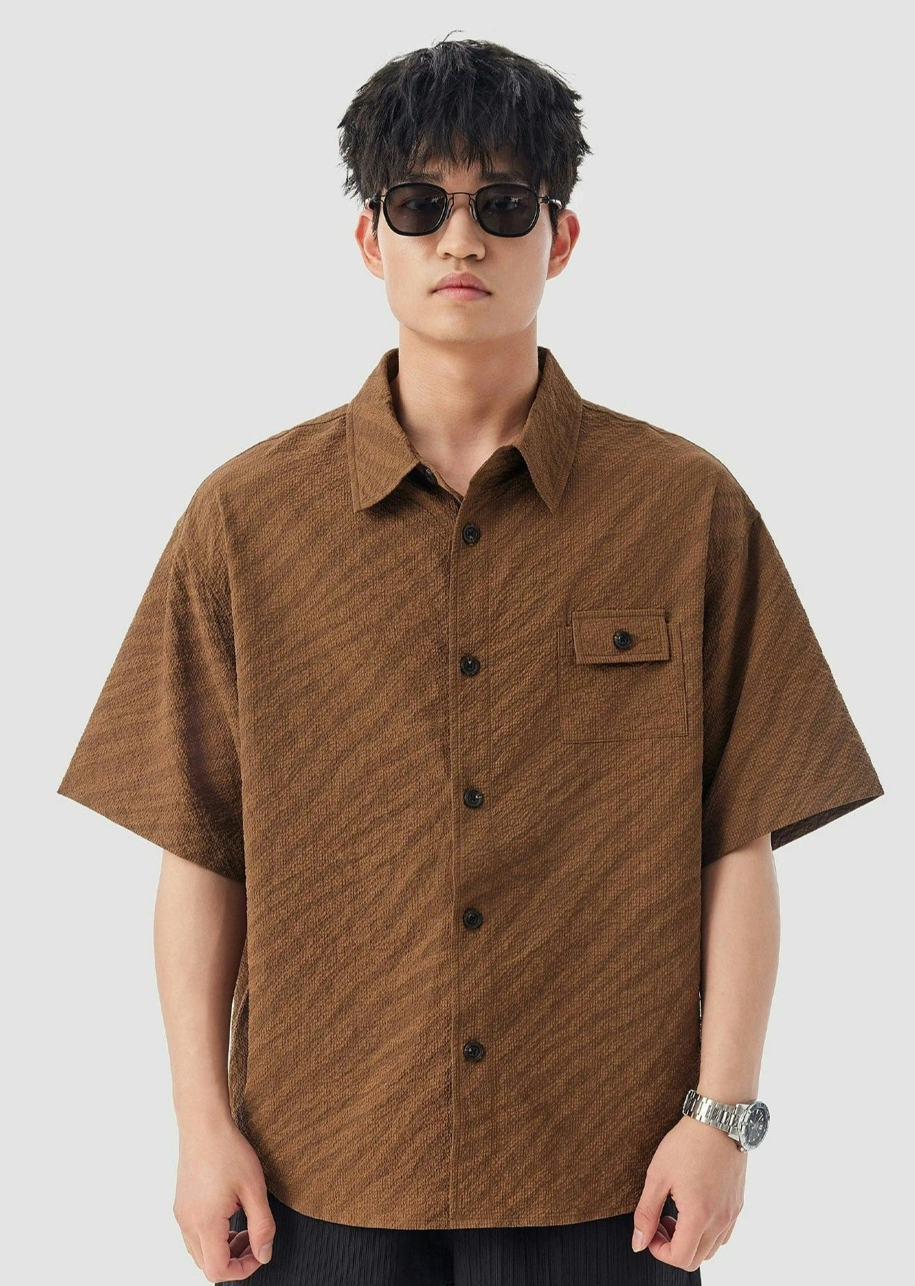 Discover the perfect blend of comfort and style with our Boxy Textured Button-Up Shirt, featuring a convenient chest pocket. Its unique texture adds a touch of sophistication to the classic button-up silhouette.