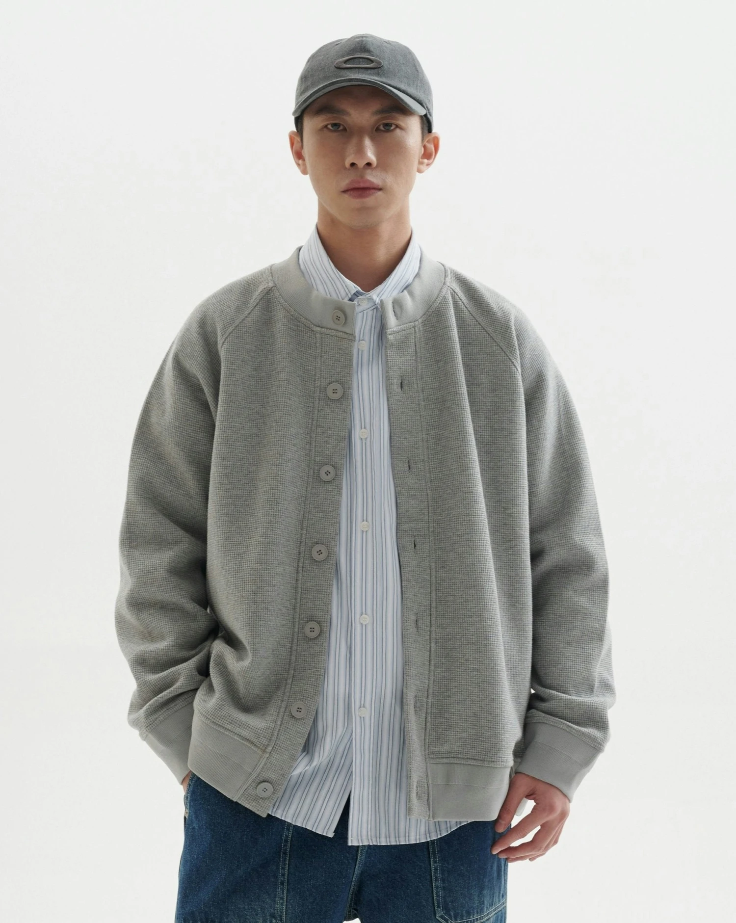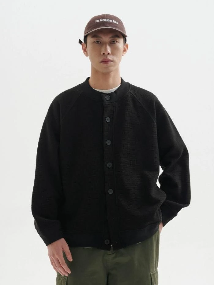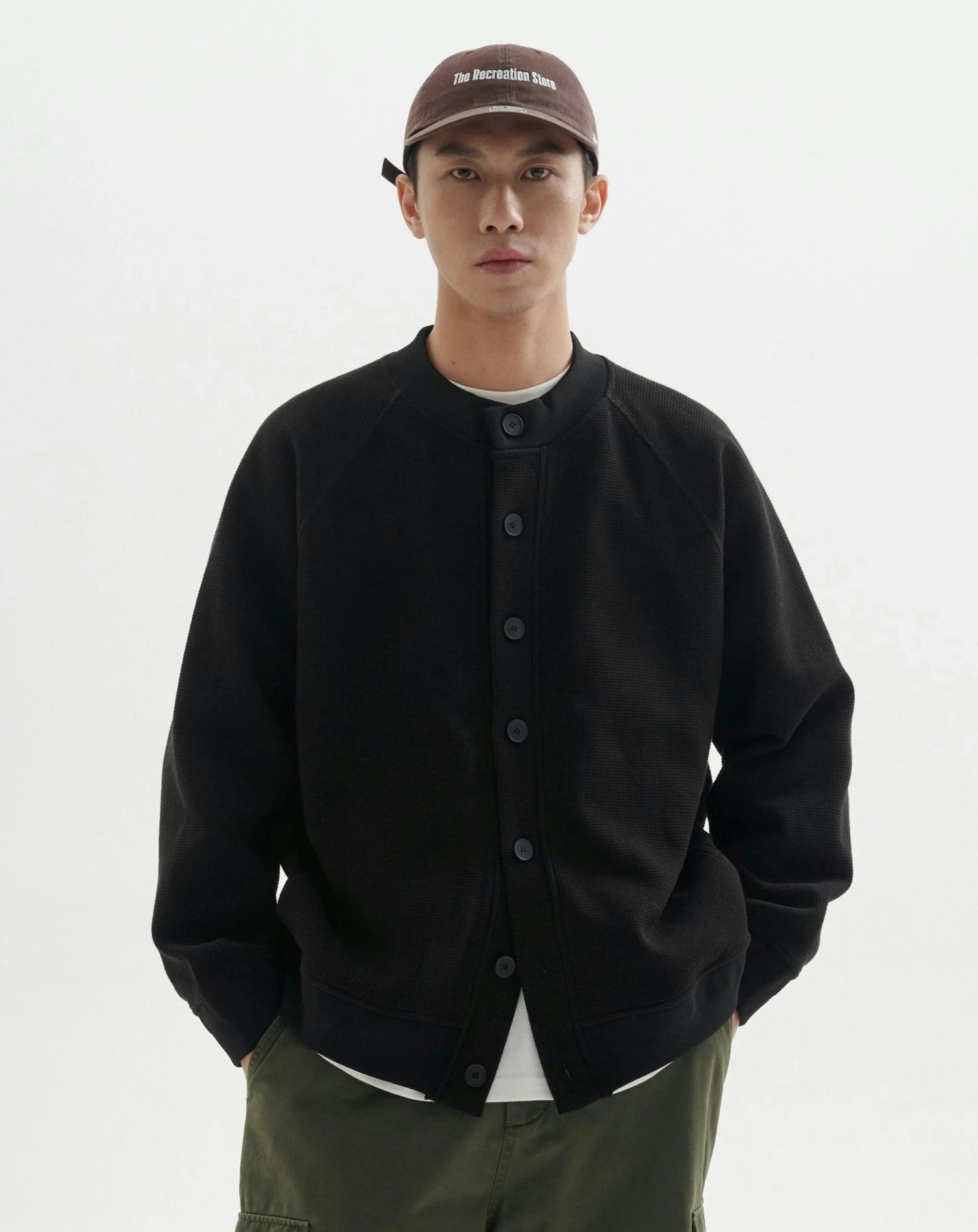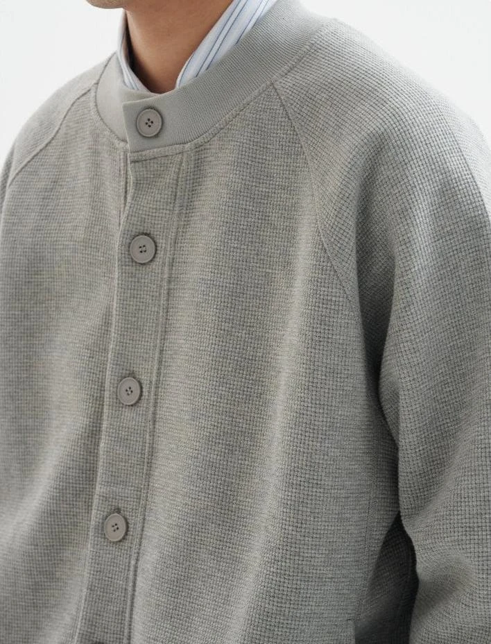Our bomber jacket features a distinctive waffle texture and a classic button-up front, offering both comfort and durability. Crafted with care, the heavyweight knit provides functionality while the loose fit guarantees ease of movement for your dynamic lifestyle.