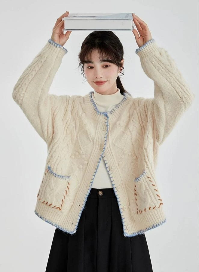 Embrace the transitional seasons with our Cable Knit Contrast Trim Oversized Cardigan, a statement piece that melds comfort with a touch of sophistication.