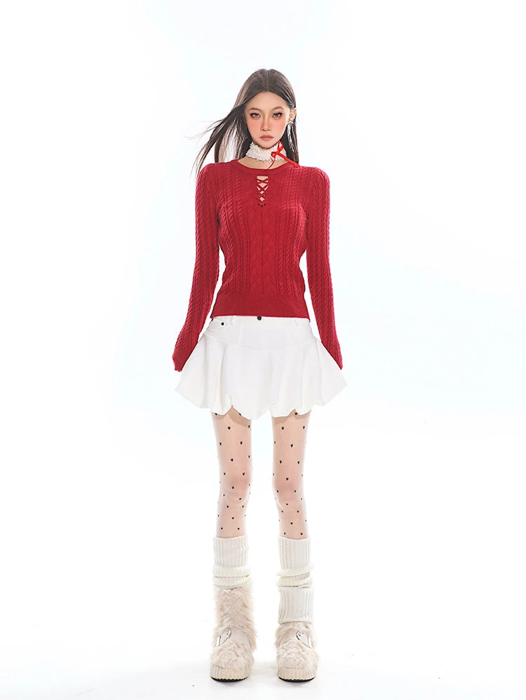 Its artful design combines classic texture with a modern edge, making it a standout piece that blends comfort with attitude. The intricate cable-knit pattern and cross-tie cutout neckline create a chic fusion of vintage charm and contemporary allure. Crafted from soft, breathable knit, the sweater molds effortlessly to your silhouette, offering both warmth and freedom of movement. Perfect for cooler days or layering under your favorite jacket, this sweater is your go-to for style that feels as good as it looks.