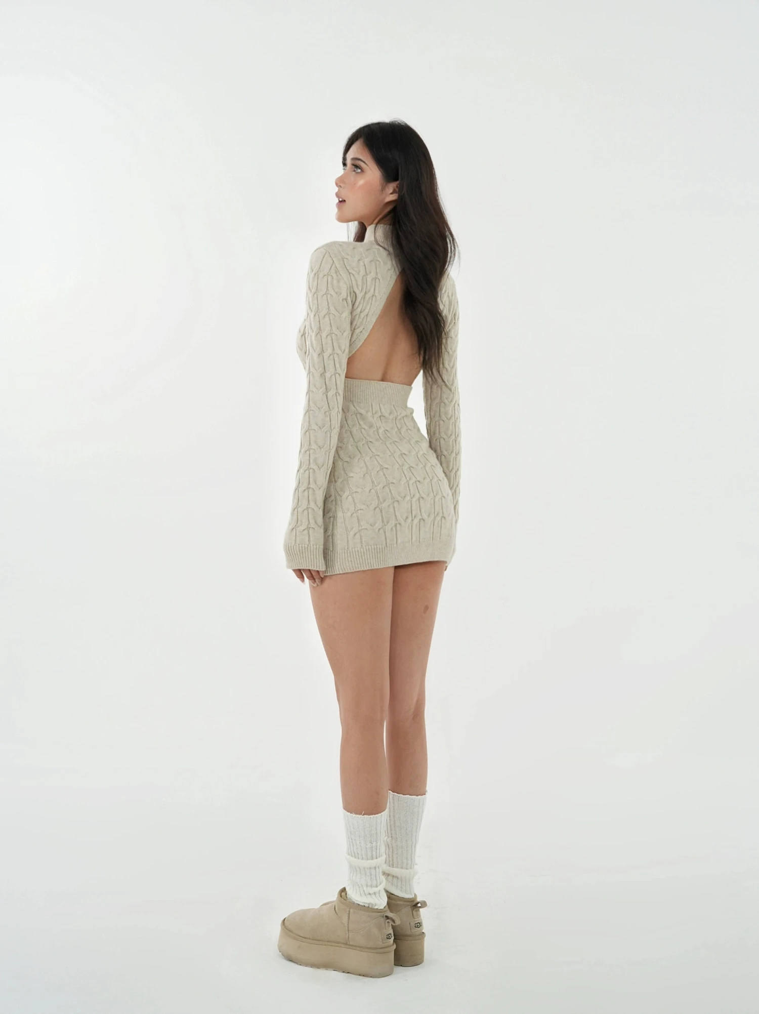 Experience the allure of simplicity and sophistication with our Cable Knit Turtleneck Mini Sweater Dress, featuring a tantalizing open back.