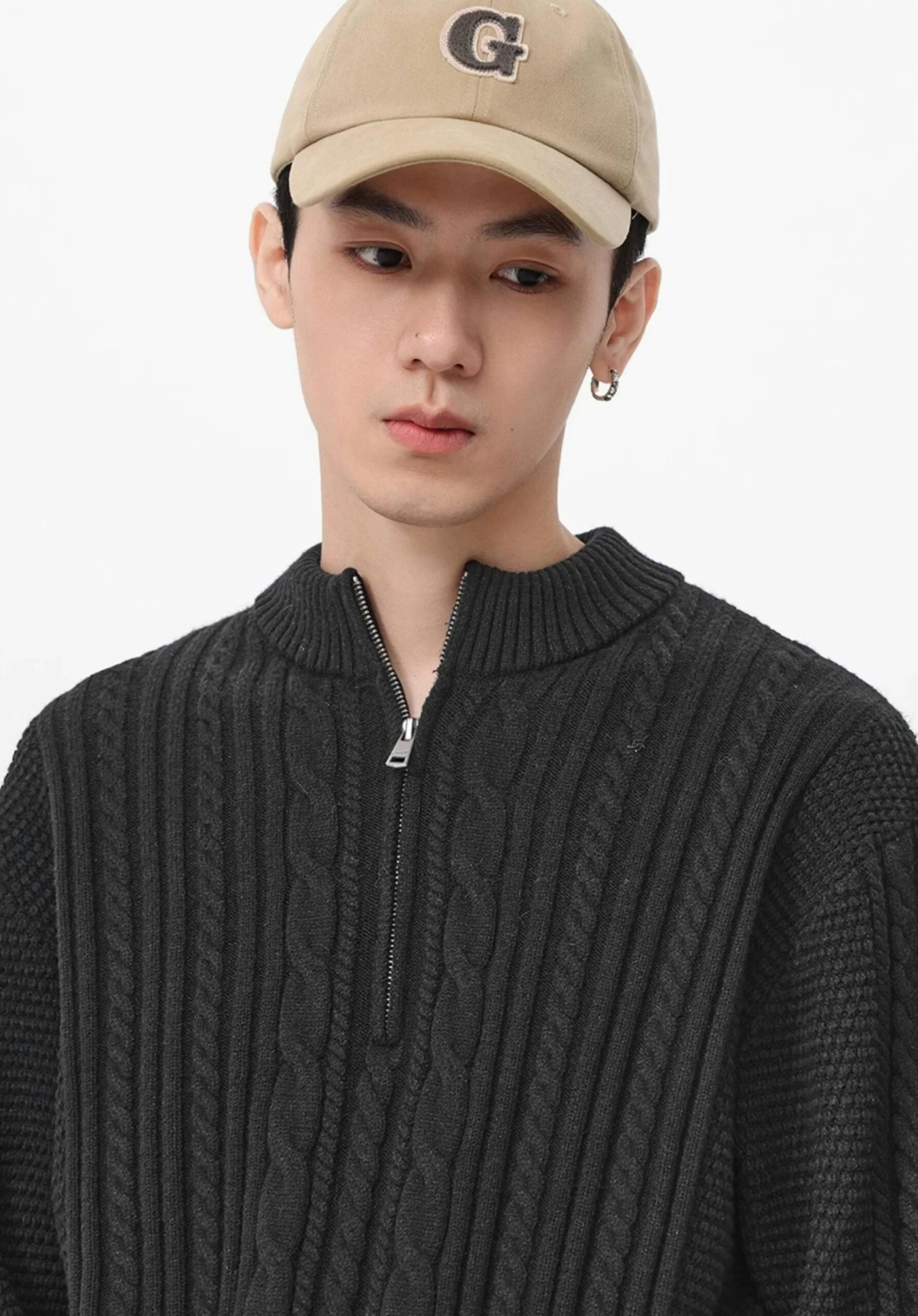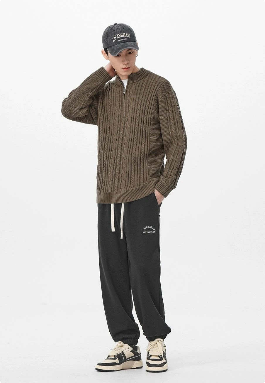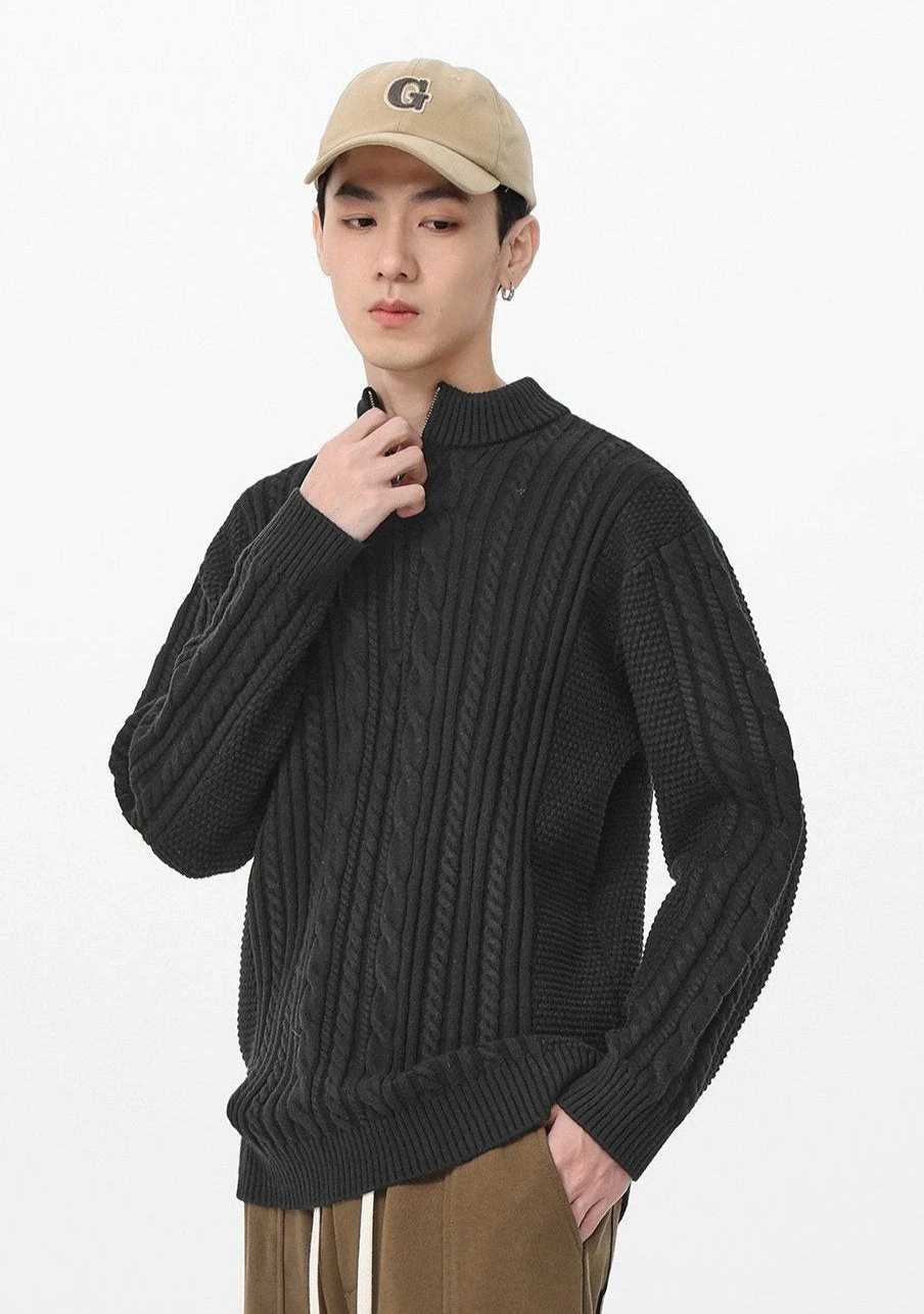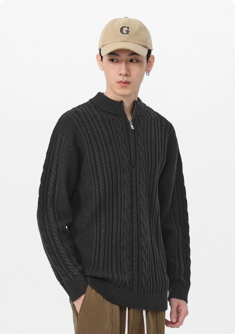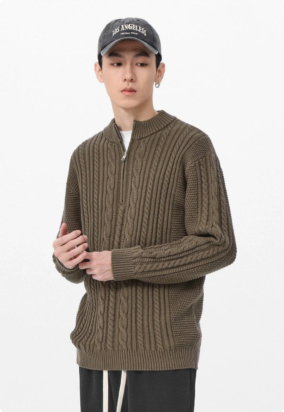 Introducing timeless comfort with an edge—the Cable Knit Zip-Up Mock Neck Sweater, a contemporary piece crafted for the modern, style-conscious individual.
