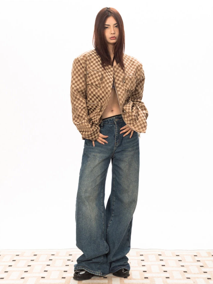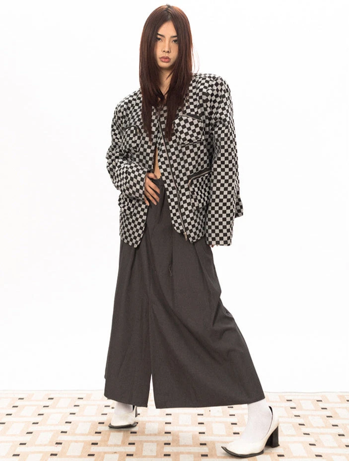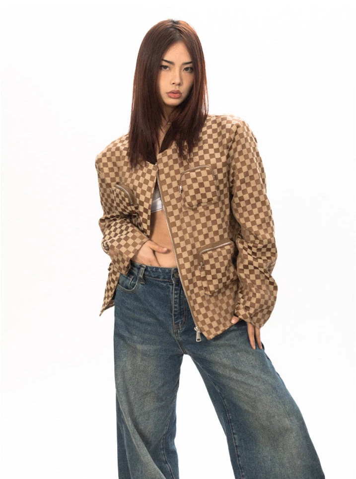 Designed with a bold checkerboard pattern, this piece is all about making a statement without even trying. The oversized fit delivers a relaxed, unbothered look, while the zip closure and zippered pockets add both function and attitude. Built from a durable yet comfortable fabric, this jacket is structured enough to hold its shape but flexible enough for movement.