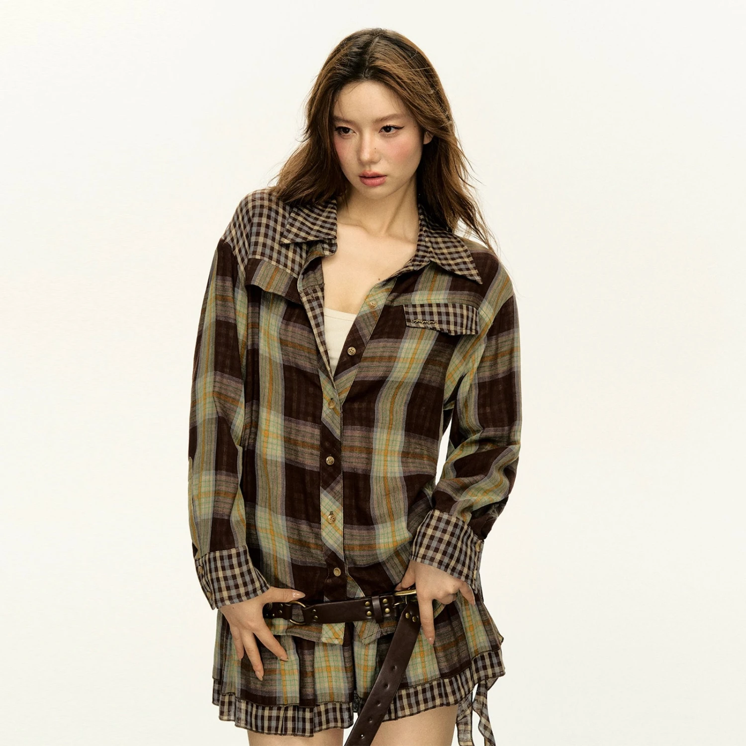Make a statement with the Checker Patchwork Plaid Long-Sleeve Button Shirt and Pleated Mini Skirt Two-Piece Set, showcasing an effortless blend of retro and modern style.
