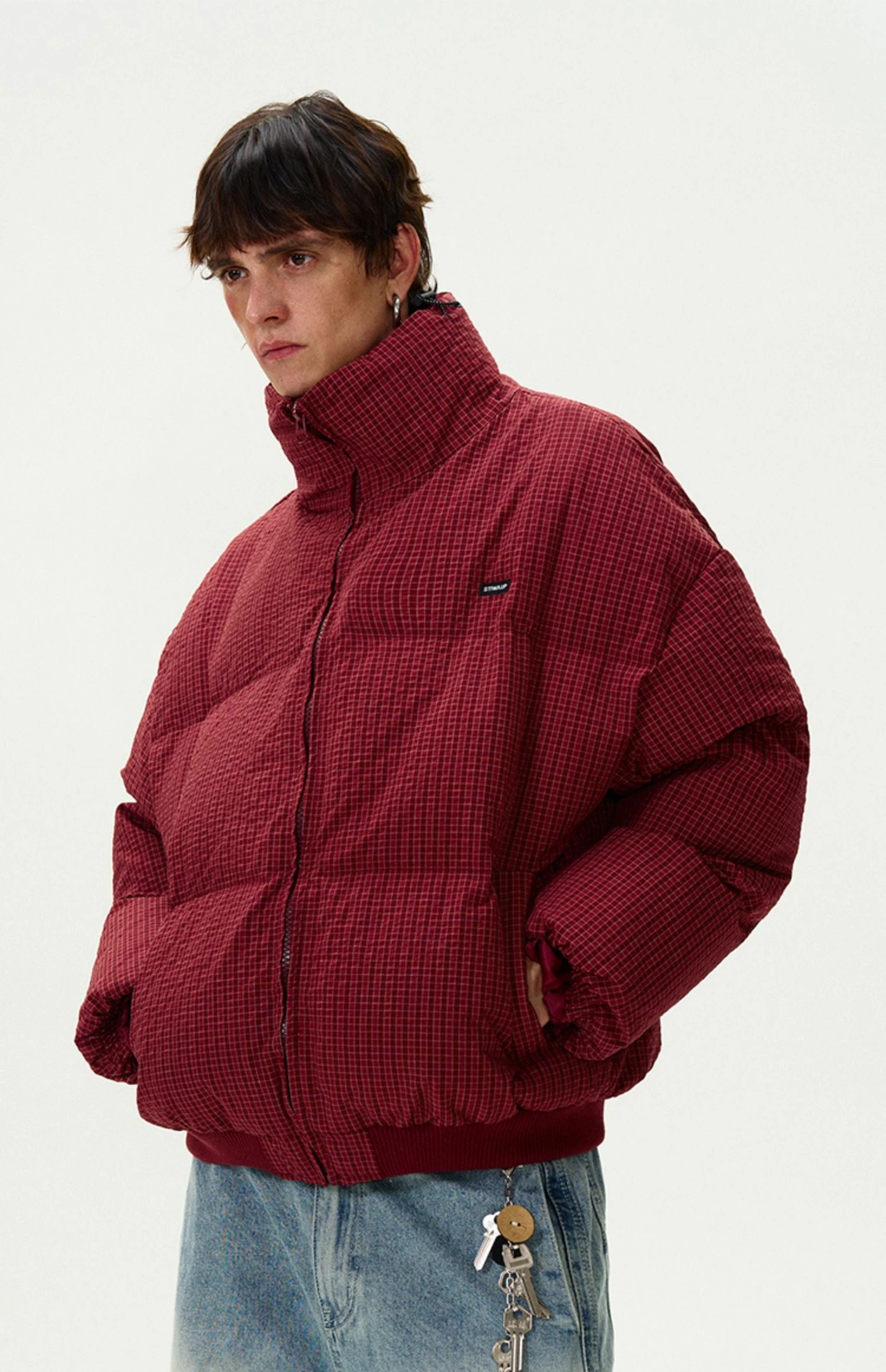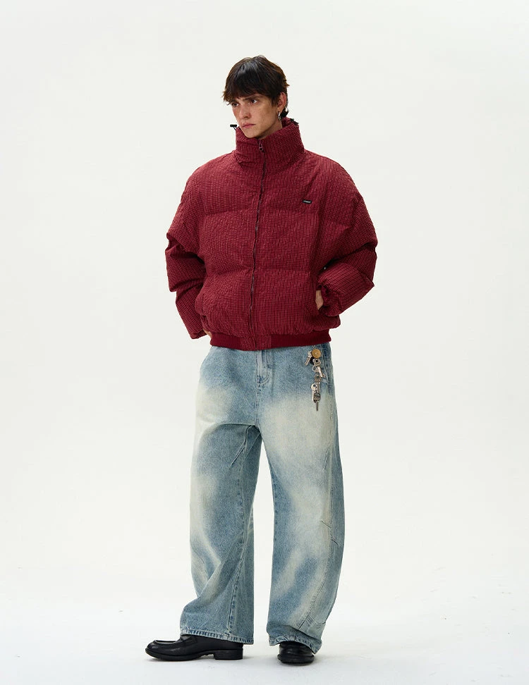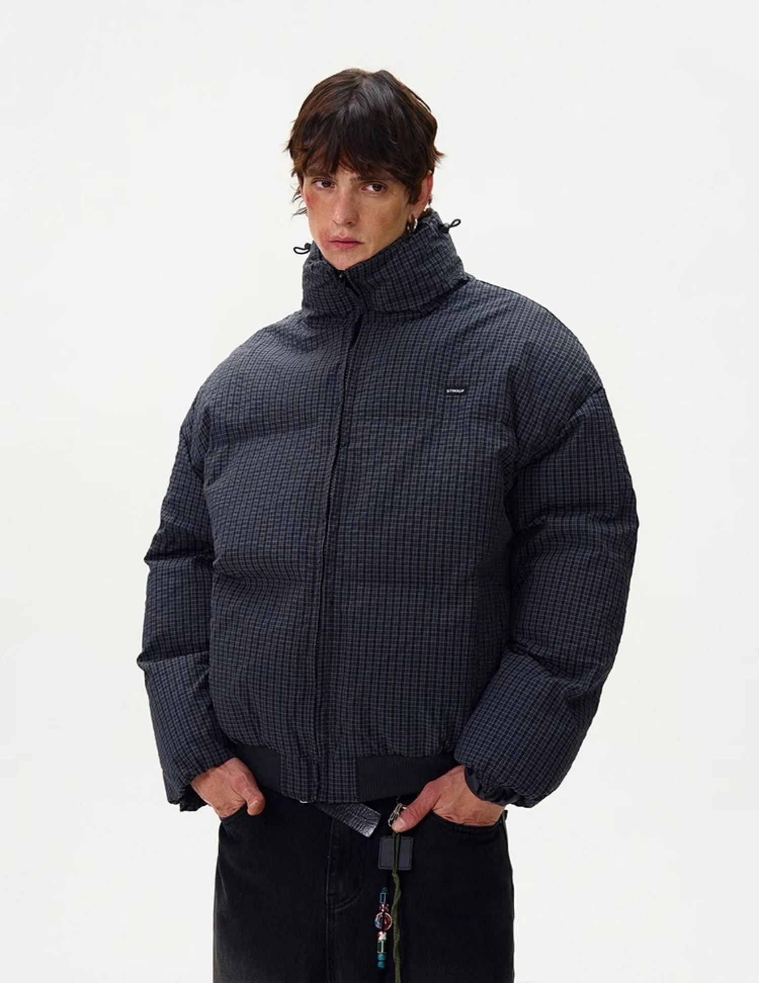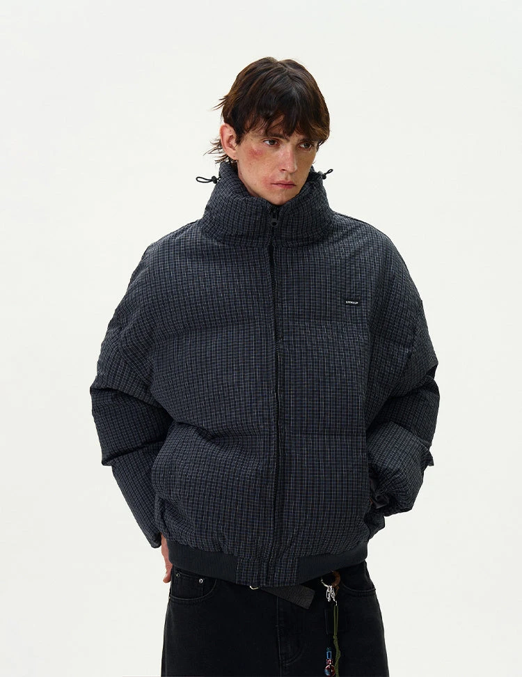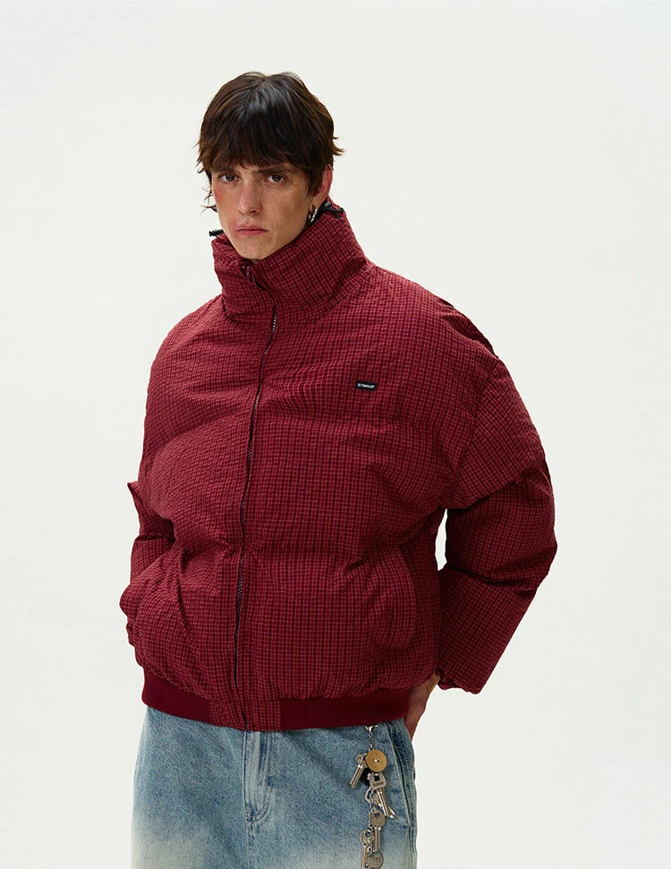 Engineered for both edge and comfort, this checkered stand-collar puffer jacket delivers a bold yet effortless statement.