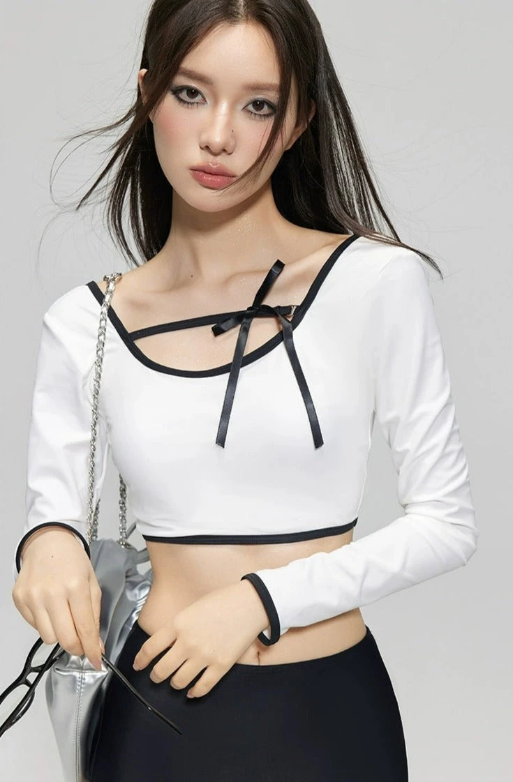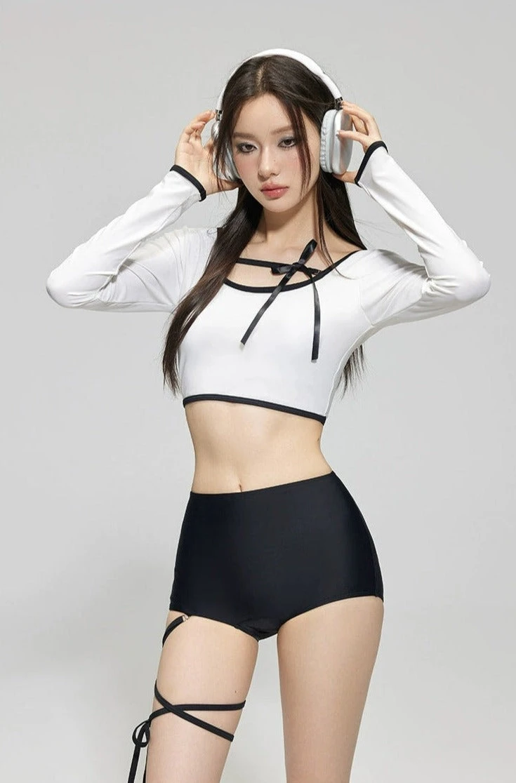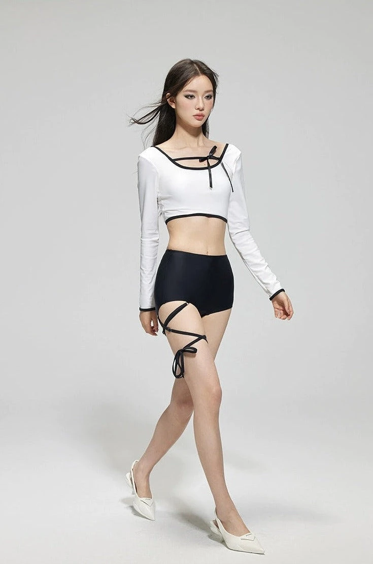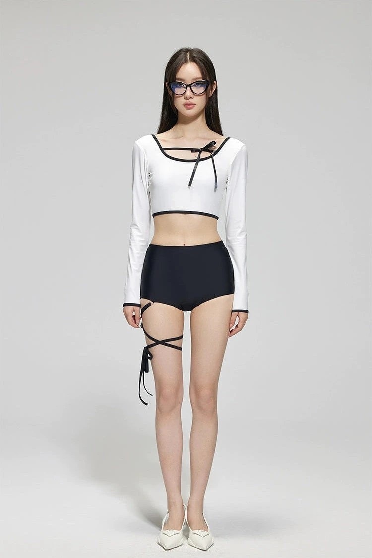 Make a splash with the Contrast Hem Long Sleeve Crop Top and High-Waisted Bikini Set—where style meets comfort in the sun.