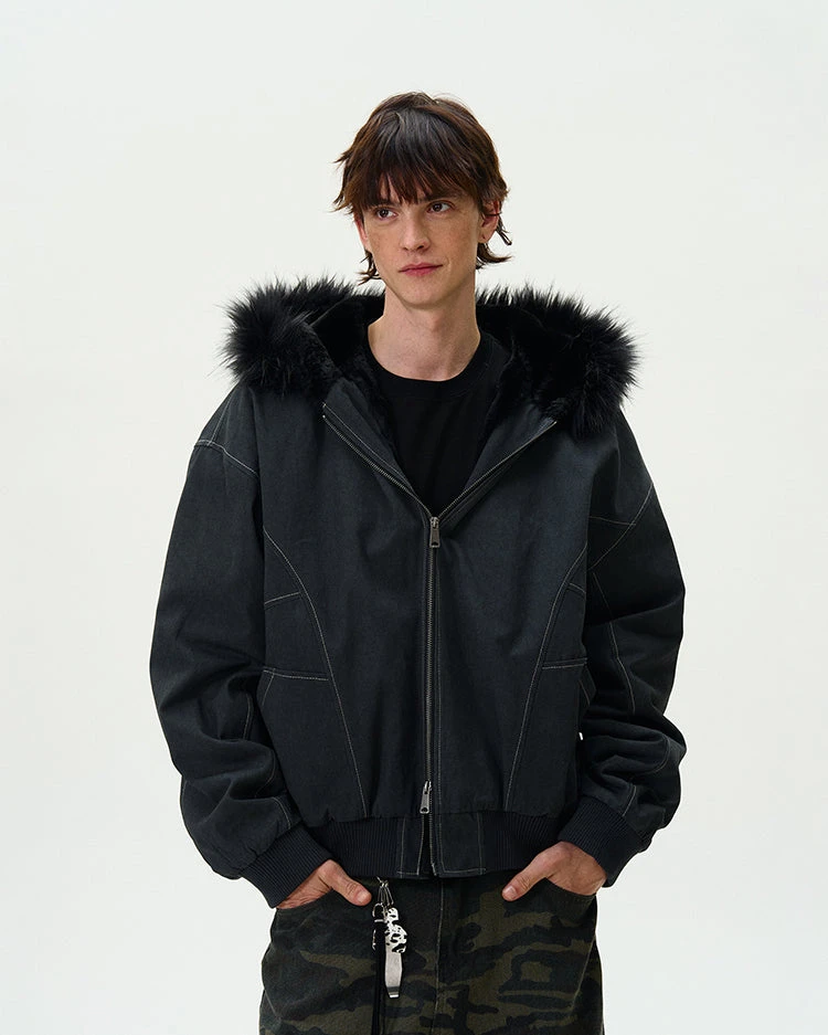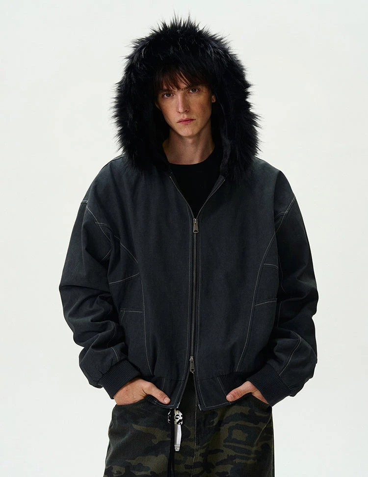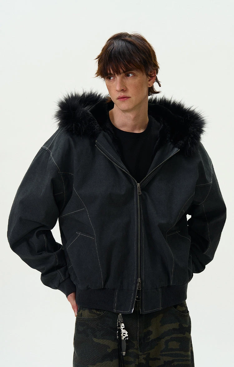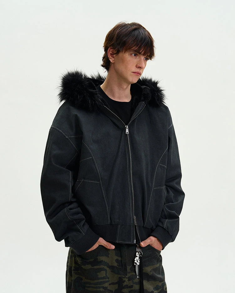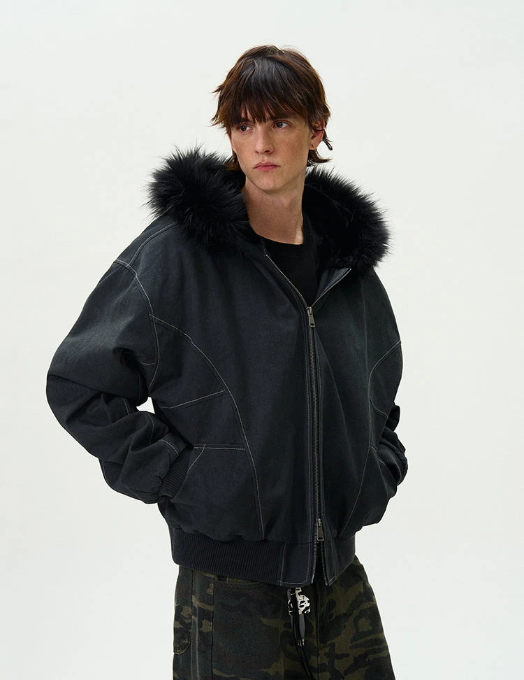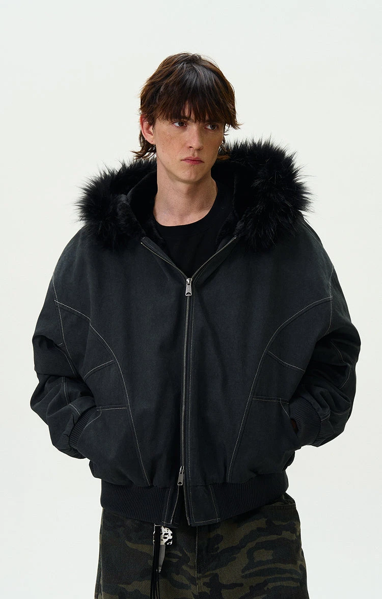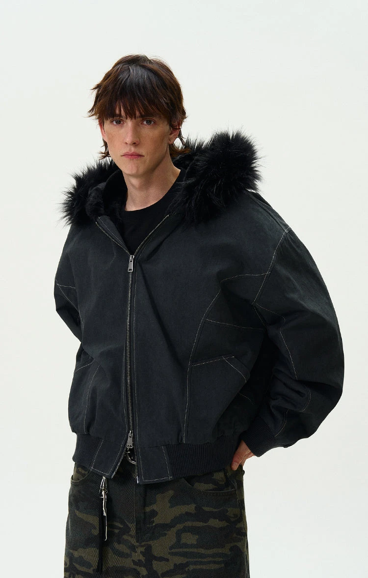 Elevate your outerwear game with this oversized bomber jacket, featuring a bold contrast stitch design and a plush faux fur hood.
