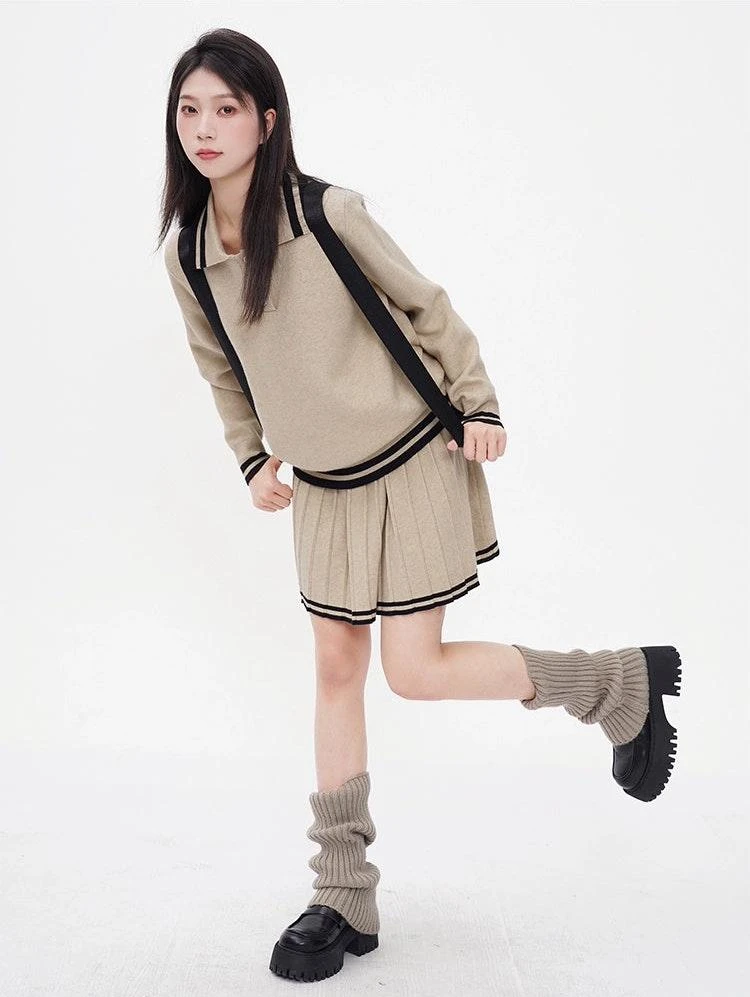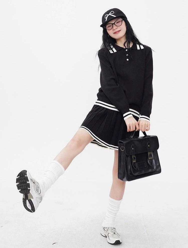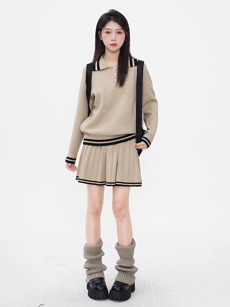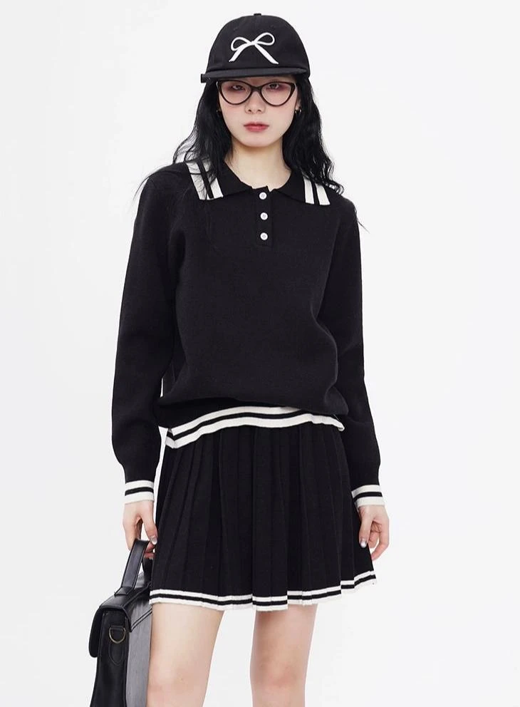 Crafted for an effortlessly chic look, this two-piece ensemble features a polo-collar sweatshirt with a half-button placket and a high-waisted pleated skirt. The solid color design is accentuated by crisp contrast trim detailing, adding a touch of sophistication to the set. Its texture and pattern offer a modern twist to the classic preppy style, ensuring you stand out in any setting. This versatile set transitions smoothly from a casual day out to a smart-casual event.