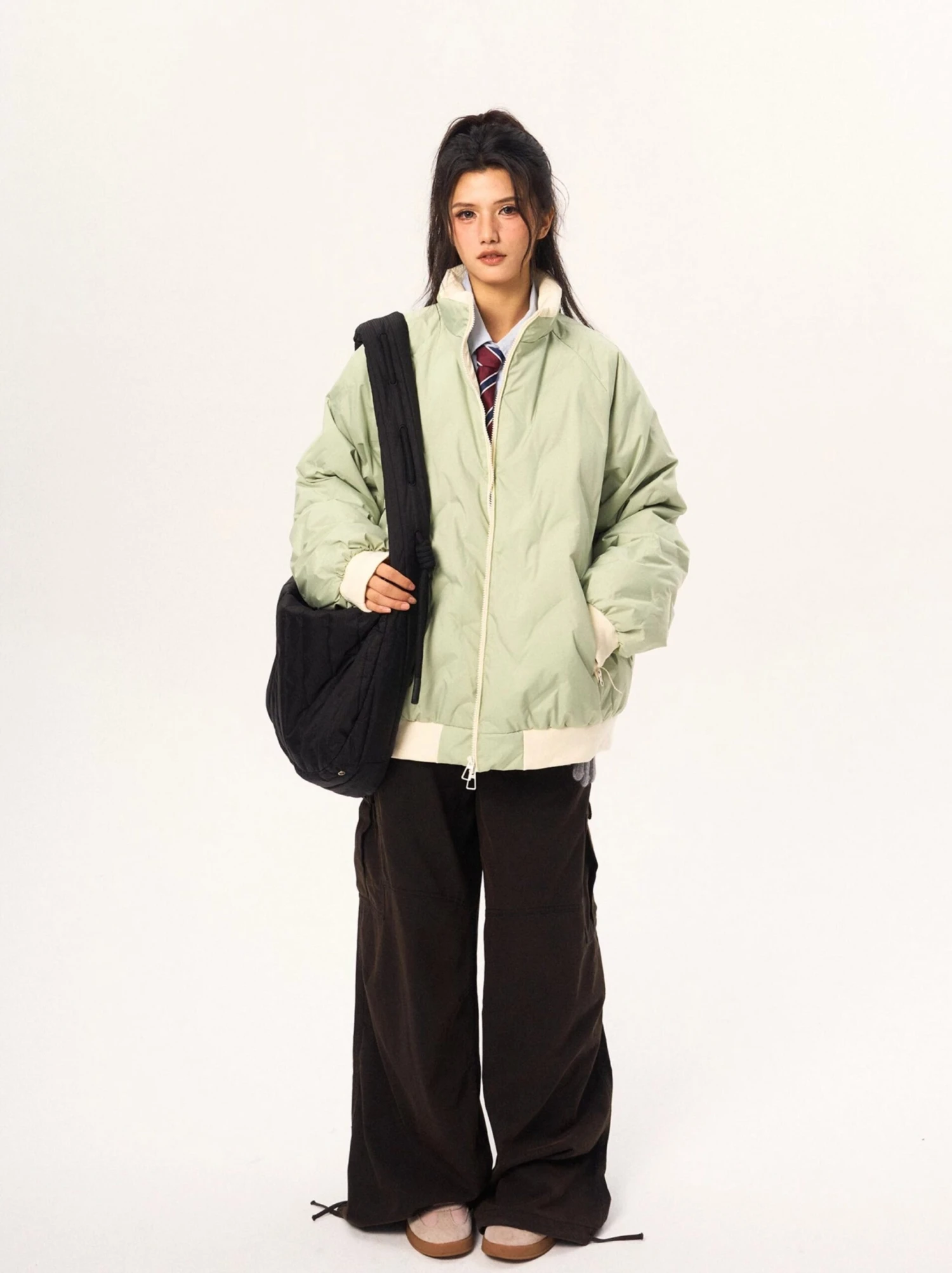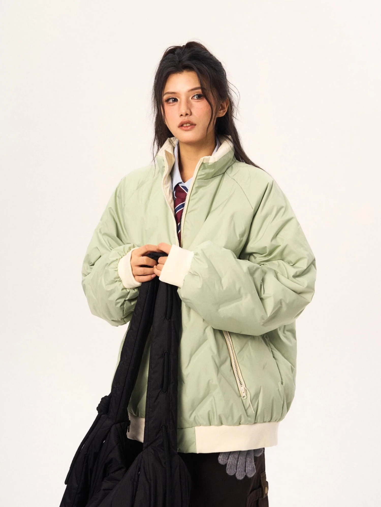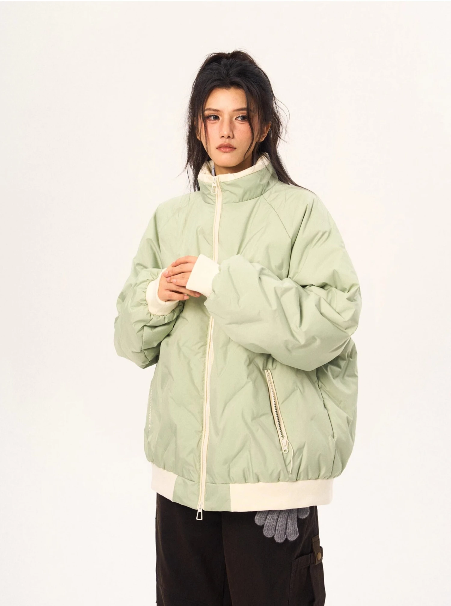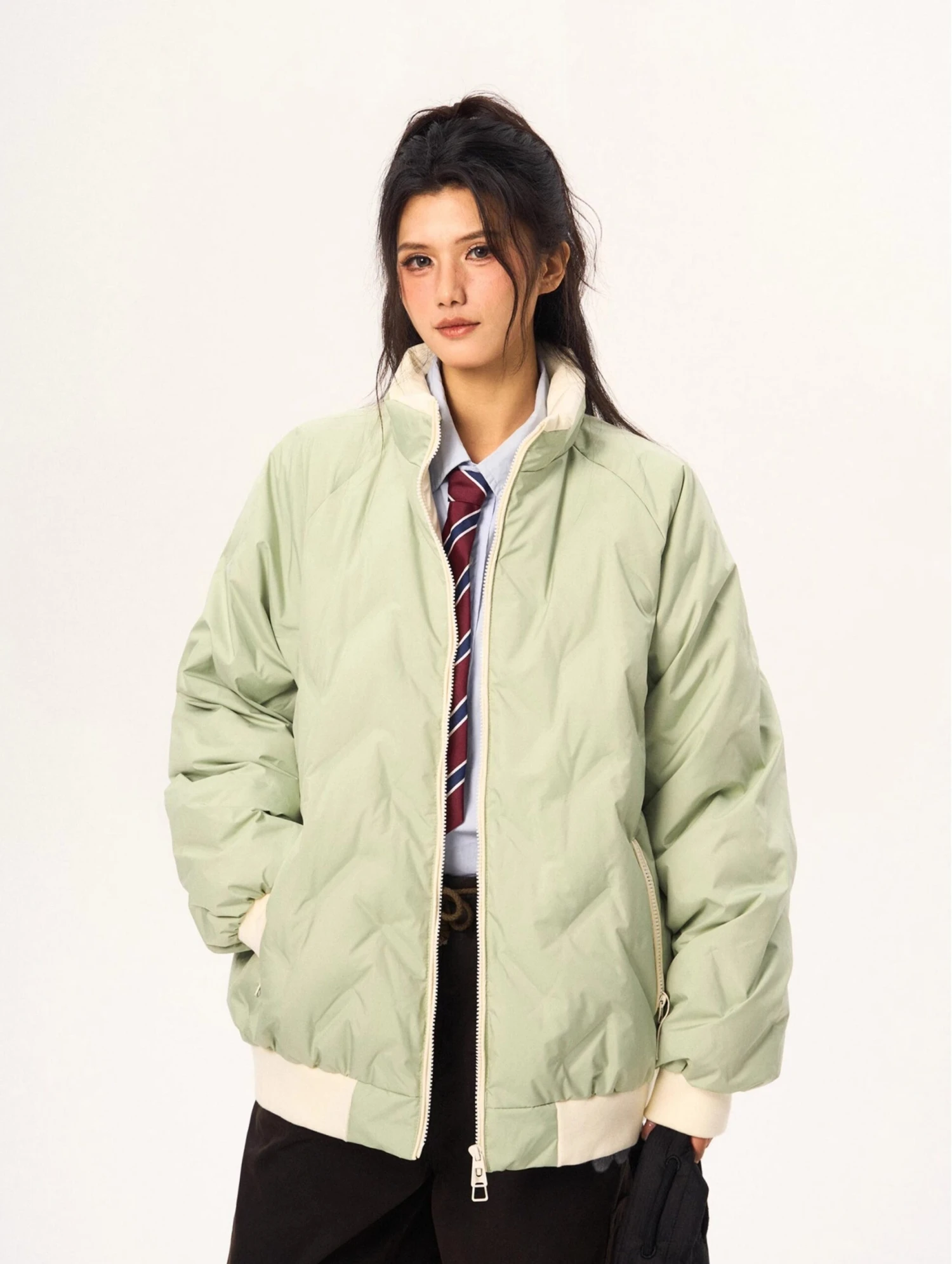This lightweight yet warm outerwear piece combines a retro-inspired silhouette with modern details, making it a go-to for layering during chilly days. Crafted from durable and smooth fabric, the oversized design features quilted texturing and contrasting trim details for a bold, sartorial statement. The stand-up collar and zippered closure offer a clean, structured look while keeping out the cold. Generous white duck down filling provides warmth without adding unnecessary bulk, ensuring both comfort and mobility in your daily routine.