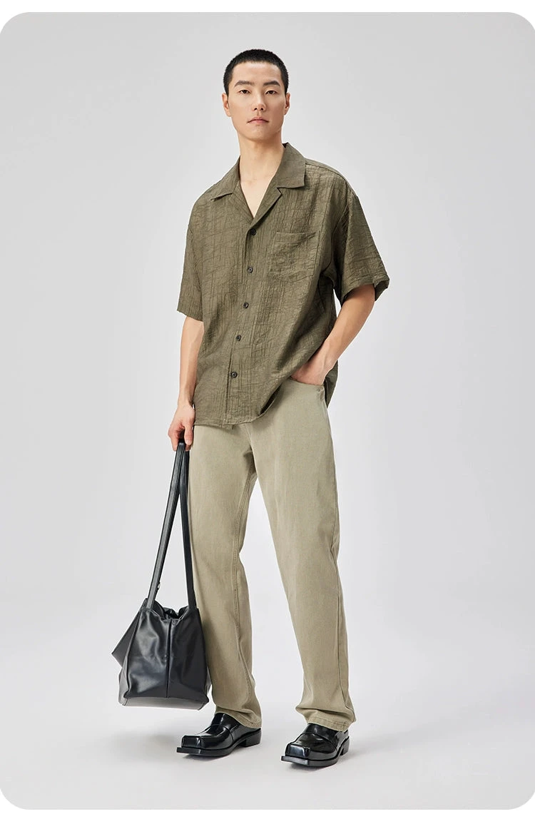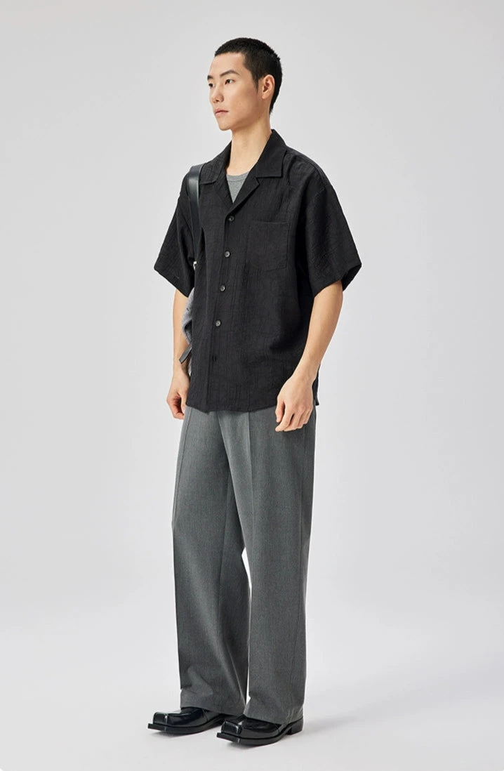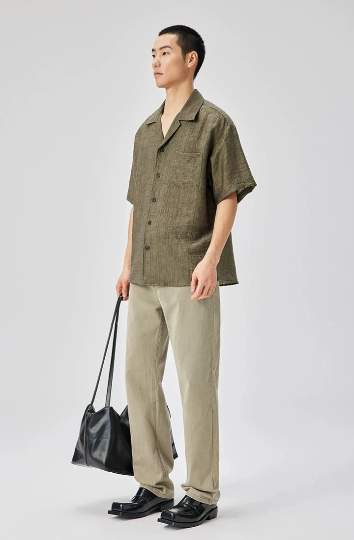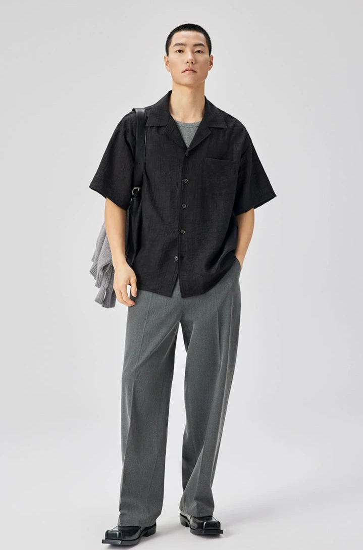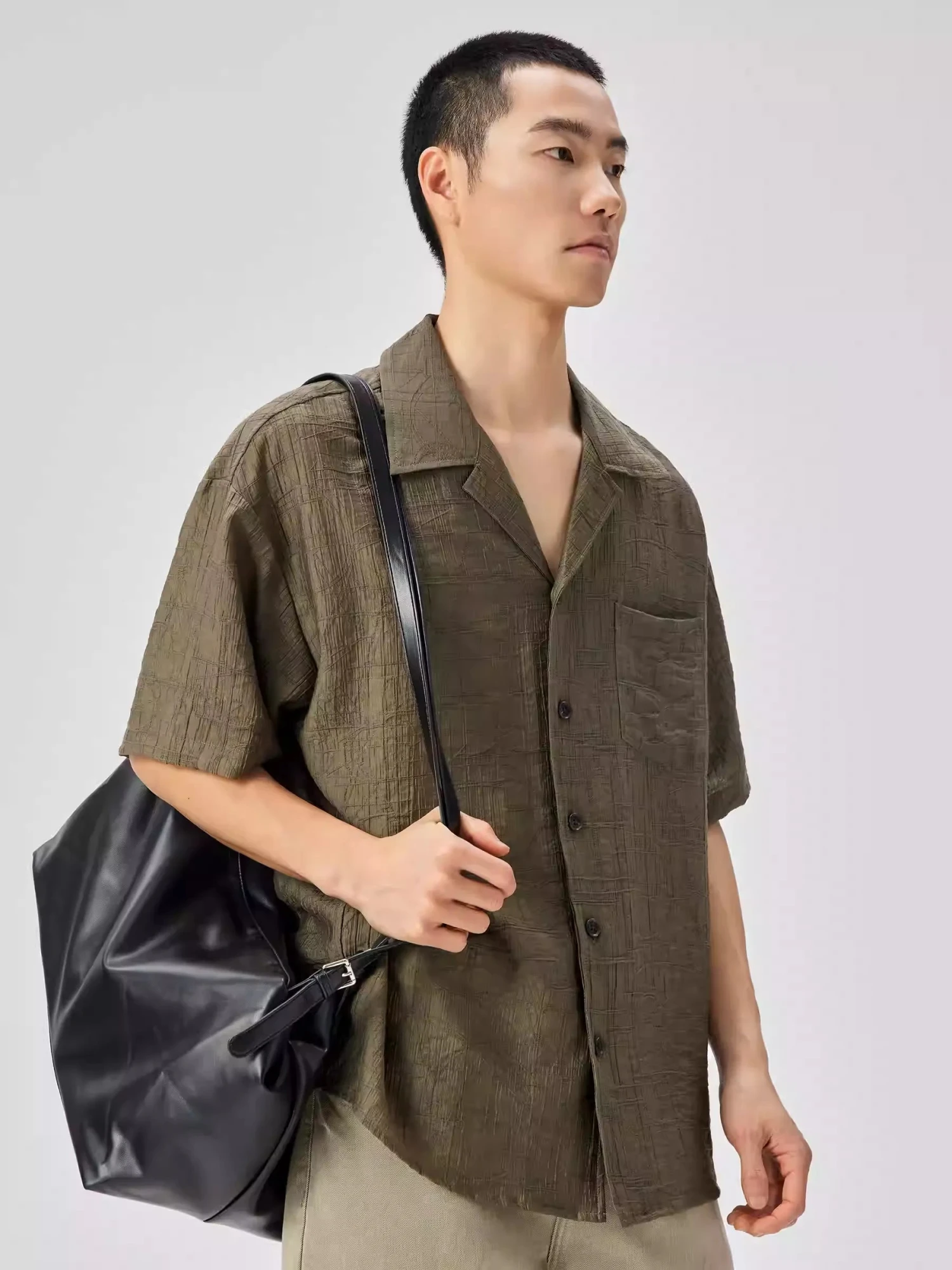 Crafted with a rich jacquard-woven lyocell blend, this shirt delivers a cool-to-the-touch feel with a crisp, breathable structure. The classic camp collar and loose fit give it a laid-back presence, while the tonal texture adds quiet structure and detail. A chest pocket finishes the look with a nod to utility. Style it open over a tee for weekends, buttoned up with tailored trousers for casual days at work, or pair with cargo pants for off-duty evenings.