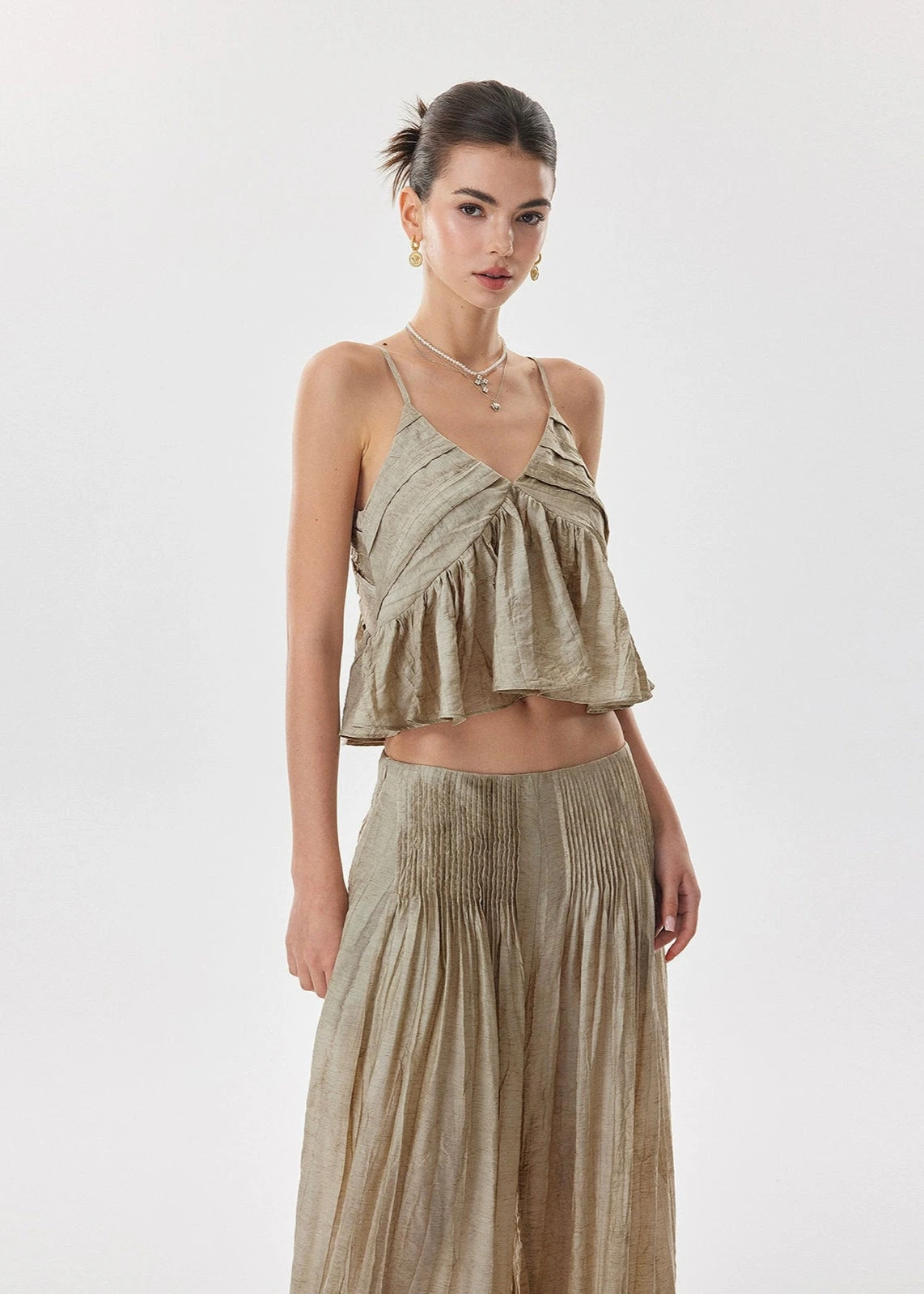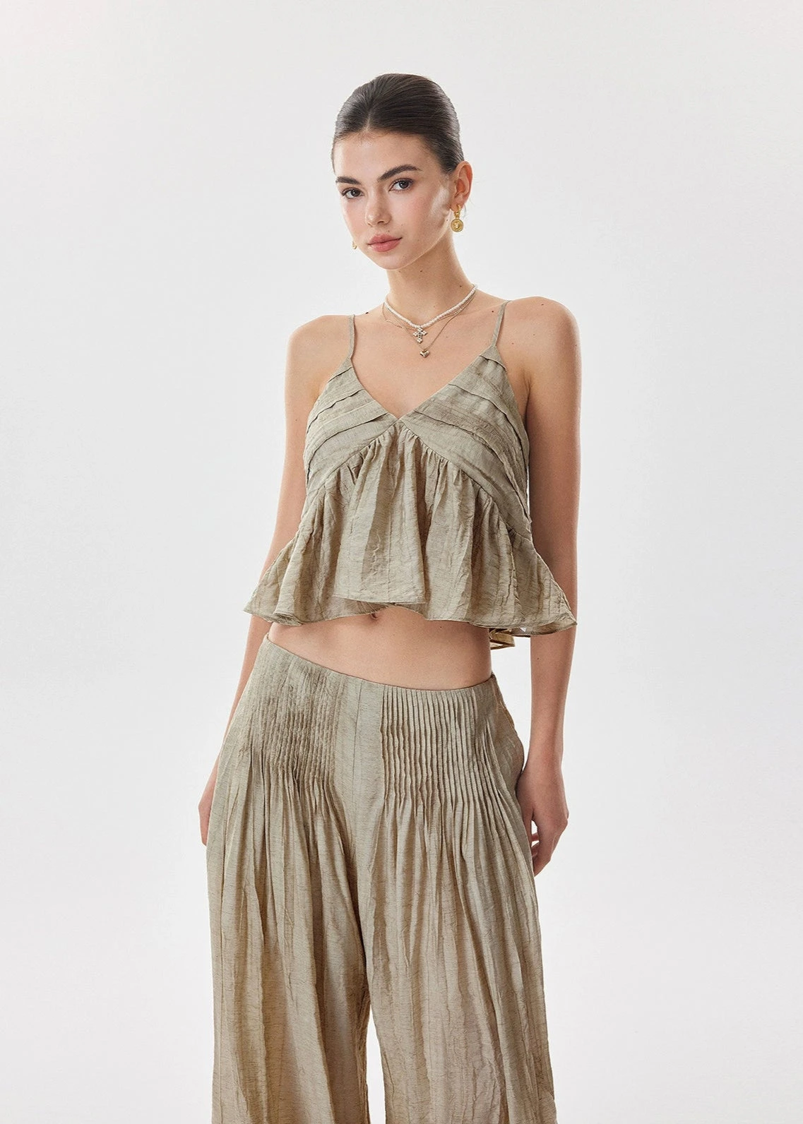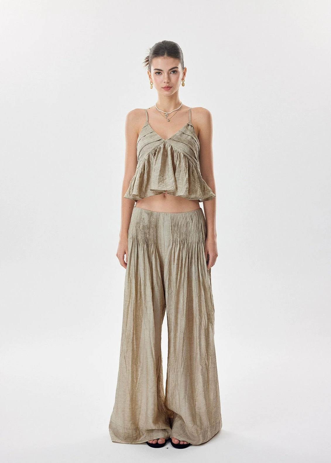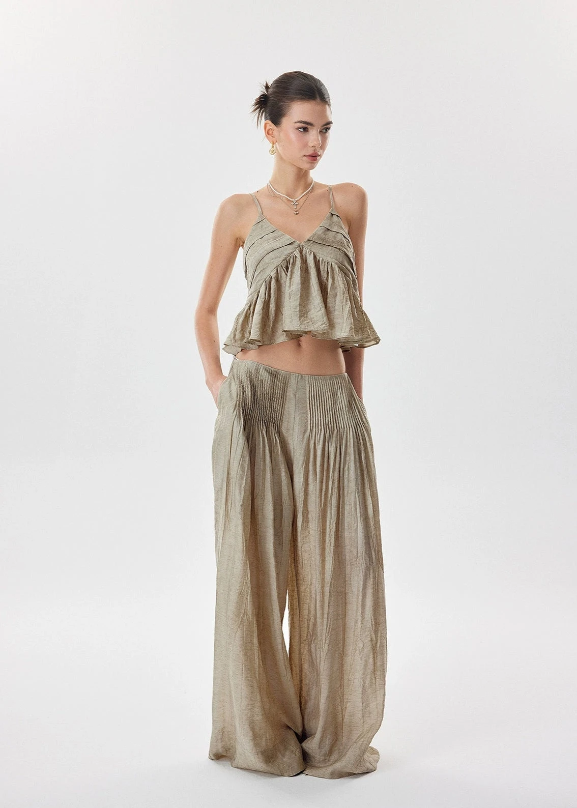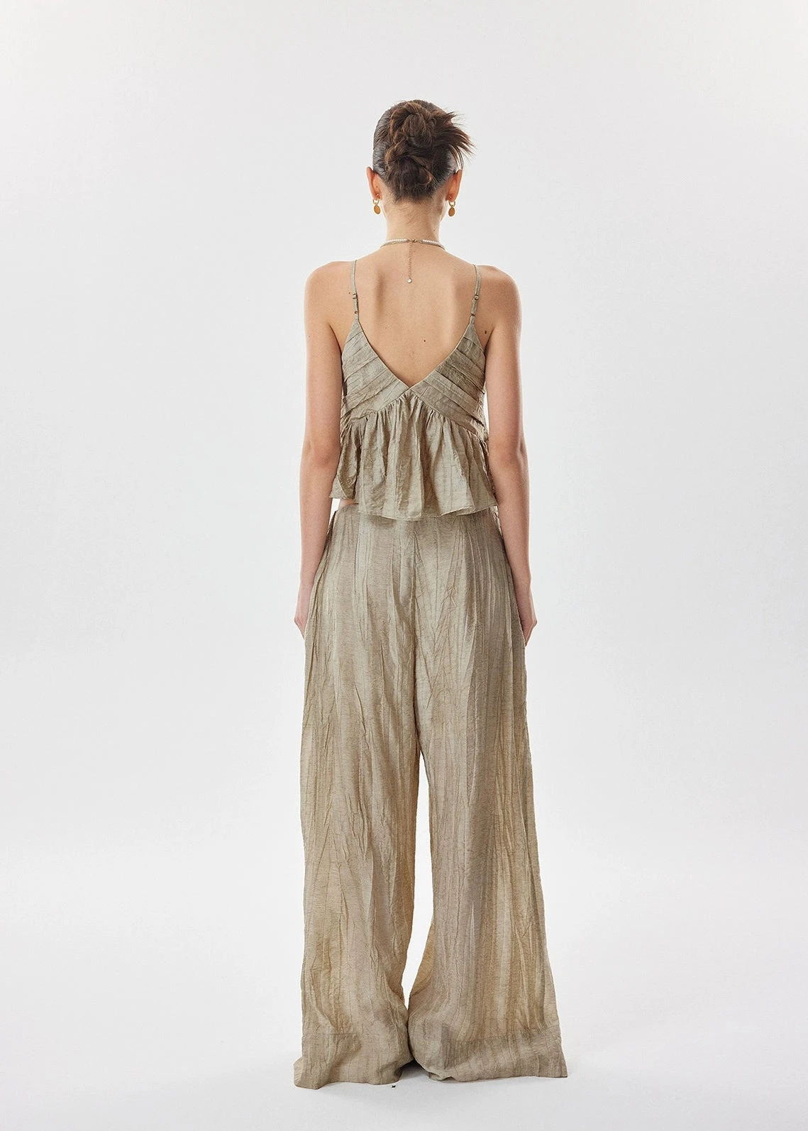 The flowy cami top and wide-leg pleated pants are designed with a crinkle finish that moves with you while adding depth to the minimalist silhouette. Made from a lightweight blend of cotton and lyocell, this set balances comfort with intention. The cami features a soft V-neckline with skinny straps and a relaxed, swingy fit, while the pleated pants sit high on the waist with full, draping legs that elongate the frame.