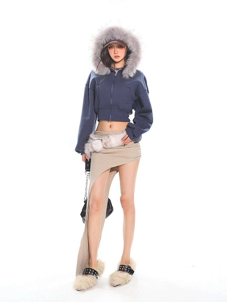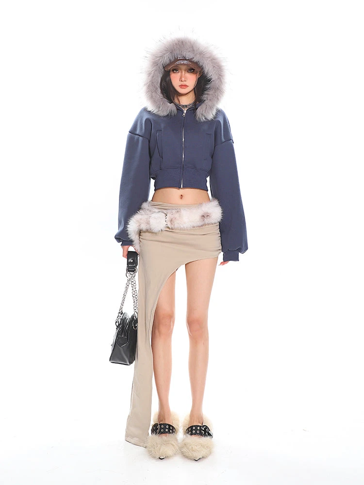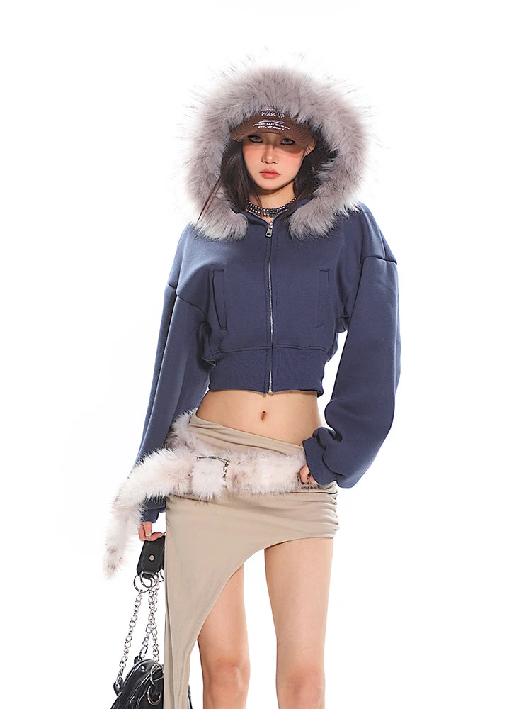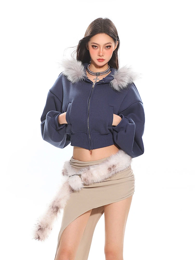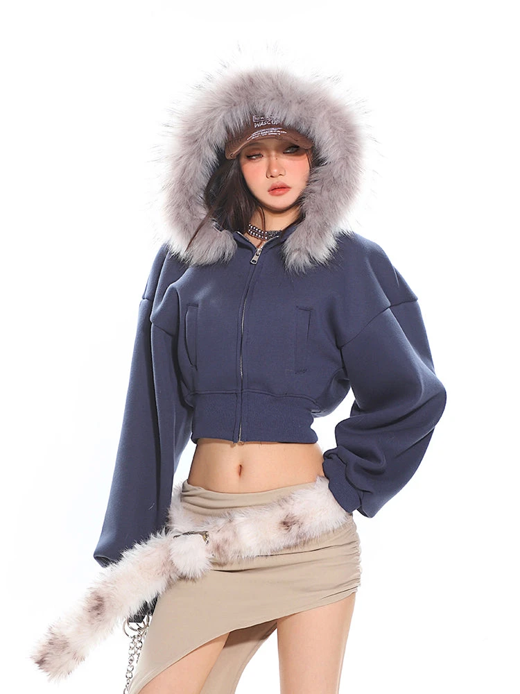 Elevate your streetwear game with this Cropped Faux Fur Hoodie Balloon Sleeves Jacket, blending edgy flair with cozy comfort.