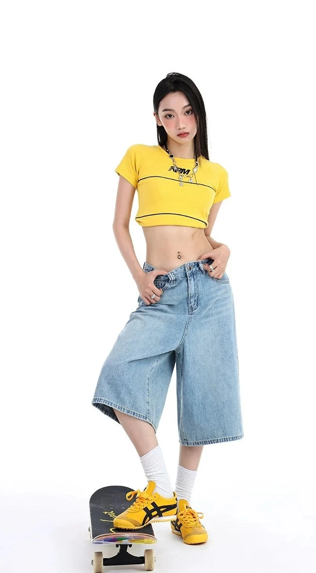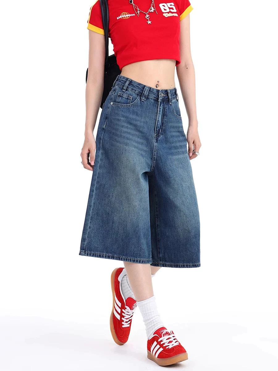 Crafted with a high waist and wide-leg flair, these capri shorts are made to provide both a flattering fit and day-long comfort. The soft denim fabric moves with you, while the retro blue and light blue color options add to the vintage appeal. Functional and stylish, these shorts feature a nonchalant cut that makes a moody yet professional statement.