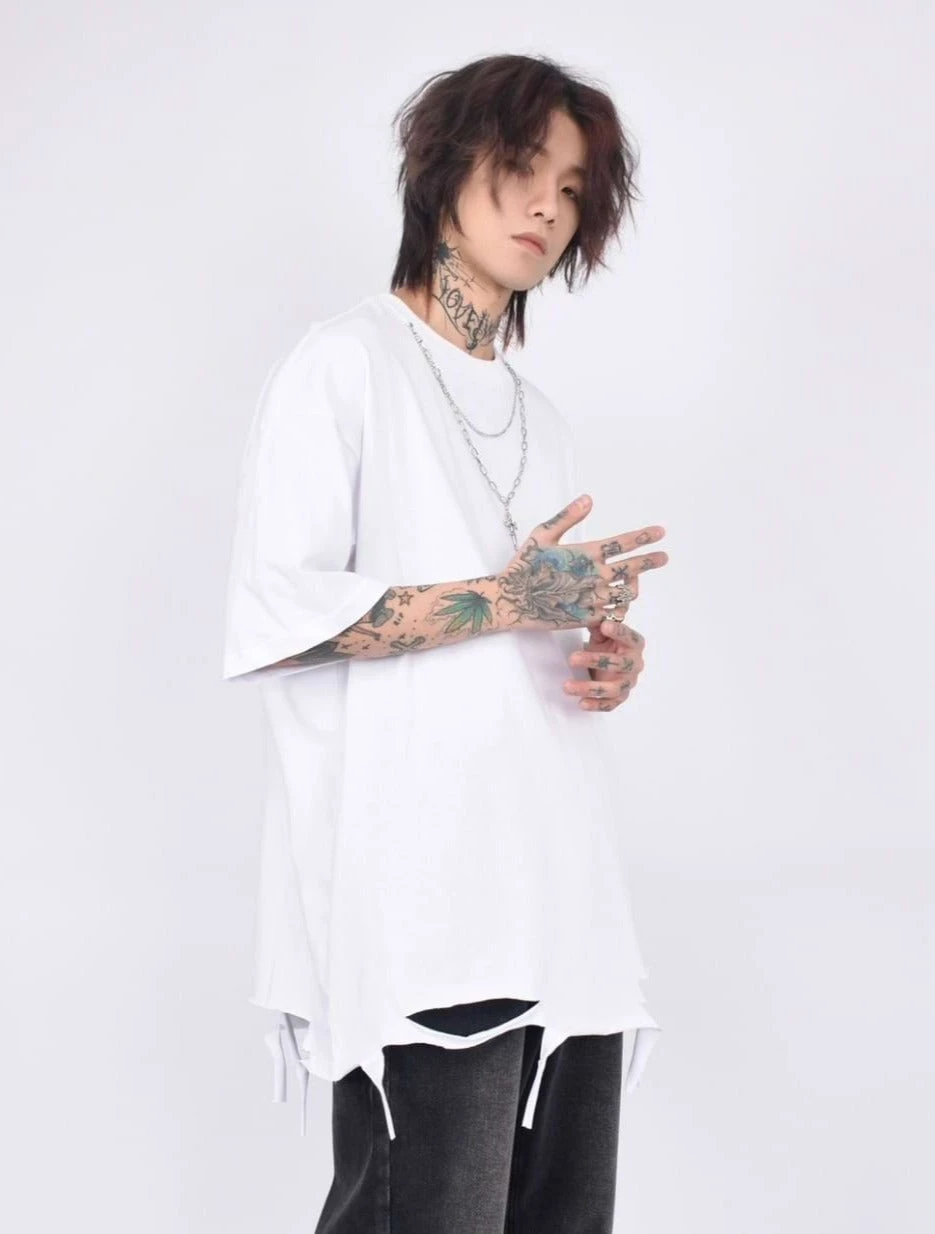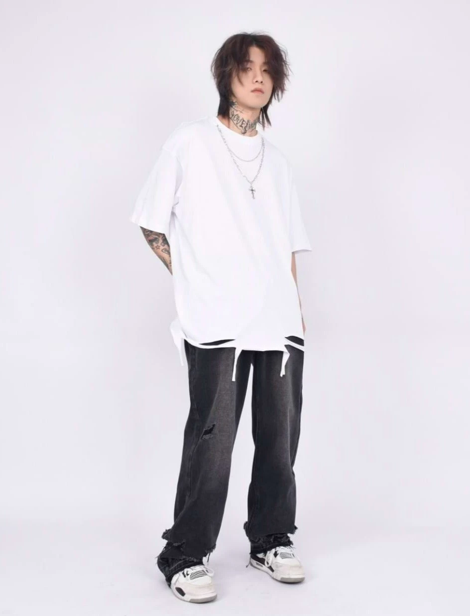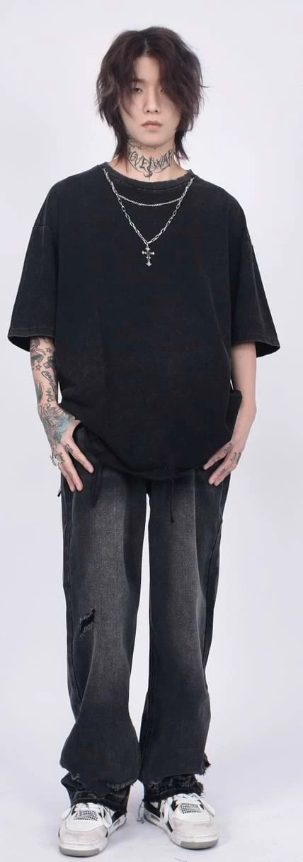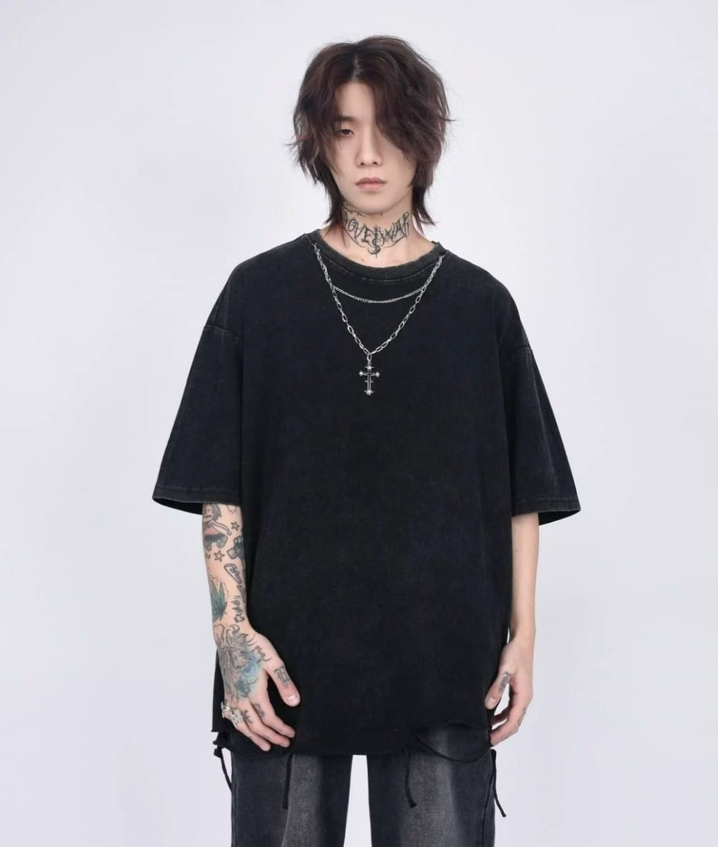 This casual Distressed T-Shirt is perfect for everyday wear. The distressed hem and double layer chain necklace accessory create an effortless, relaxed look. Pair this comfortable T-shirt with jeans for a stylish, put-together look.