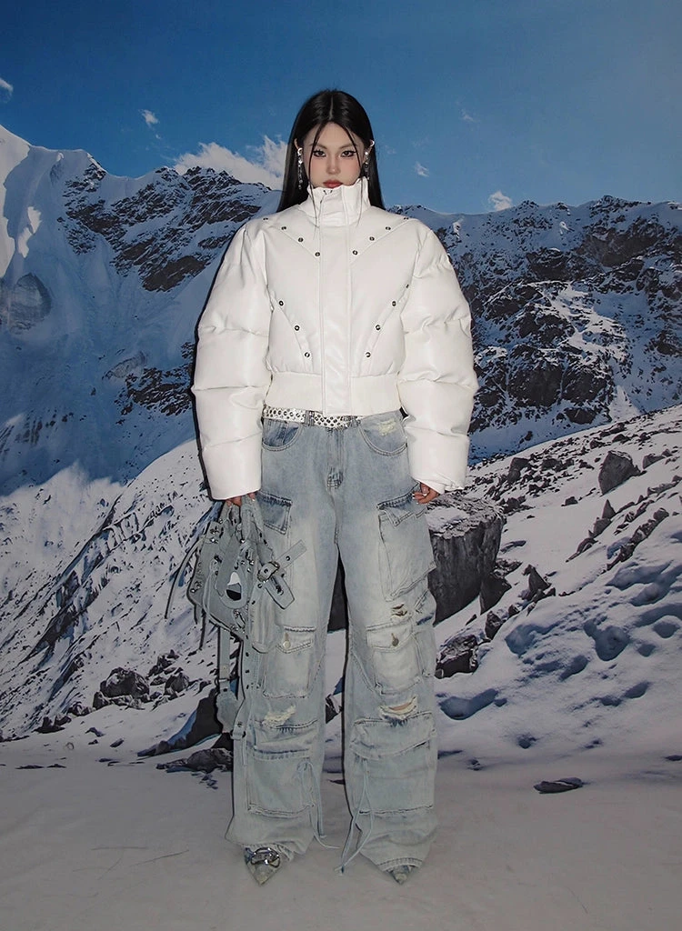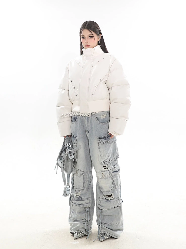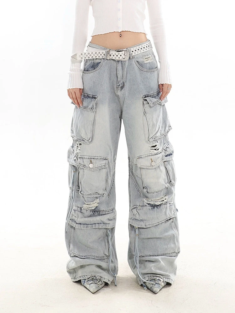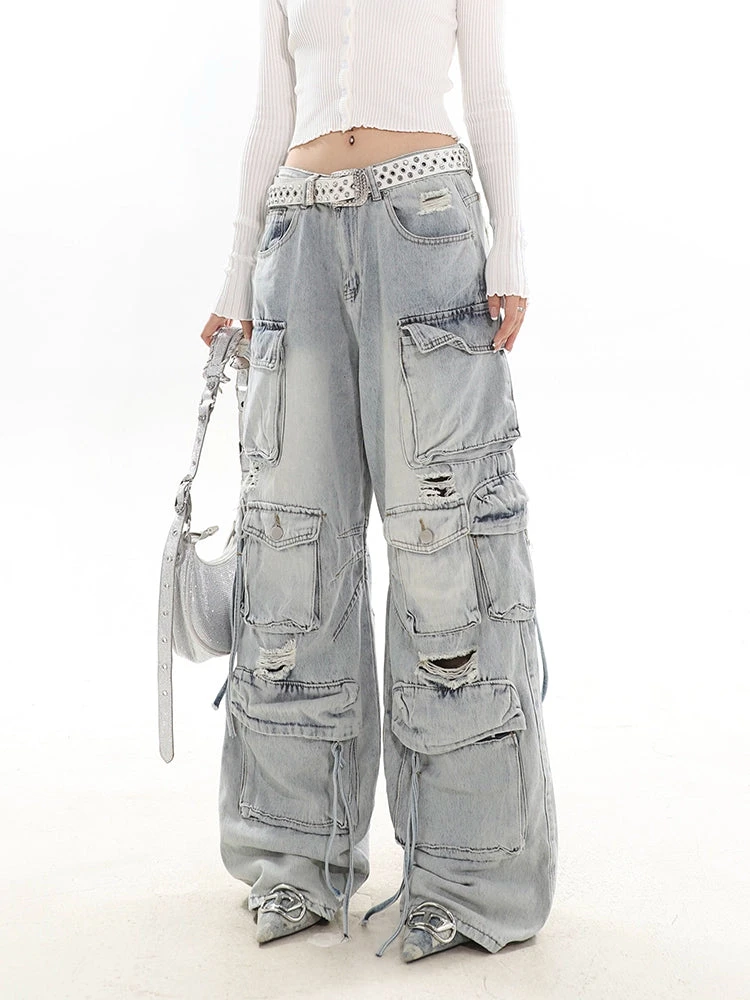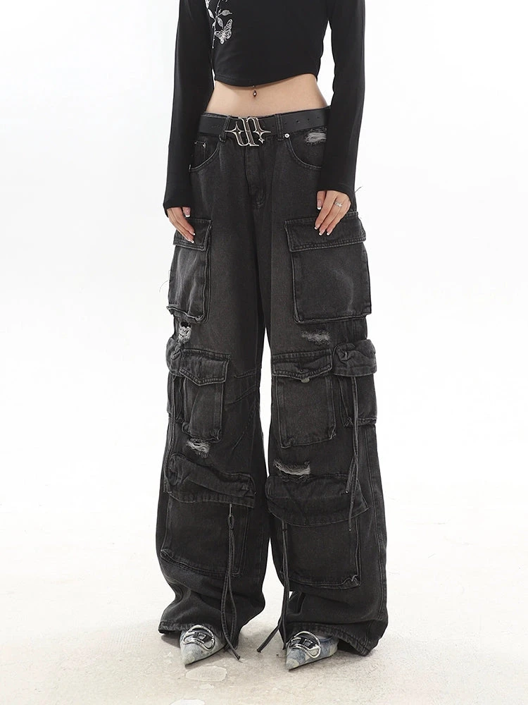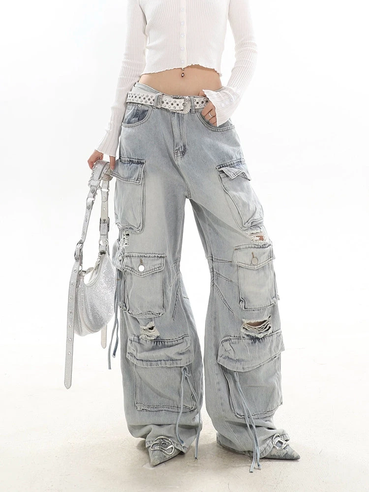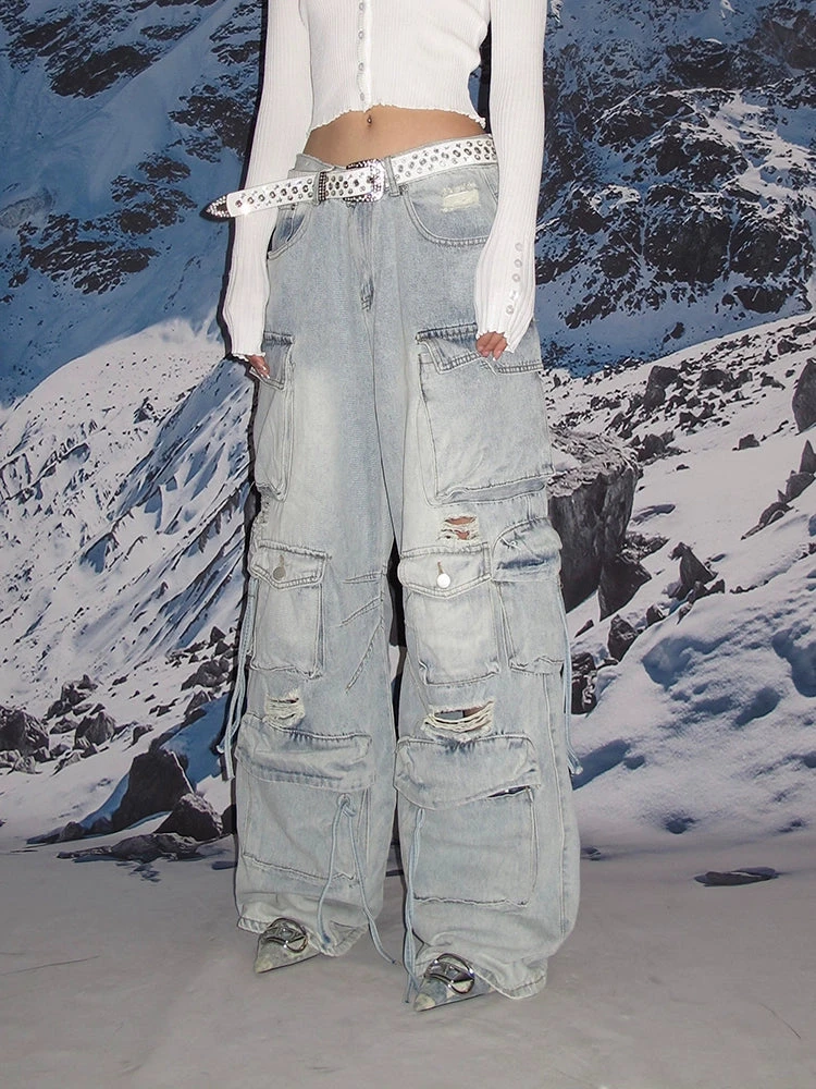 Experience the ultimate blend of streetwise flair and classic comfort with our Distressed Wide-Leg Denim Cargo Pants.