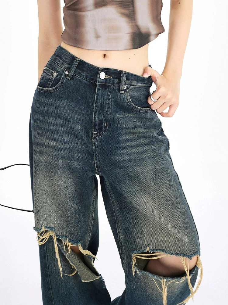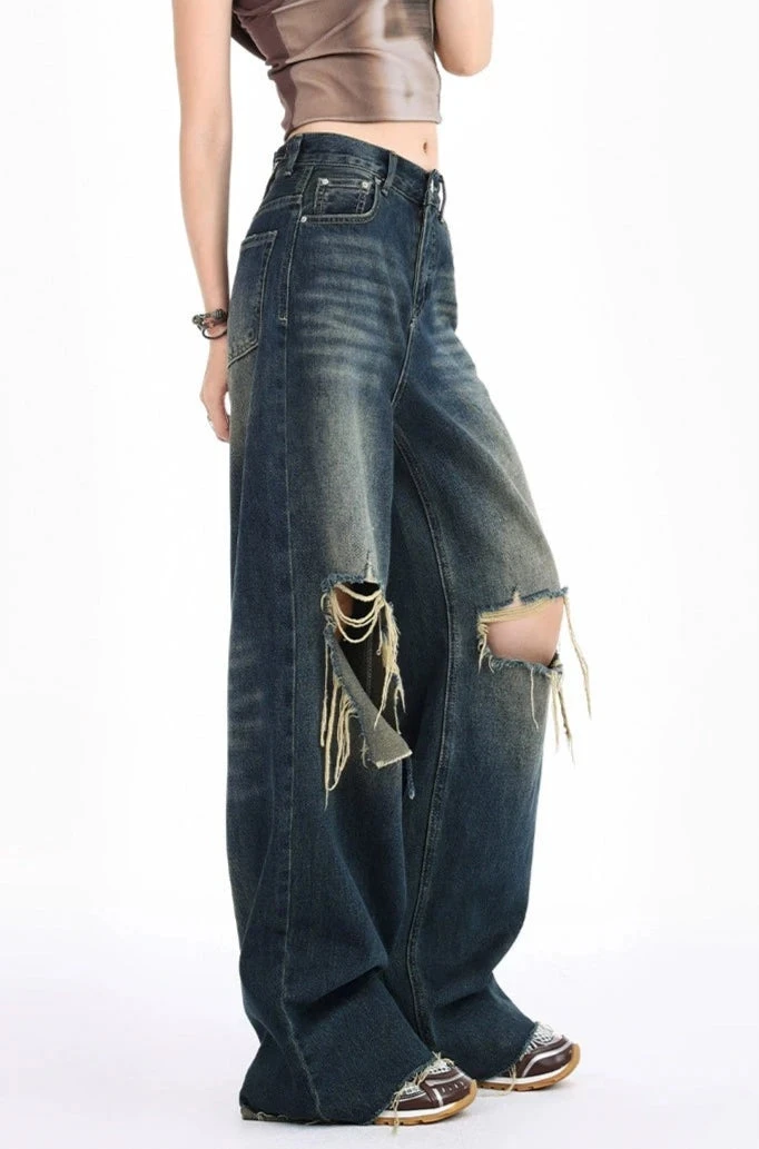 Capture the essence of edgy sophistication with our Distressed Wide-Leg Denim Jeans, perfect for those who love to blend vintage charm with modern allure.