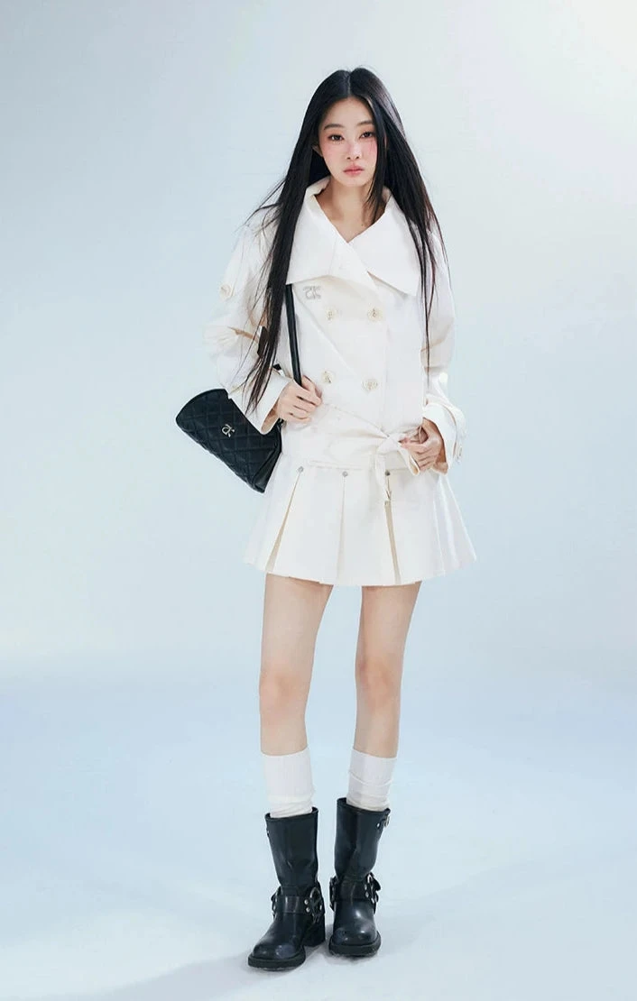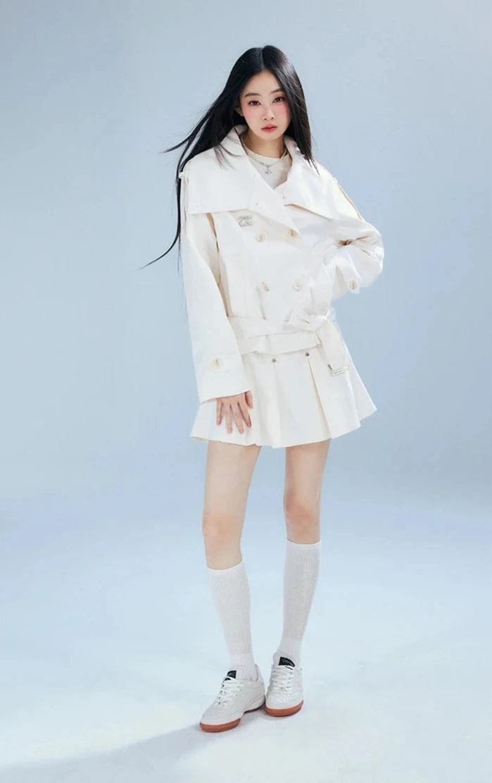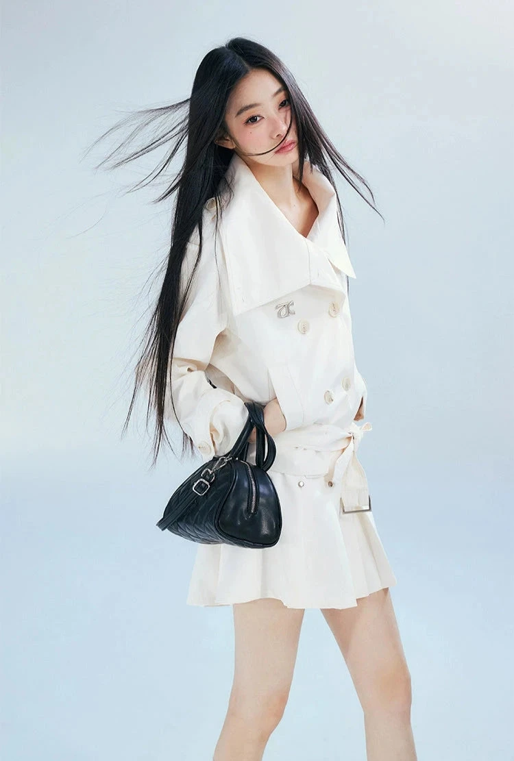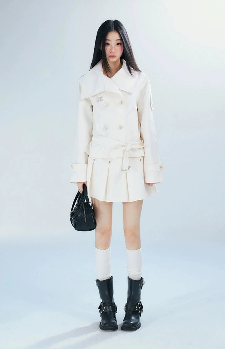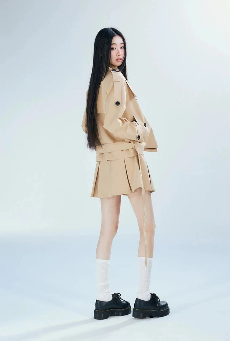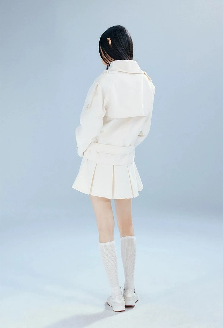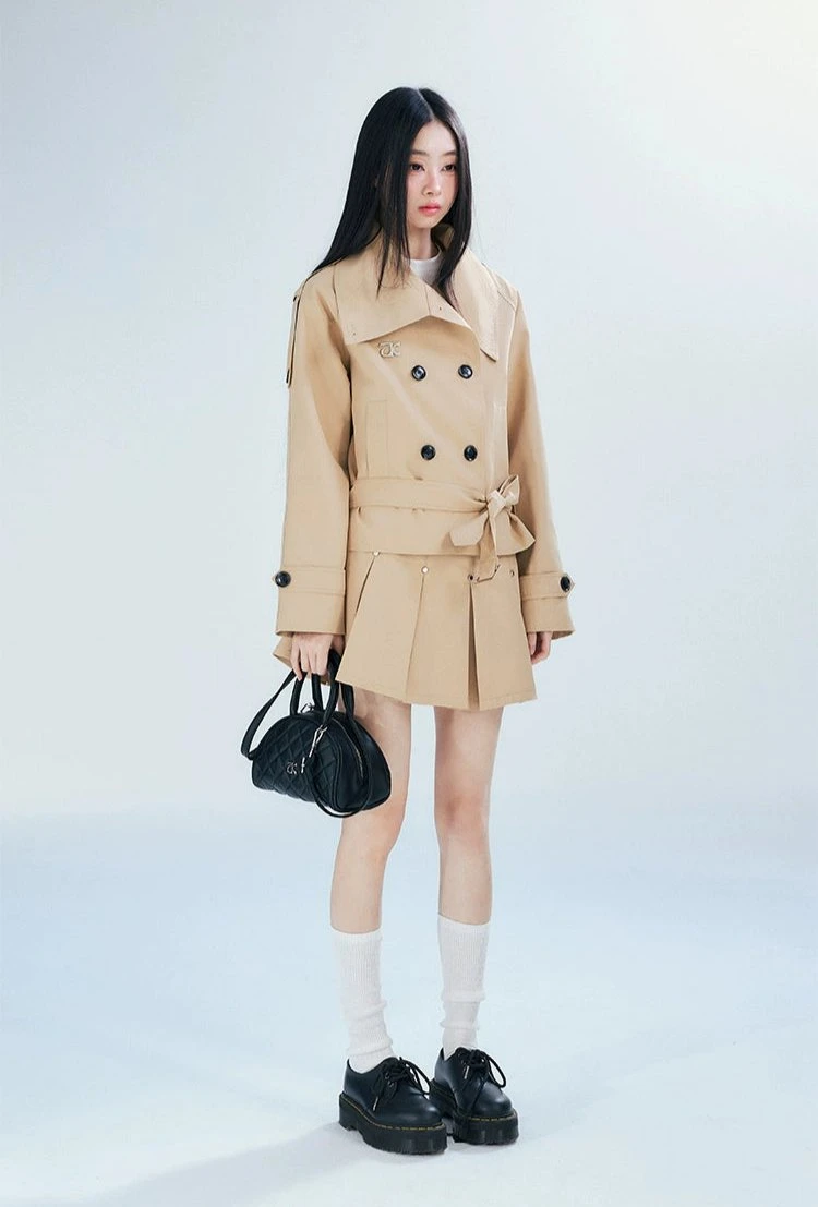 Meticulously crafted from a soft, comfortable fabric, this trench coat sports a double-breasted front and a dynamic cropped silhouette. The chic khaki shade and pleated detailing add a touch of sophistication and texture, ensuring a nonchalant yet professional demeanor.