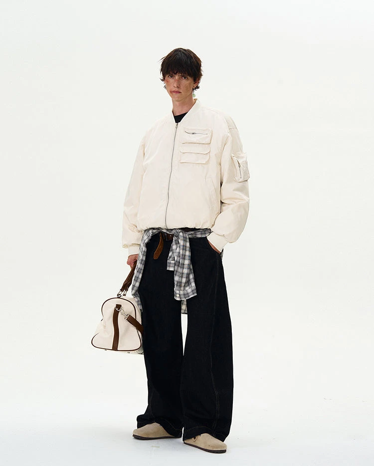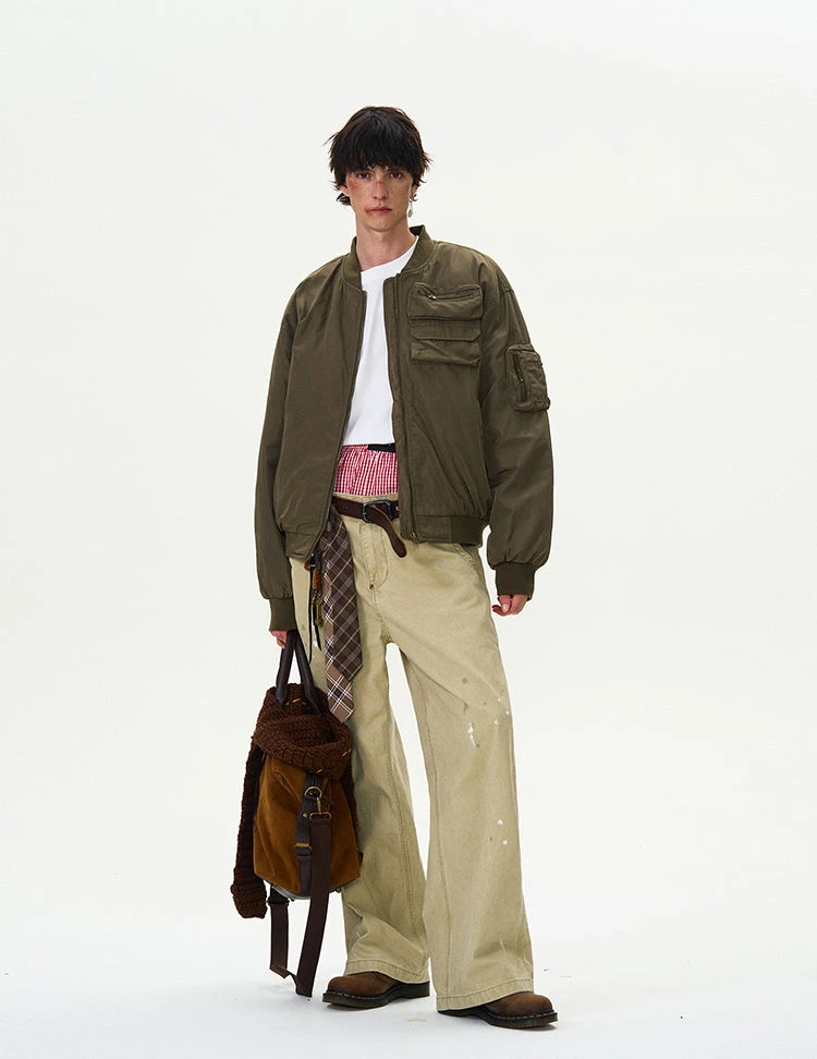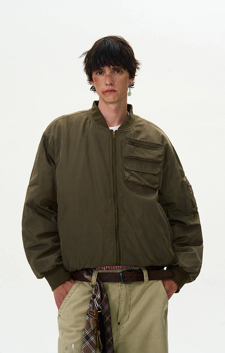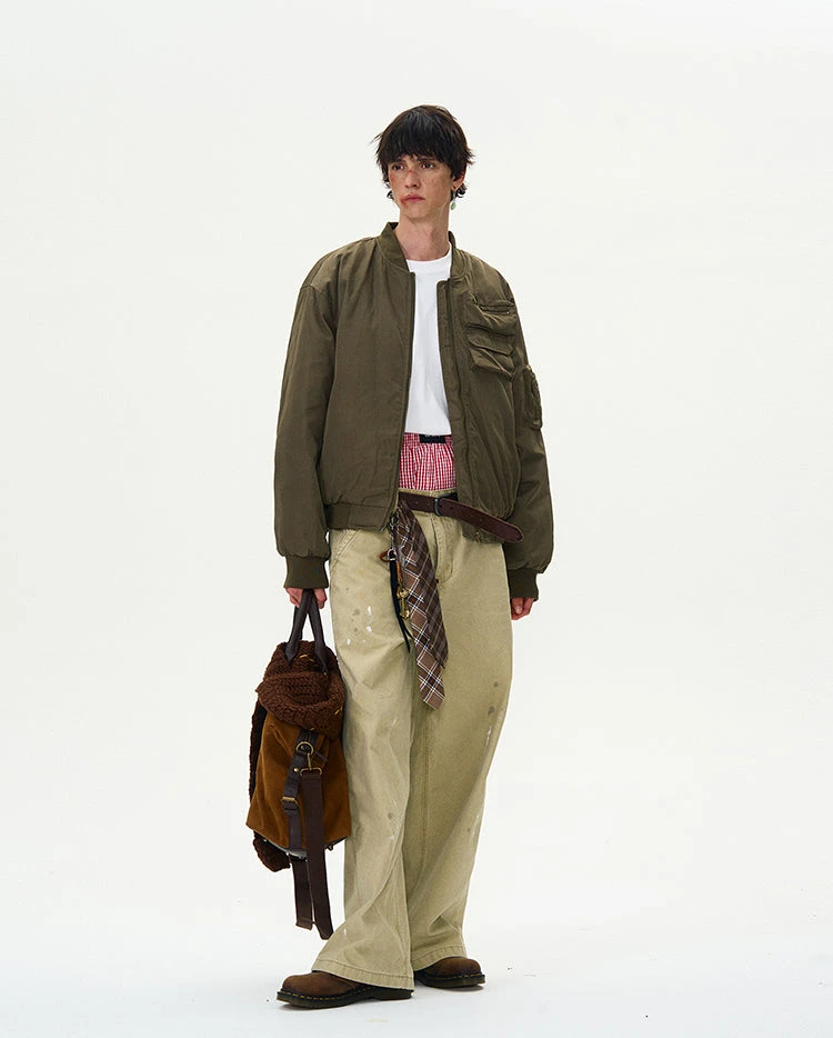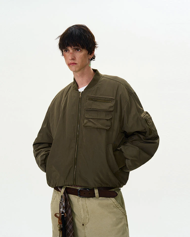 A classic bomber silhouette with an oversized drop-shoulder fit, this jacket blends vintage military aesthetics with everyday wearability.