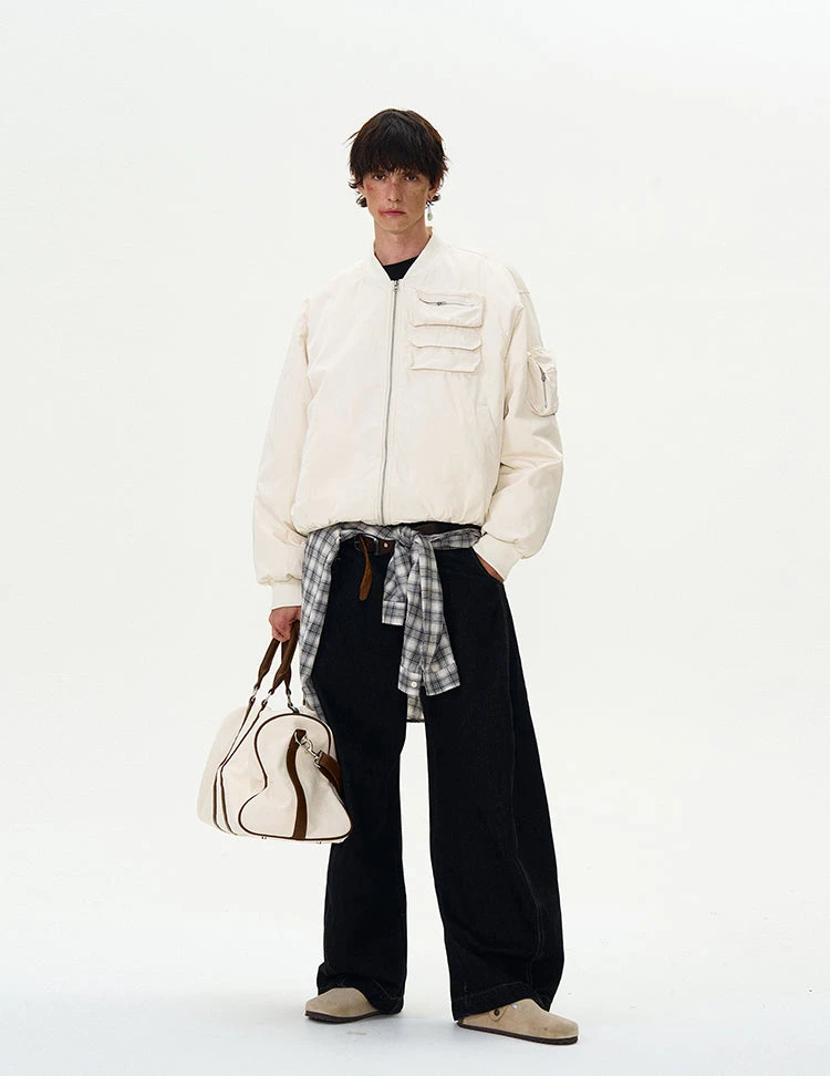 The lightweight duck down fill ensures warmth without bulk, making it an effortless layer for cooler days. Designed with a smooth, matte-textured shell, the jacket features a utility-inspired sleeve zip pocket and a structured baseball collar for a clean yet rugged finish. The cropped, relaxed cut drapes naturally, making it easy to wear over hoodies or lightweight knits.