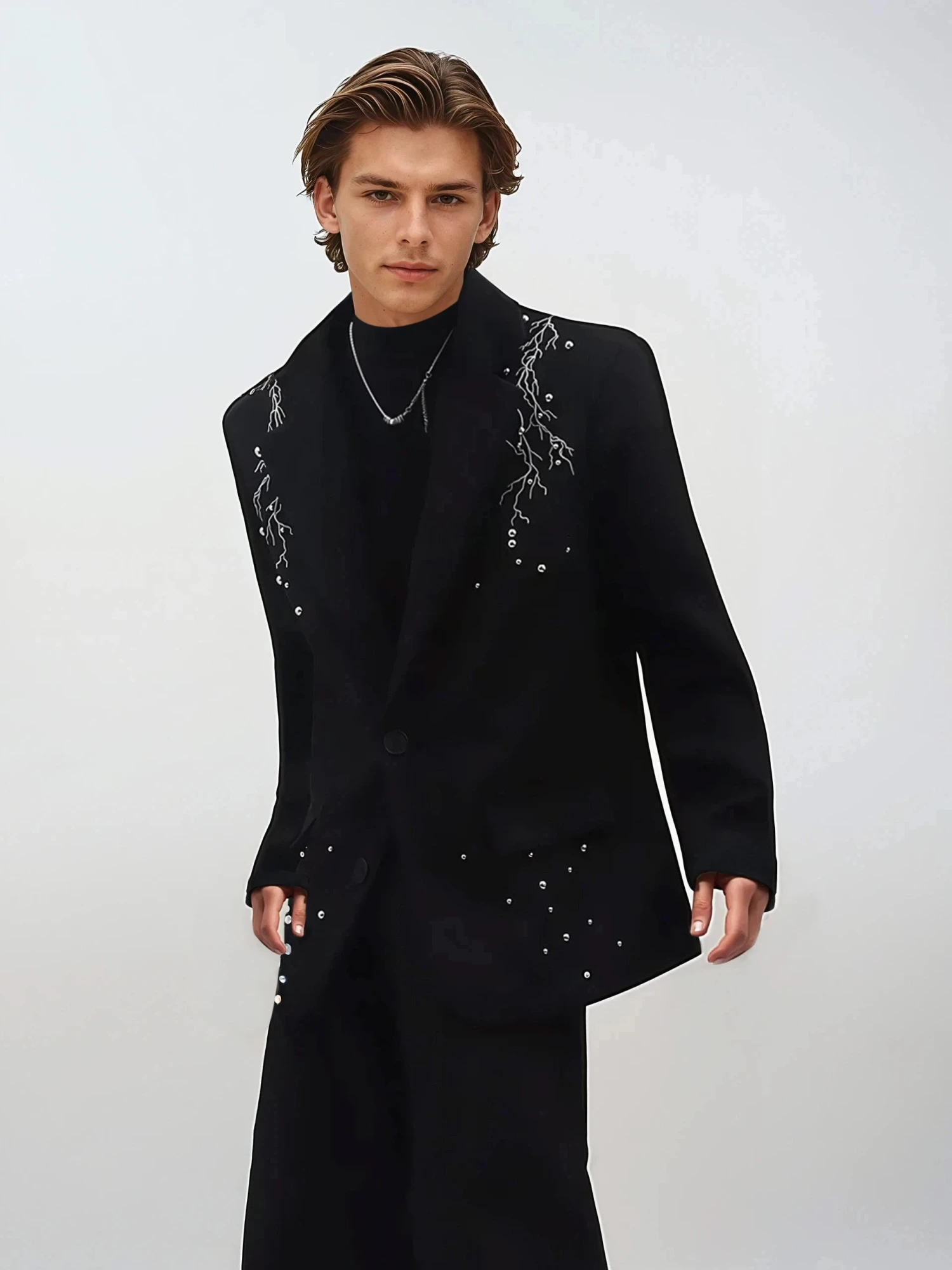 The Embroidered Lightning Detail Blazer with Stud Accents delivers a sharp look with unexpected edge, thanks to standout embroidery and metallic stud work that takes this classic silhouette somewhere bolder.