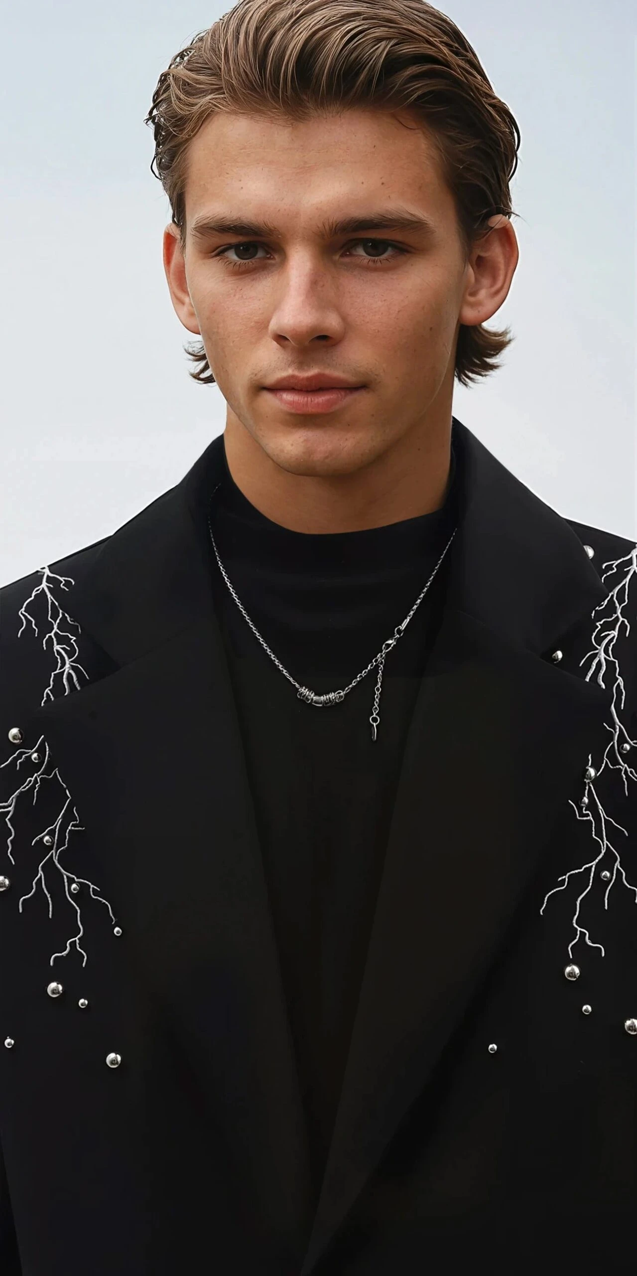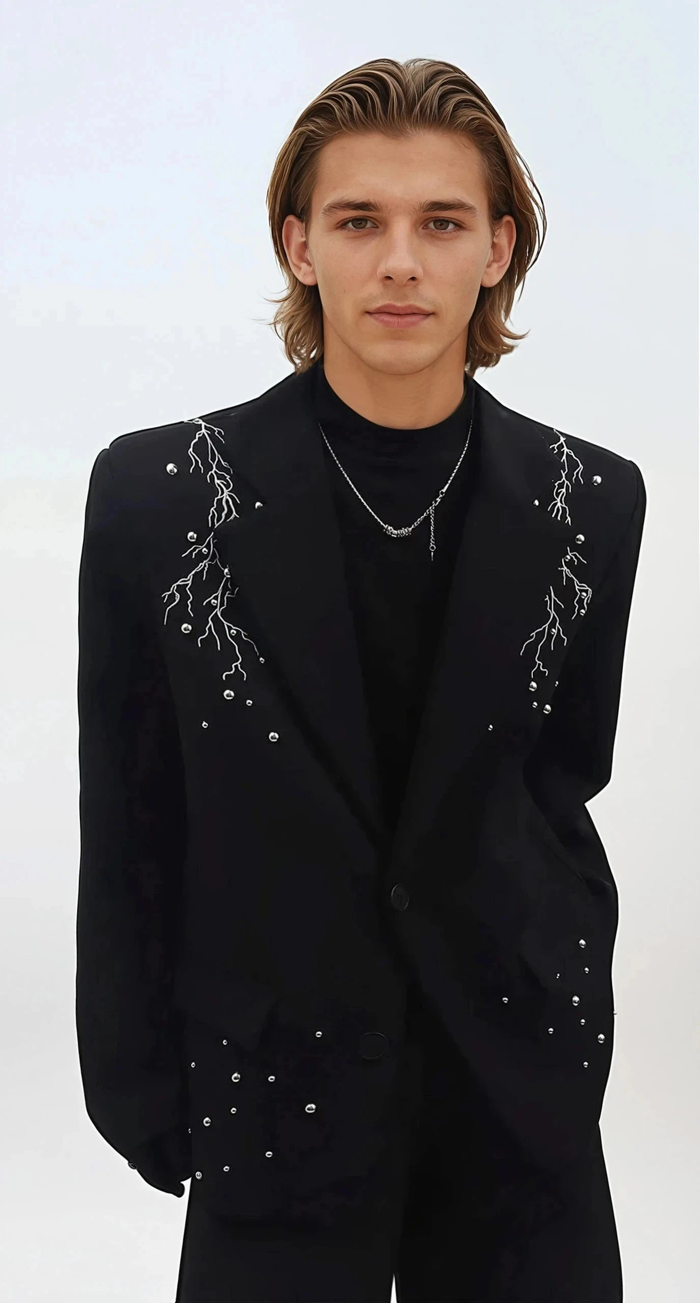 Cut in a tailored fit, this black blazer is made from a medium-weight fabric that holds its structure without feeling stiff. The embroidered lightning motifs across the shoulders and discrete metal stud accents add contrast and attitude while staying refined. It’s a go-to piece whether you’re dressing up for an evening event or aiming for a standout layered look day-to-day.
