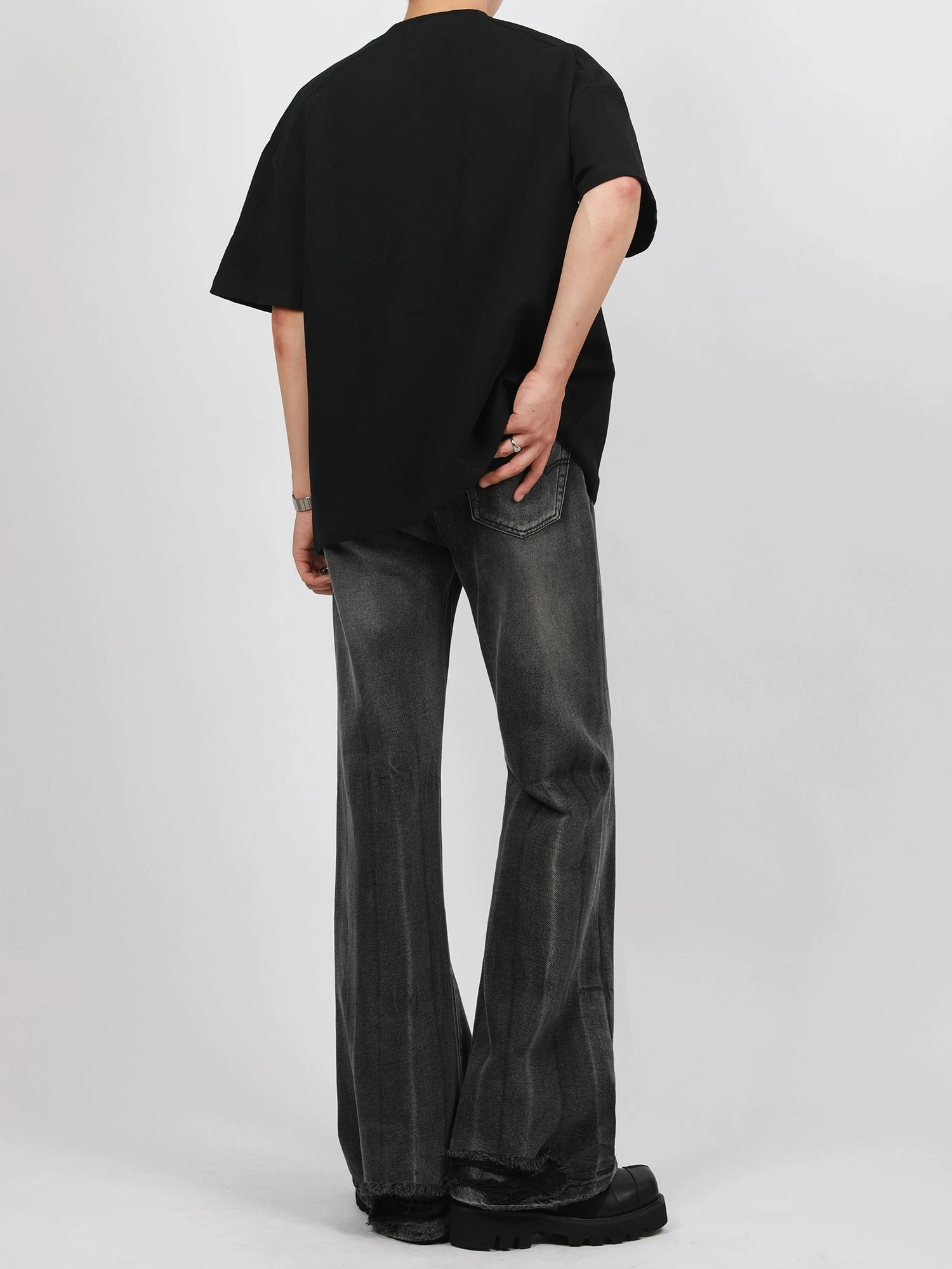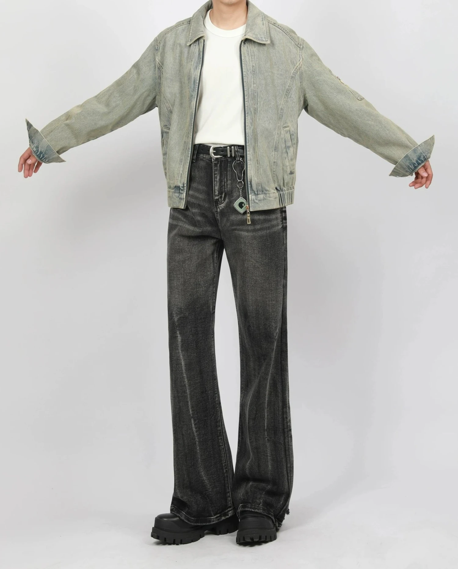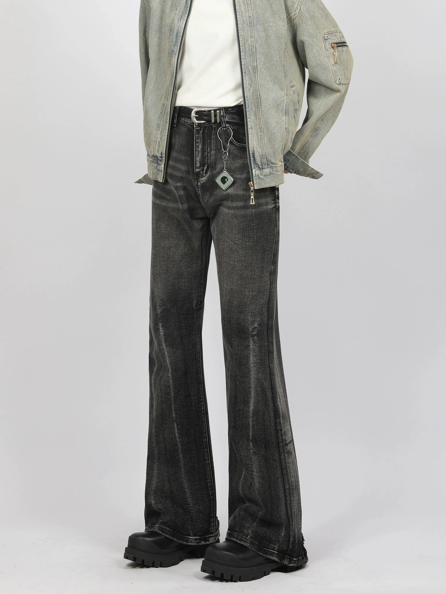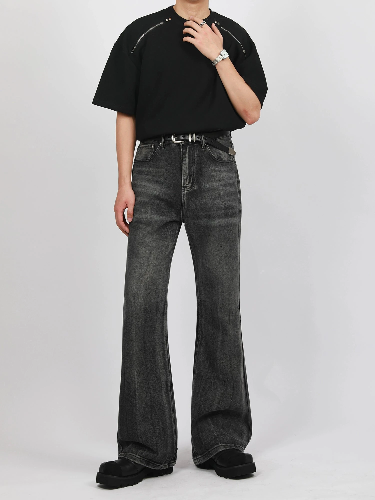 Crafted from high-quality cotton bomb denim, these semi-flare jeans feature a tasteful faded design, high waist, and subtle distressed details, forging a balance between retro and refined. The conventional thickness ensures year-round wearability, while the zipper closure adds a touch of convenience.