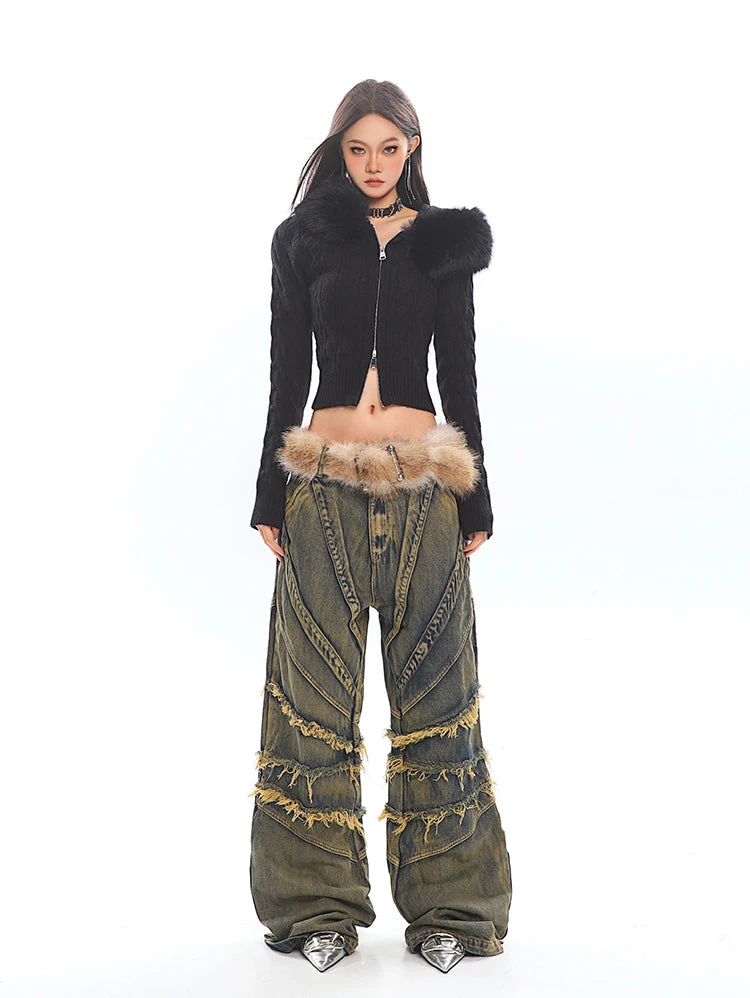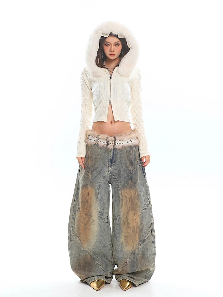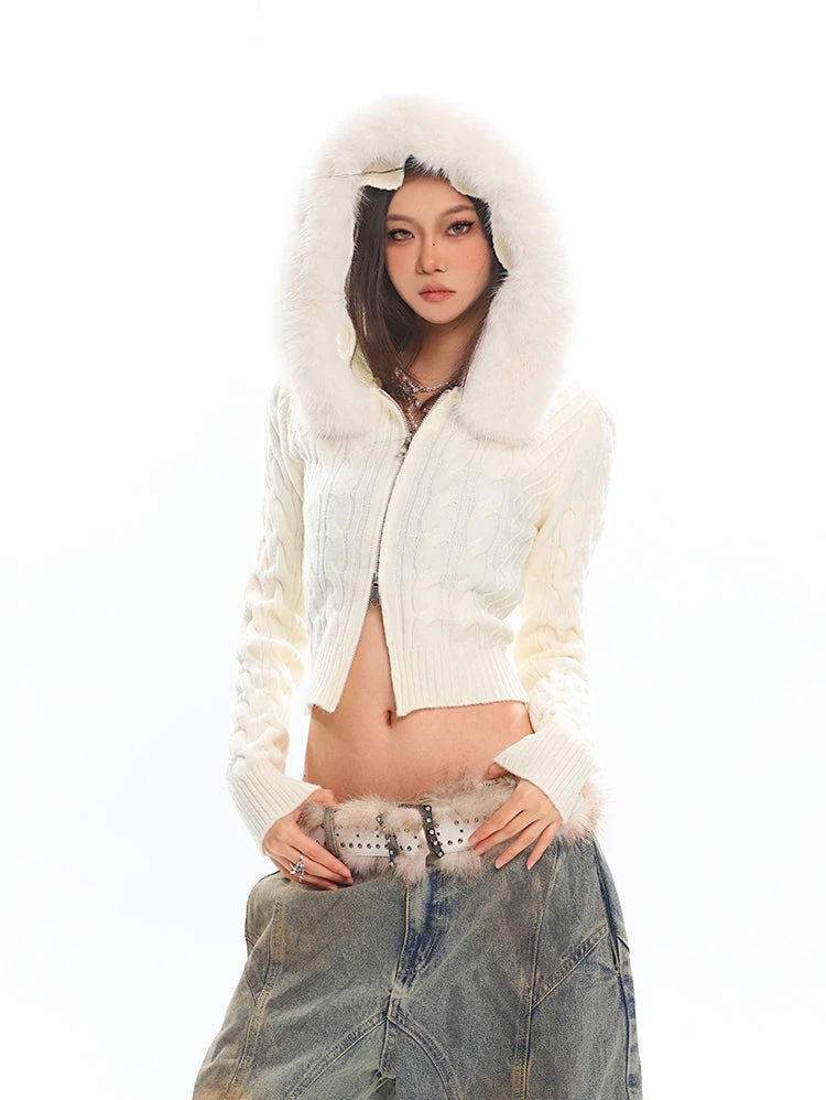 Stay effortlessly cool with the Faux Fur Hoodie Cable Knit Cropped Zip Jacket, a perfect mix of edgy and chic elements that elevate your wardrobe.