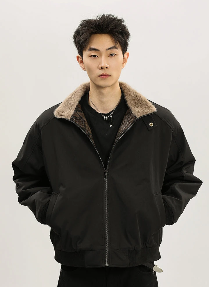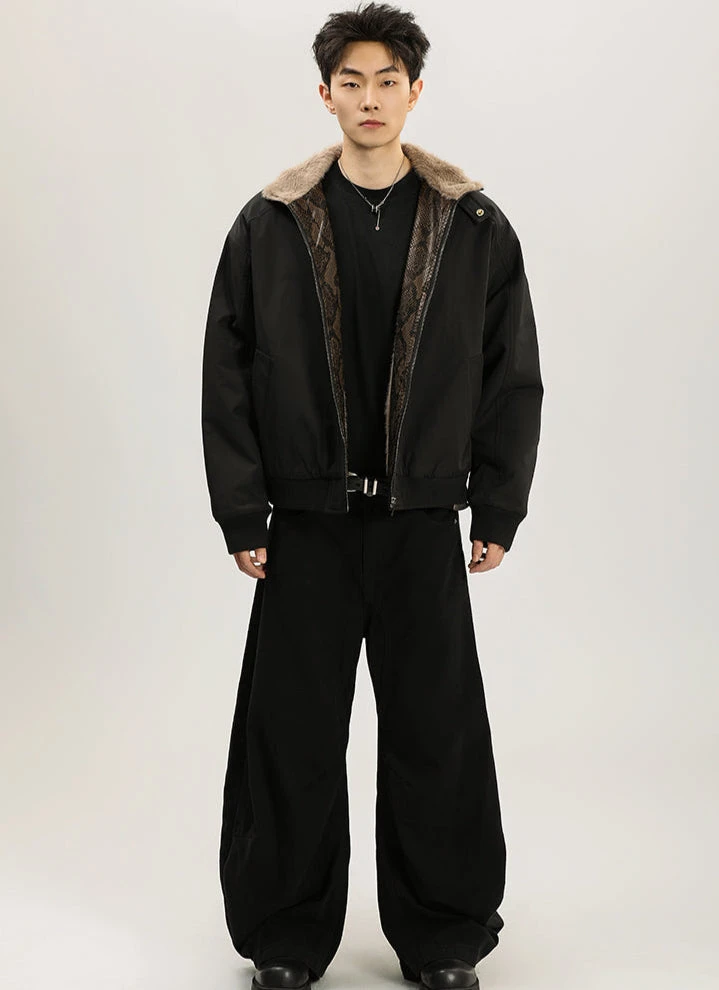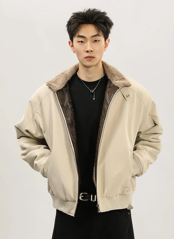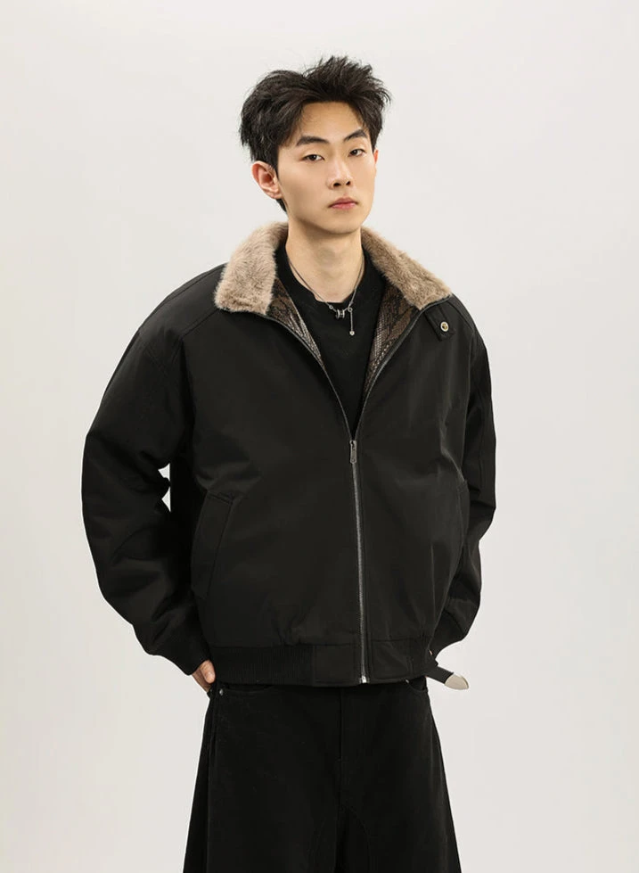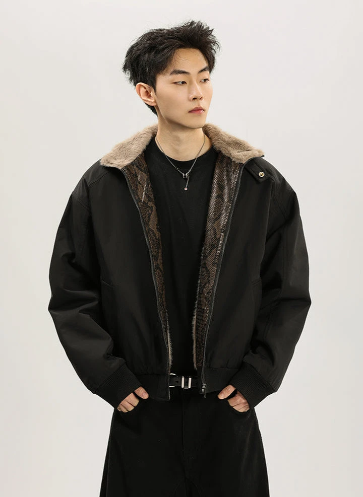 The standout snakeskin-inspired trim along the zip adds a unique touch, while the plush faux fur lining ensures next-level warmth and comfort. Crafted for those who appreciate sleek aesthetics with a twist, the jacket boasts a short bomber cut, combining a structured yet relaxed fit. The thick yet lightweight construction offers warmth without compromise, making it a versatile piece for chilly weather. With its stand-up collar and smooth exterior, it’s as practical as it is stylish.