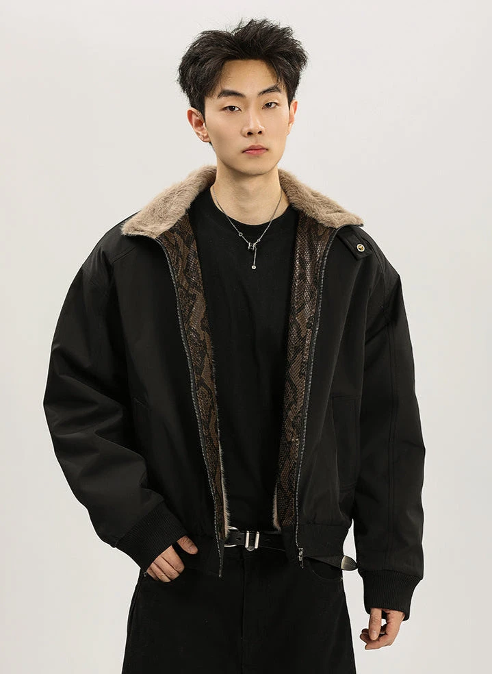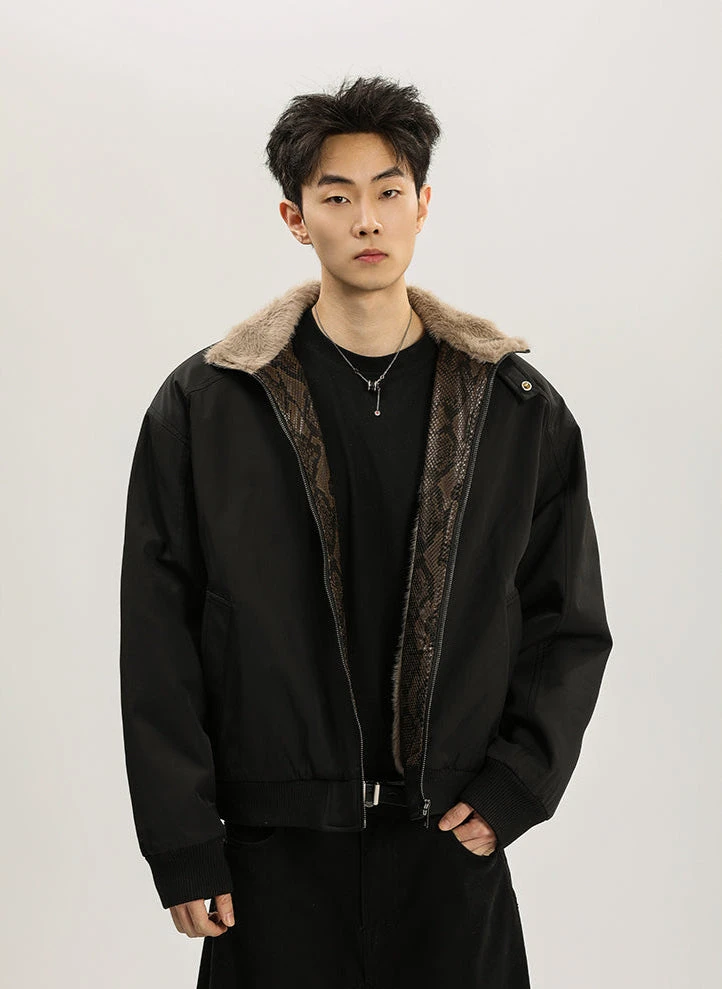 Striking the perfect balance between bold design and cozy functionality, this Faux Fur Lined Bomber Jacket with Snakeskin Detail exudes effortless style with an edge.
