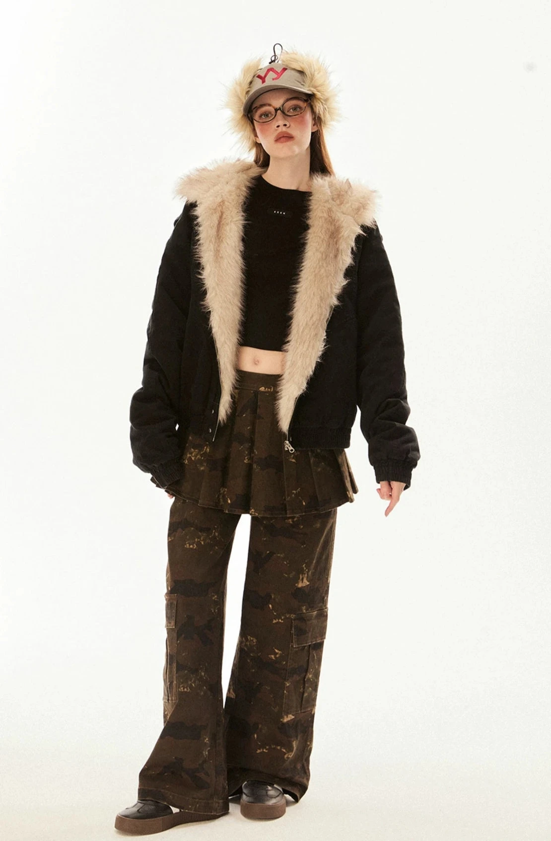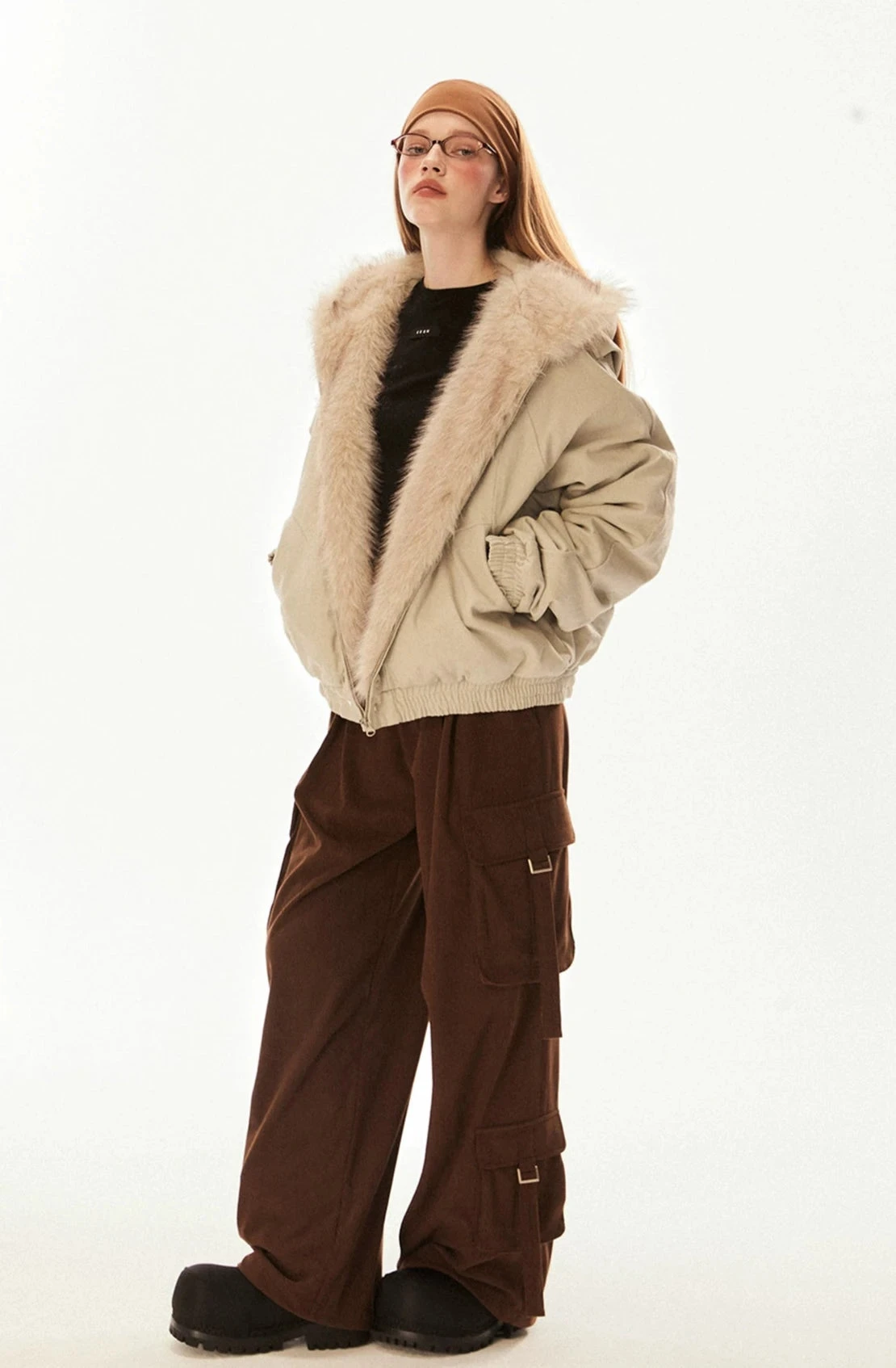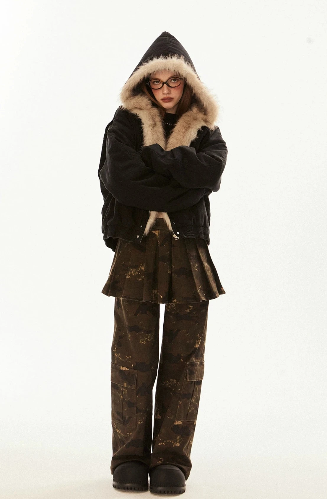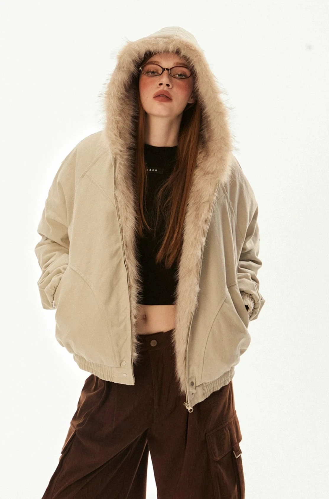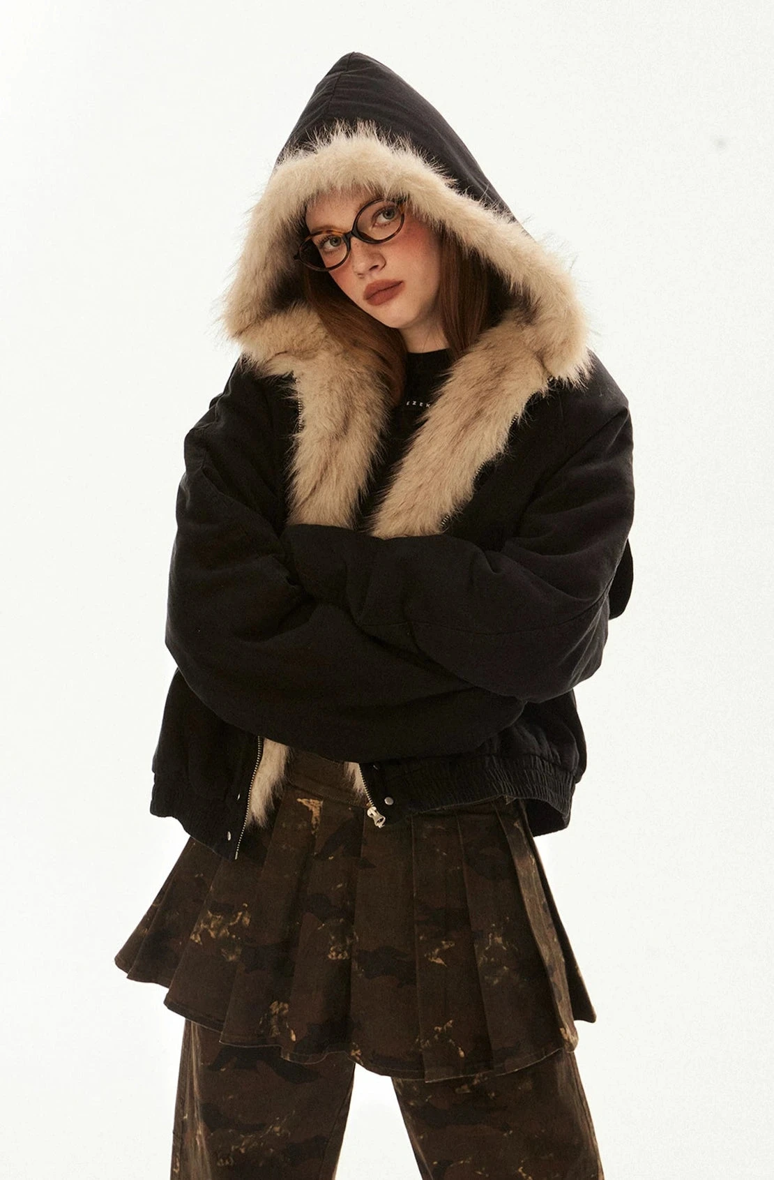 Crafted from a quality blend of materials, this hooded jacket boasts a luxuriously soft faux fur lining for added warmth. A solid color design with a zippered front, coupled with an elastic hem, ensures both comfort and an edgy, street-inspired aesthetic. The loose fit and long sleeves of this piece underscore its nonchalant vibe. Perfectly paired with high-waisted trousers or over a sleek dress, this versatile jacket seamlessly transitions from daytime explore to evening escapades. Effortlessly infuse a touch of moody sophistication into your wardrobe, exuding confidence without saying a word.