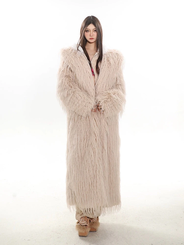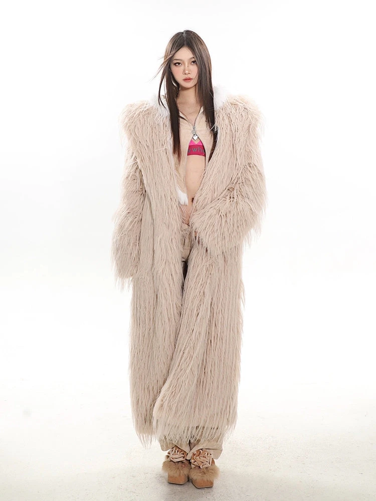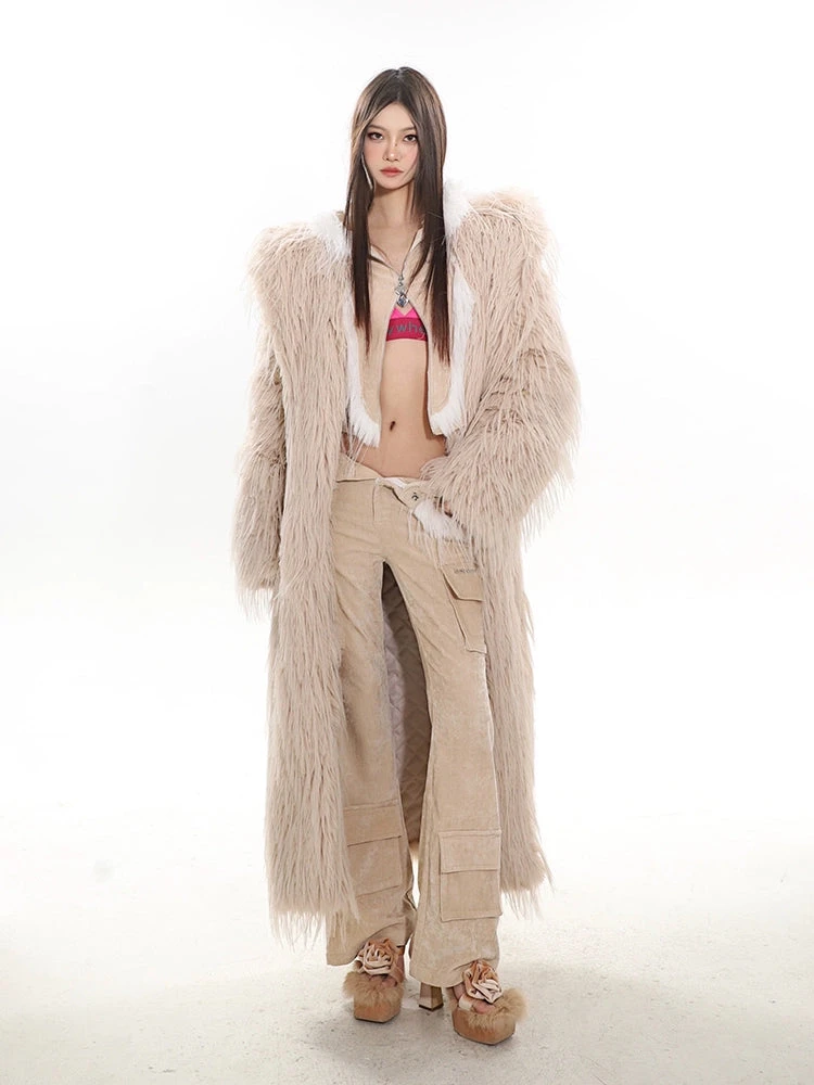 Crafted with meticulous attention to detail, this coat features a luxurious faux fur texture and a cozy hood, marrying elegance with practical warmth. Its longline silhouette ensures full coverage, while the soft apricot hue adds a touch of sophistication to any outfit.