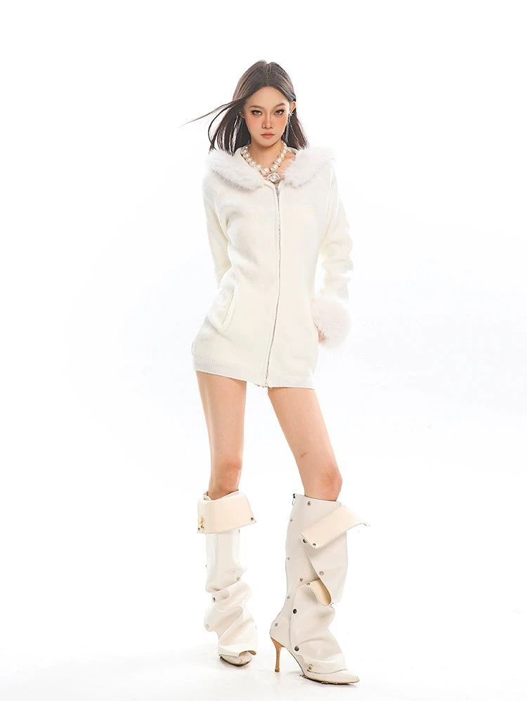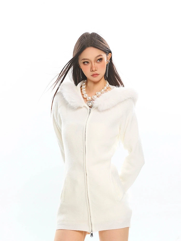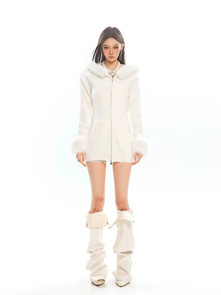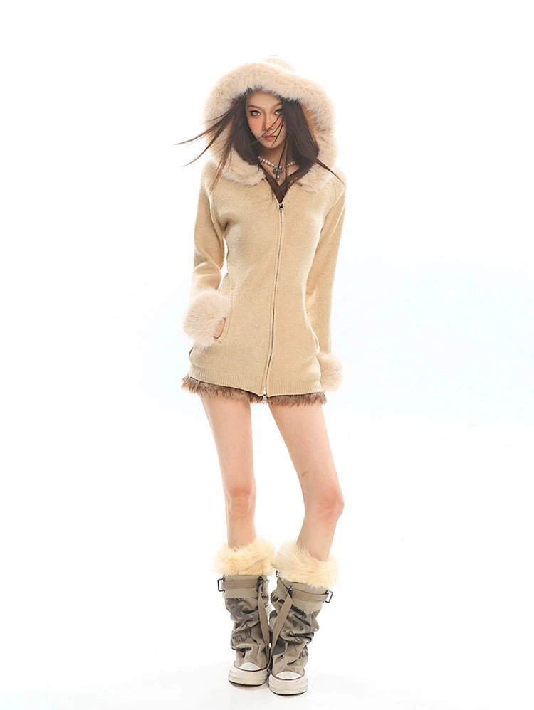Embrace effortless chic with our Faux Fur Trim Hooded Zip-Up Knit Jacket, a must-have for the transitional weather.